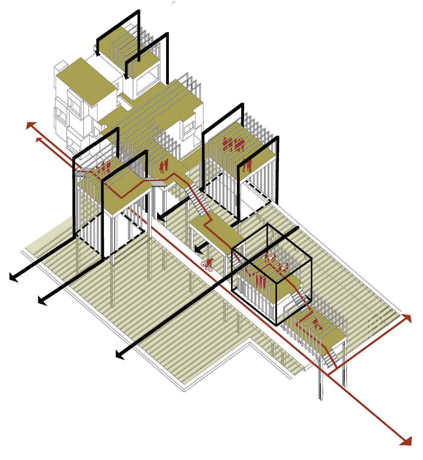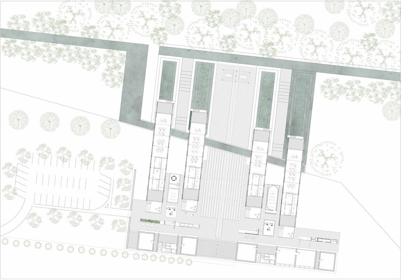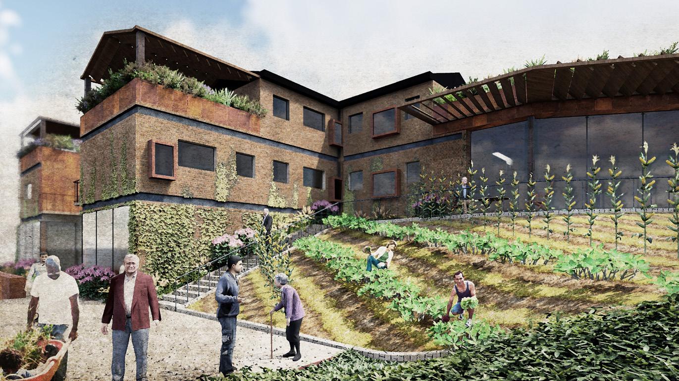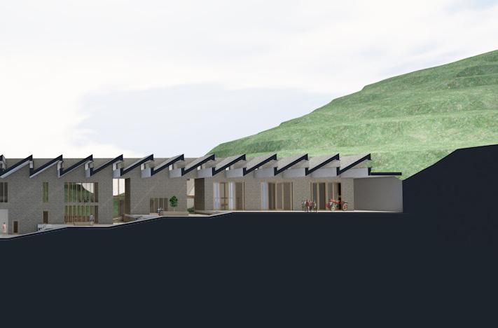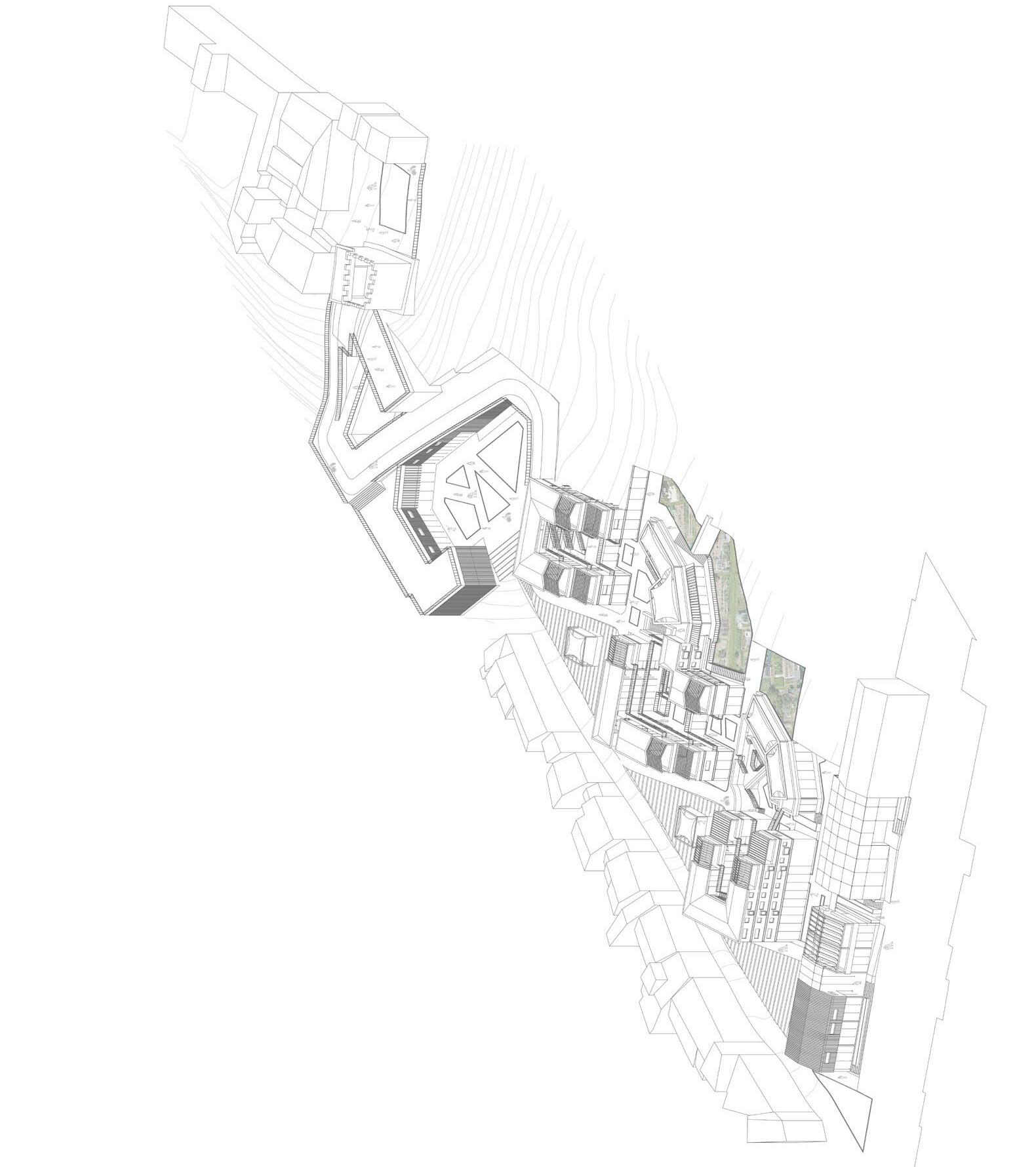 The inclined urban armature is the core design and is composed of three parts: a horticulture centre, co-housing for older people and a community centre. The building at the base completes the streetscape and is the main driver for therapeutic horticulture. Located along the route is the co-housing for older people which steps up the steep hillside and creates a separation between the street created and the open hilly landscape. The co-housing development engages with the journey up the hillside and opens up a new pathway, creating semi-public spaces which act as a transition zone between the streetscape and the horticulture allotments. These are community spaces where the public can interact with residents.