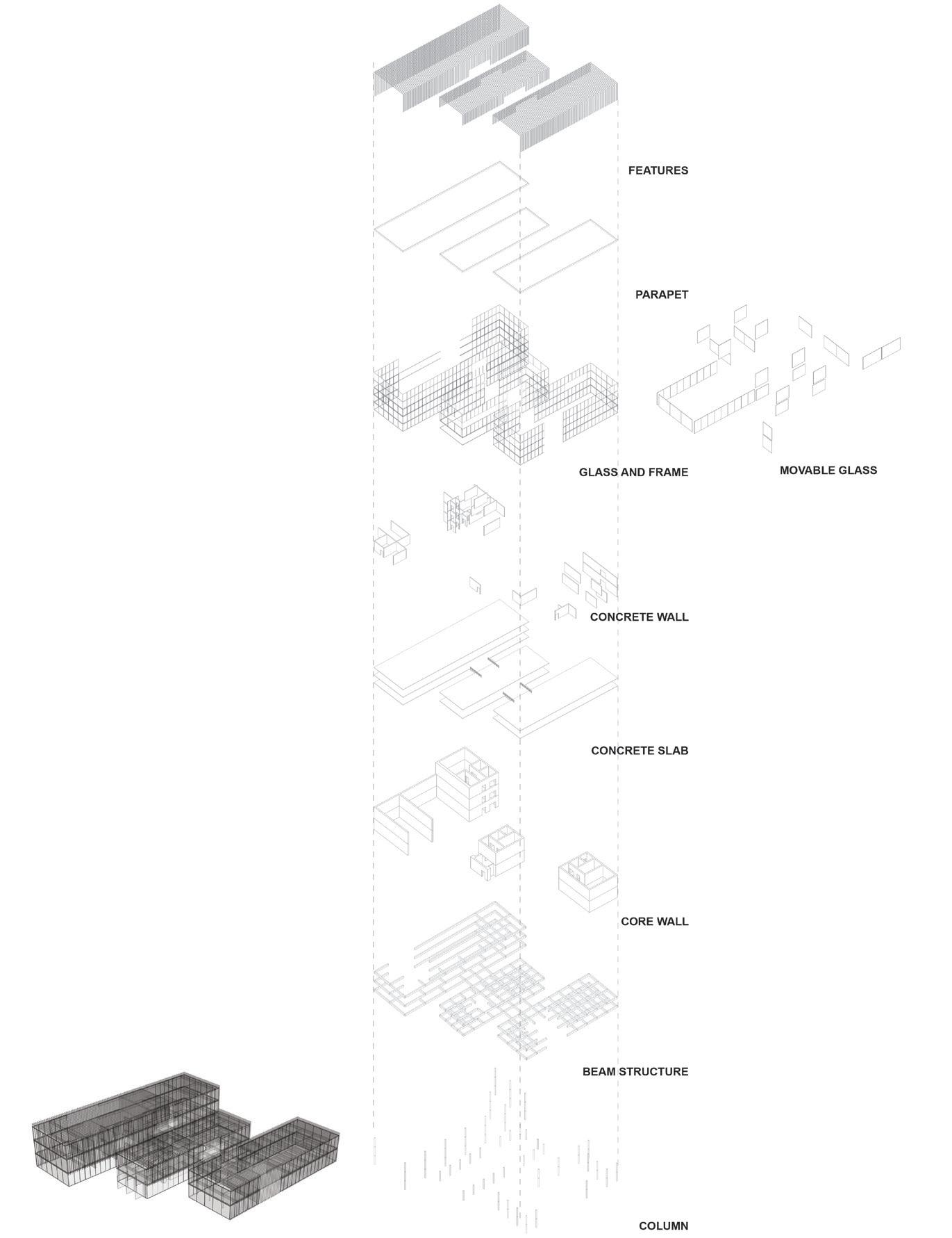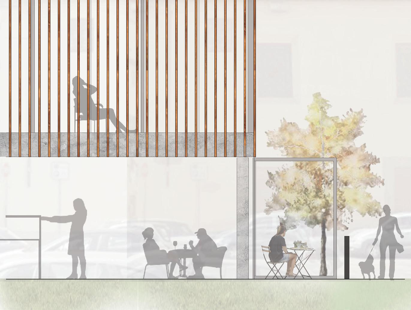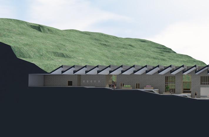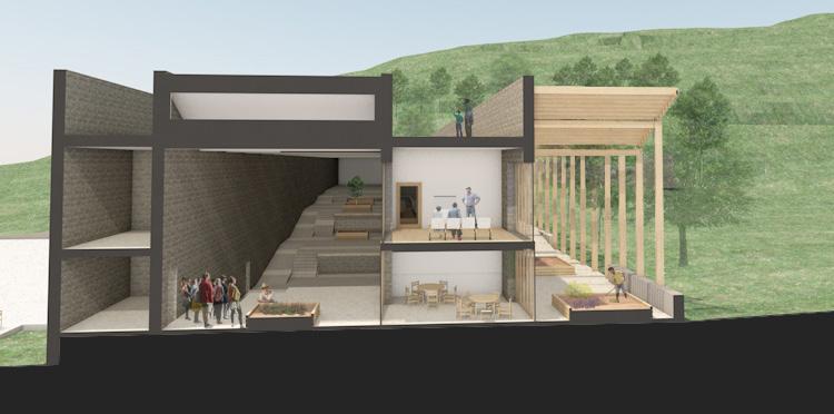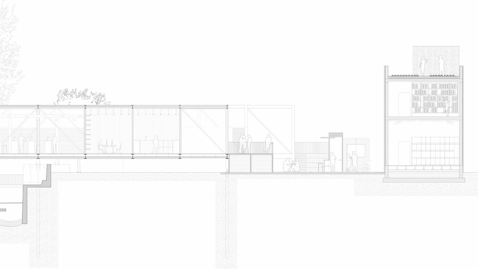 The inclined urban armature is the core design and is composed of three parts: a horticulture centre, co-housing for older people and a community centre. The building at the base completes the streetscape and is the main driver for therapeutic horticulture. Located along the route is the co-housing for older people which steps up the steep hillside and creates a separation between the street created and the open hilly landscape. The co-housing development engages with the journey up the hillside and opens up a new pathway, creating semi-public spaces which act as a transition zone between the streetscape and the horticulture allotments. These are community spaces where the public can interact with residents.