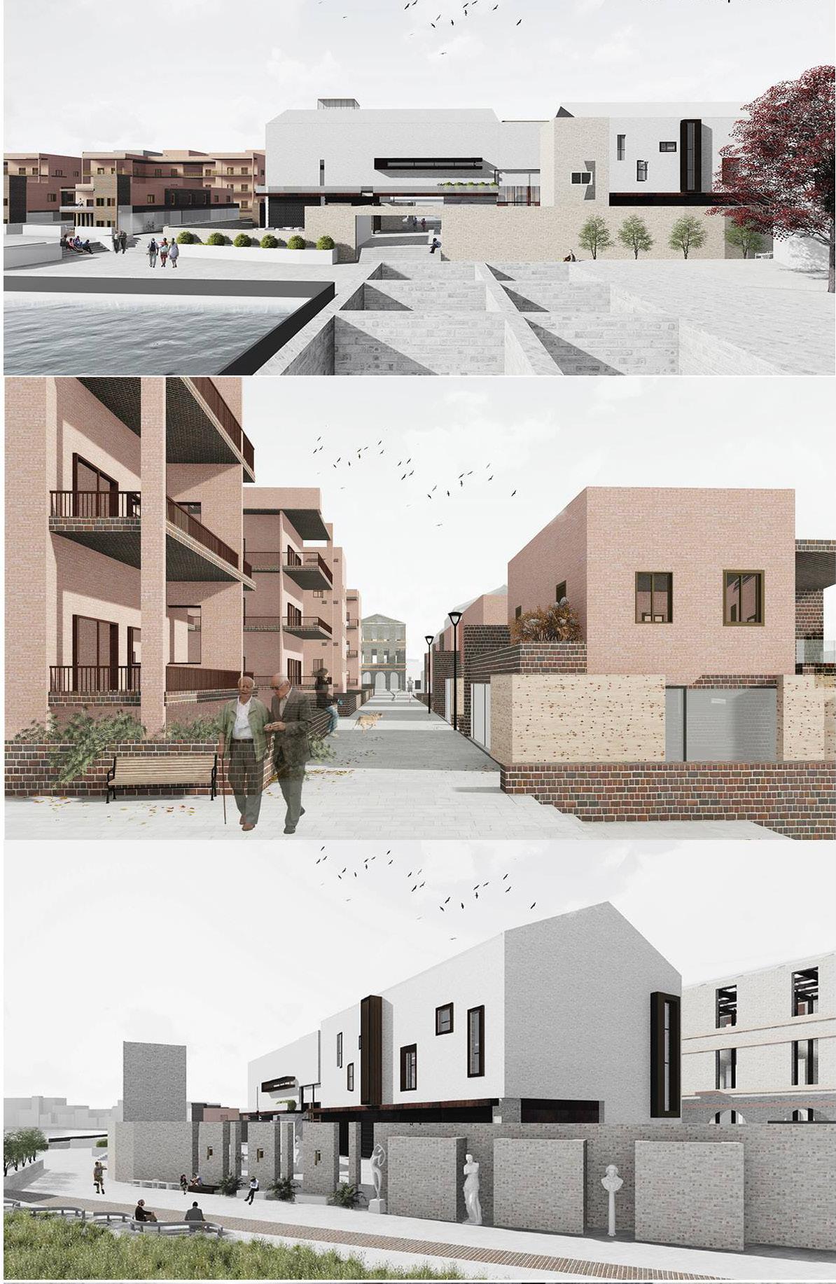 We generate a harmonic and logical sequence upon arriving in the town: a celebration of arrival, leading to a series of rich and clearly connected public spaces and buildings with a clear concern for the heritage and craft based history of the town. Intergenerational public realm with a rich series of topographic conditions and functional opportunities help to encourage emotional and physical well-being in the residents of Montelupo and the surrounding region. e new centre will strategically densify and curate architectural propositions to locate a new gateway into the town, to reintroduce its distinct cultural heritage, to spark new interchange opportunities across all generations, and to promote active and healthy lifestyles.