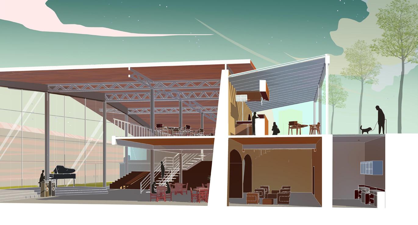 A new housing typology is created to the east of the park, with individual, shared and public vertical gardens which provide a series of social opportunities at di erent scales within a naturalised and topographical landscape.