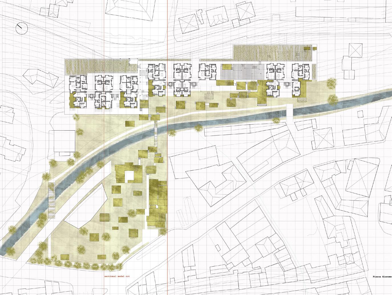 is proposition forms a part of a broader urban masterplan for the town of Montelupo focussing on an important waterside territory on the south side of the river and a revitalisation of the historic Villa Medici Way. e scheme includes green, public and community space, shared between a development of mixed tenure housing and a sports, health and well-being centre. Servant and served functions, spatial separations and points of engagement are all clearly articulated in the creation of a new mixed use building typology for the 21st century Tuscan town.