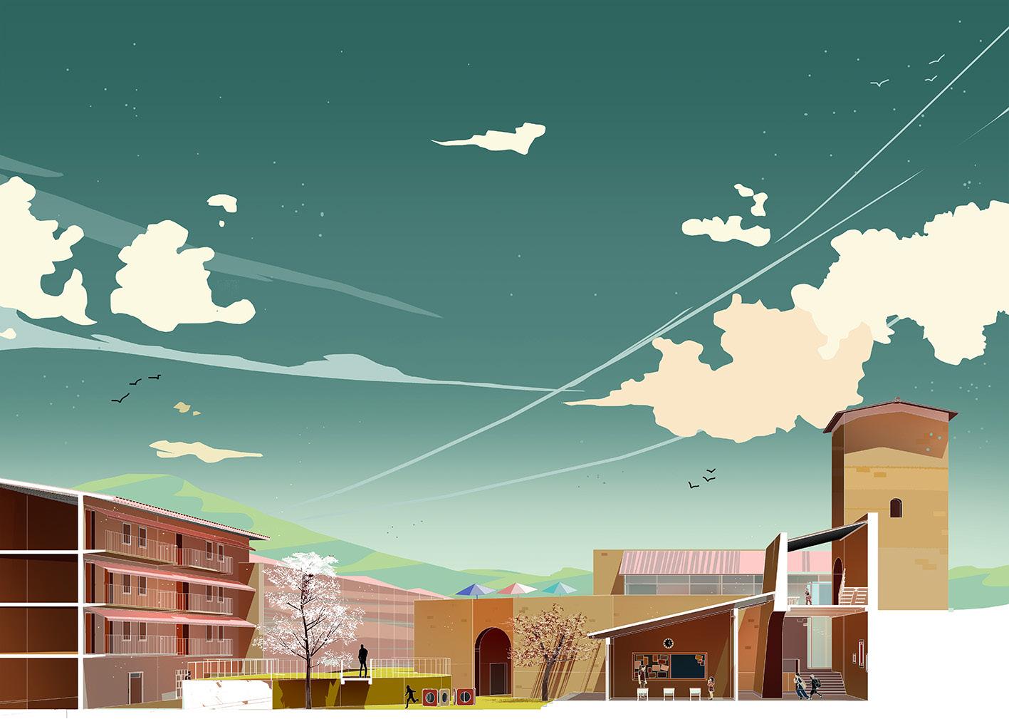 It aims to rede ne the gateway to Montelupo and to provide a stronger sense of arrival, by strengthening the historic axis of urban development and by optimizing old town tra c. is will introduce to the old town a walkable scale by reshaping the relationship between new public space and the old town and to rejuvenate the old town with a high-density integration of human activities.