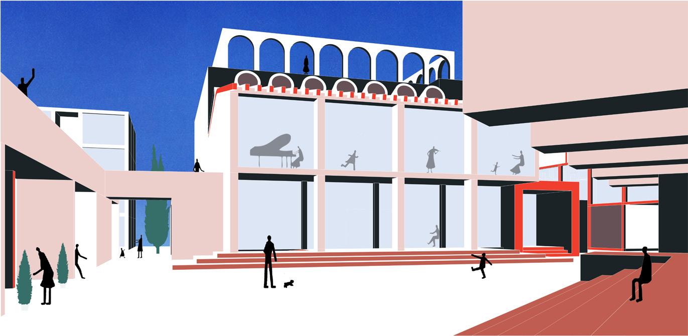 e Dance of Opposites is a project that re-scripts the linkage between the dense cluster of the old town and the fragmented urbanism on the opposite side of the river. It programmatically introduces new tales of art, dance, knowledge, working and living to re-engage the existing older community with the young through a celebration of culture, centering on the theme of productivity through learning and working. It forms itself as a fragmented urban block of new building typologies situated at a key moment of important physical and visual connection between the old and new town, while orientating to the significant-axis towards the imposing Villa Medici.
