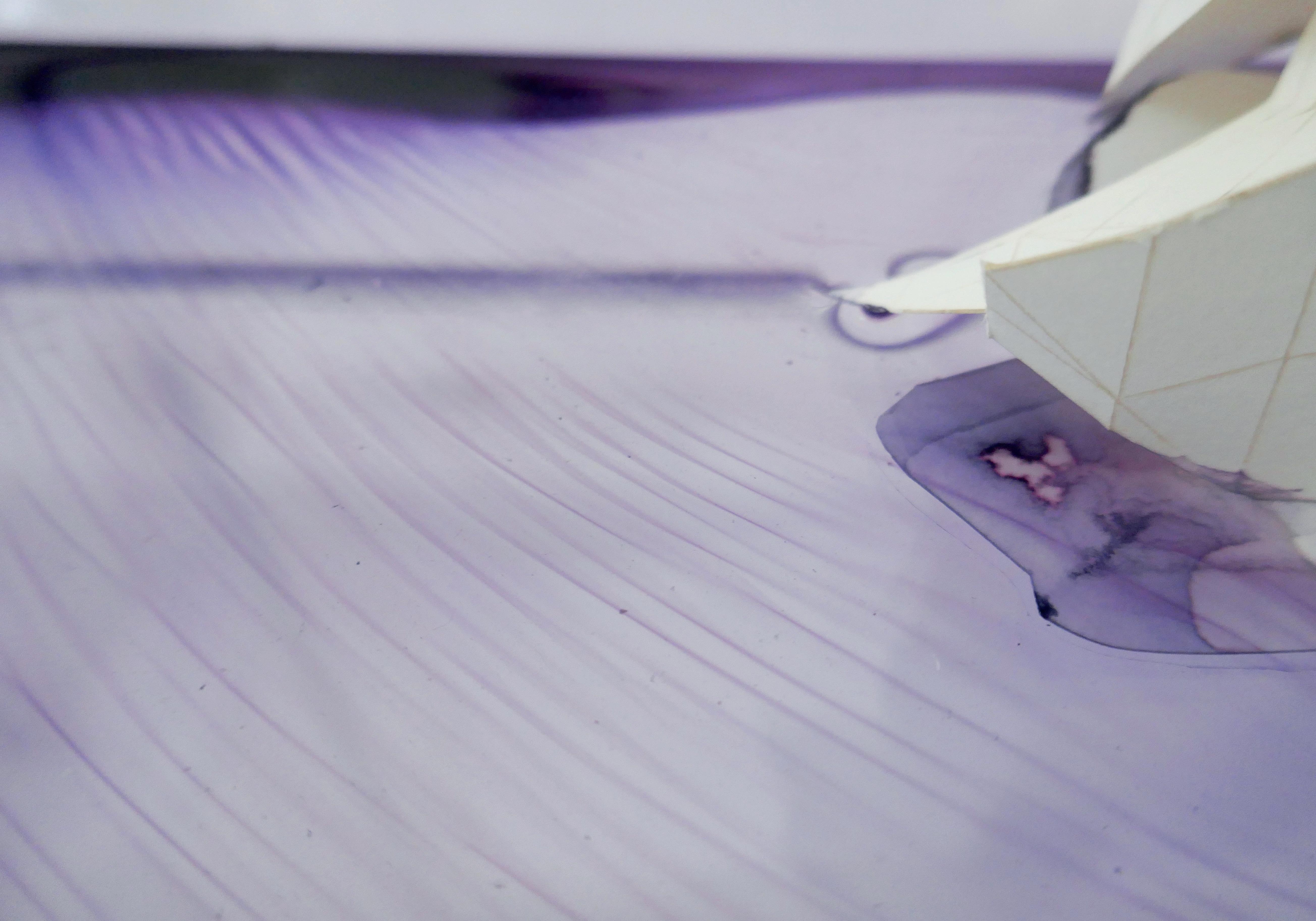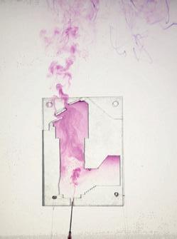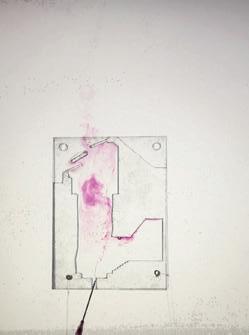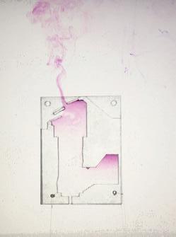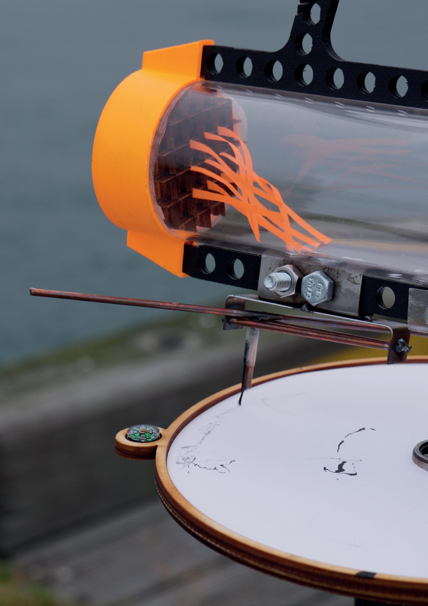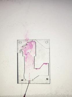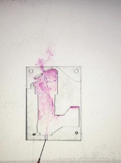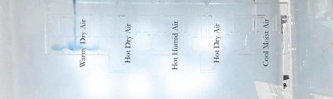 In the studio, models become instruments; instruments become buildings. Controlled environments fail. Air and water are capricious, prone to disturbance. Delicate exchanges are made evident through visual saturation, vibrant synthetic coloration, and high contrast. Orientations matter in terms of material weight and environmental prevalence. Architectural devices bu er and ba e; they contain, resist, ll, lter, and dissipate. Boundaries are unclear; gradients and intensities organise space. Curls and swirls are probable; lines impossible. Models leak; seams fail; water falls; air presses; smoke sputters.