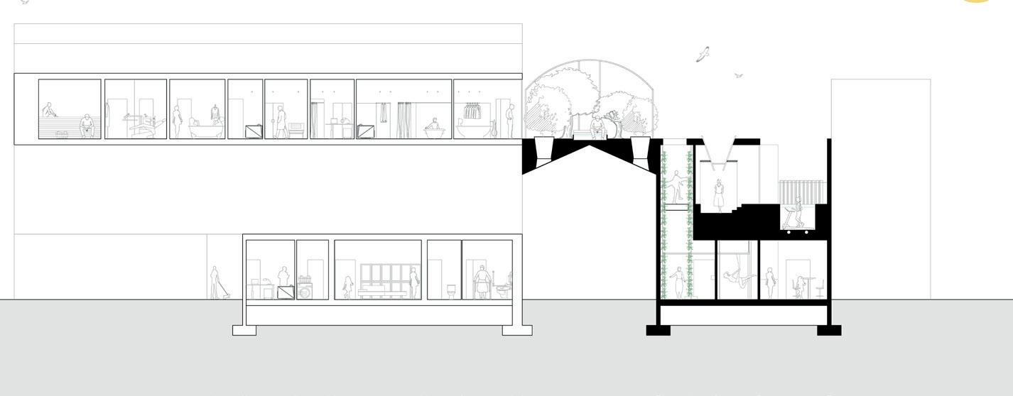 is proposal hybridises bathing and dwelling and recongures social structures and spatial elements within a historic