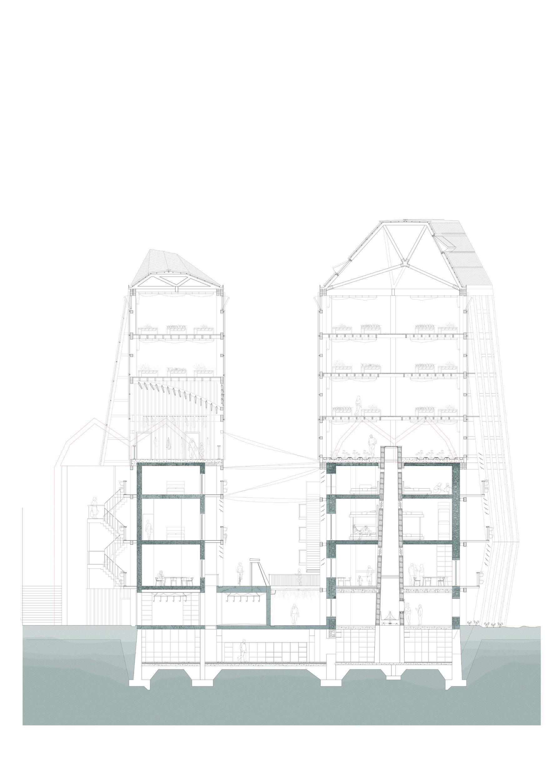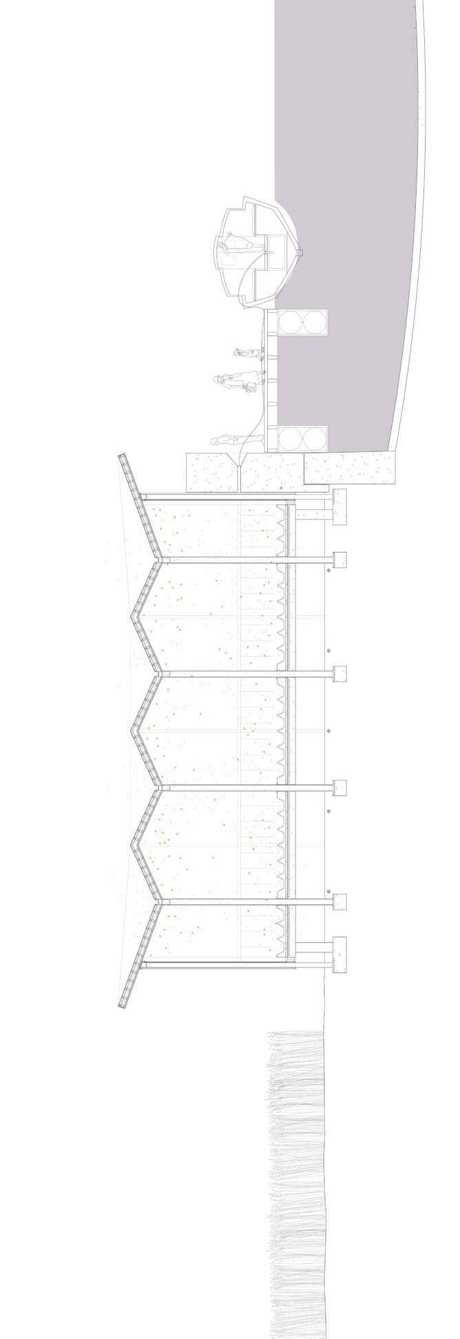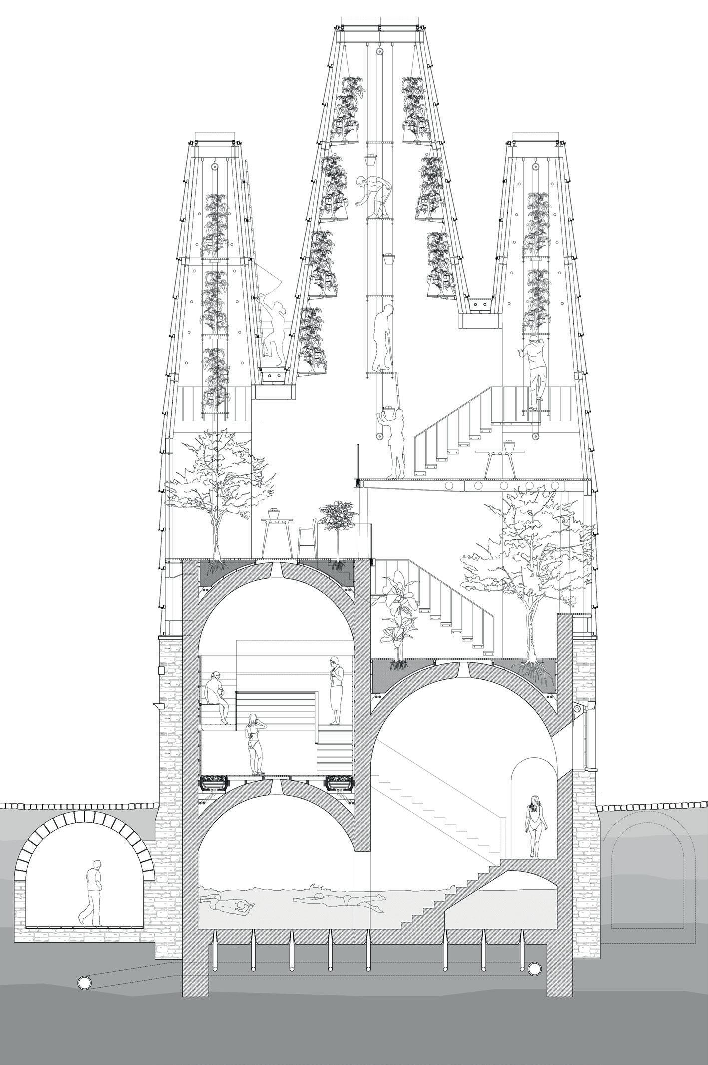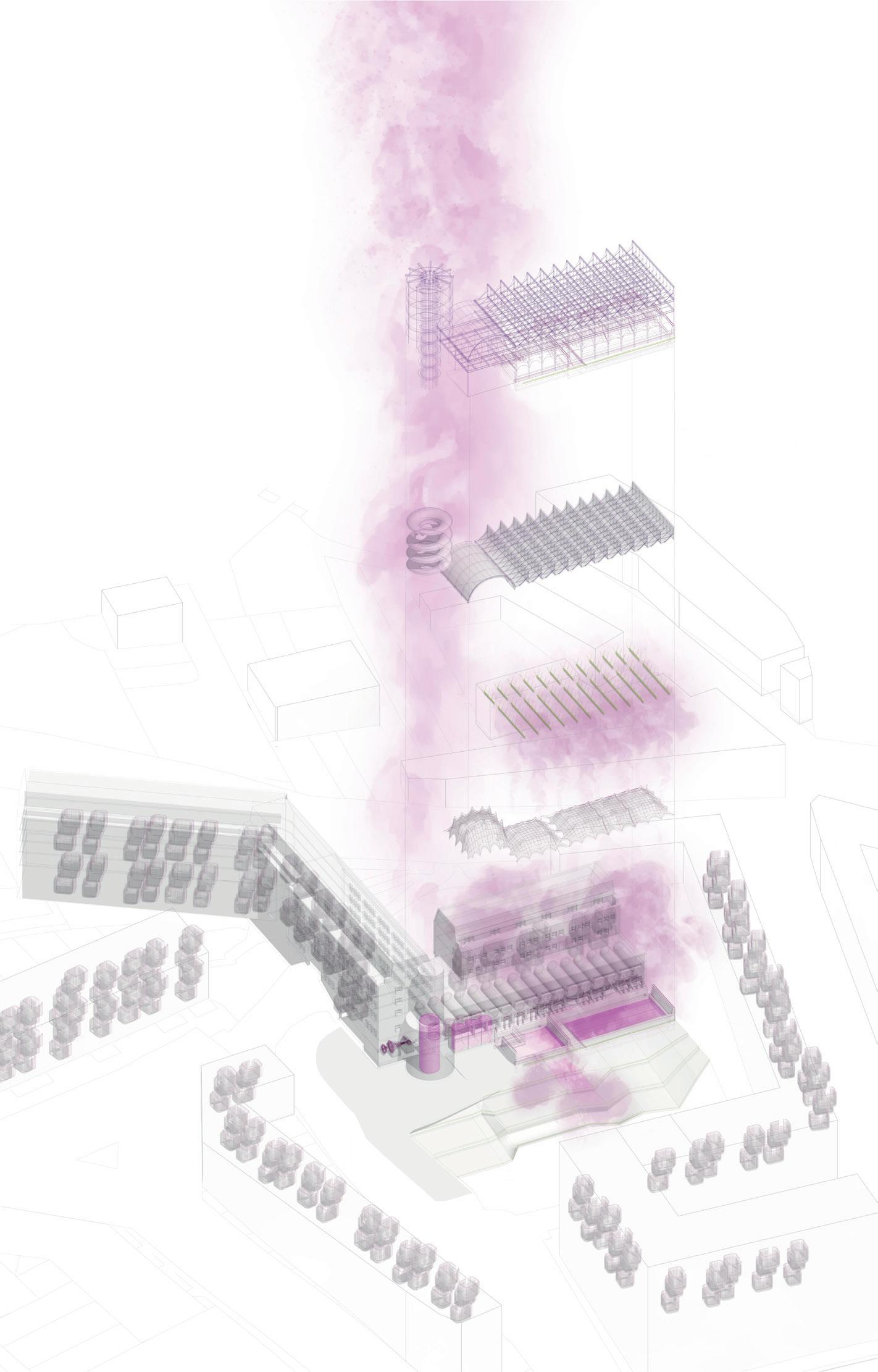 Above, framed circulation funnels connect to both a radically densi ed residential accommodation, around which a new green facade is wrapped. Warmed air nally rises to new greenhouse structures, maintained by residents which supply an autonomous source of fresh fruit and vegetables.