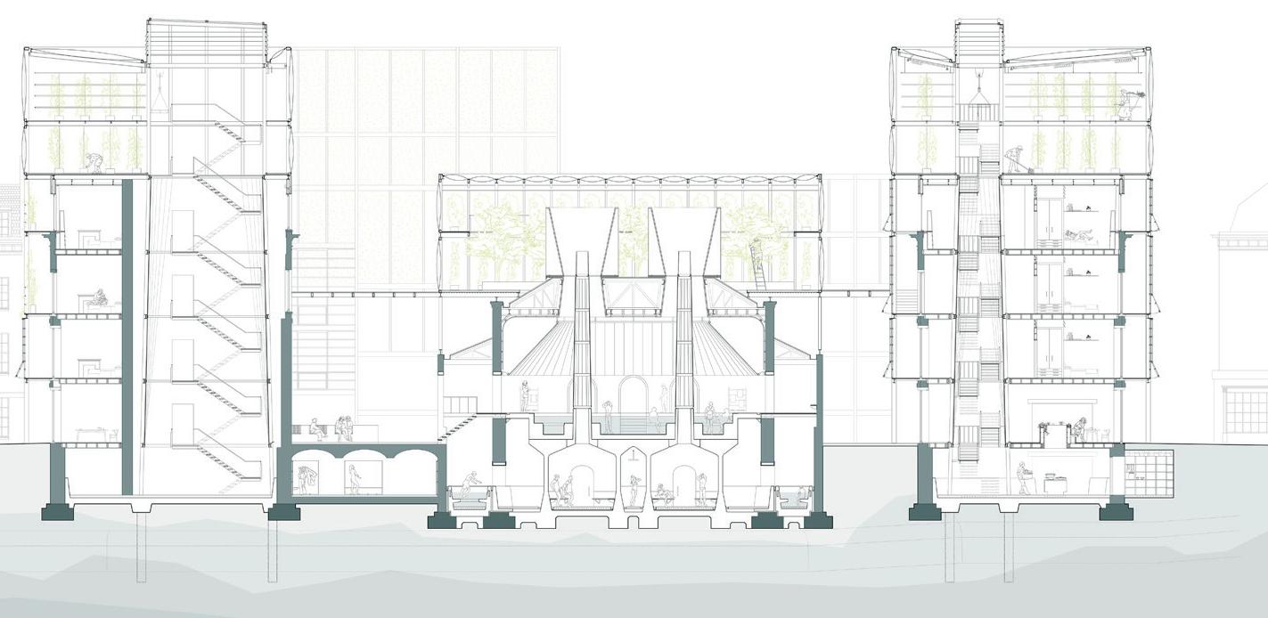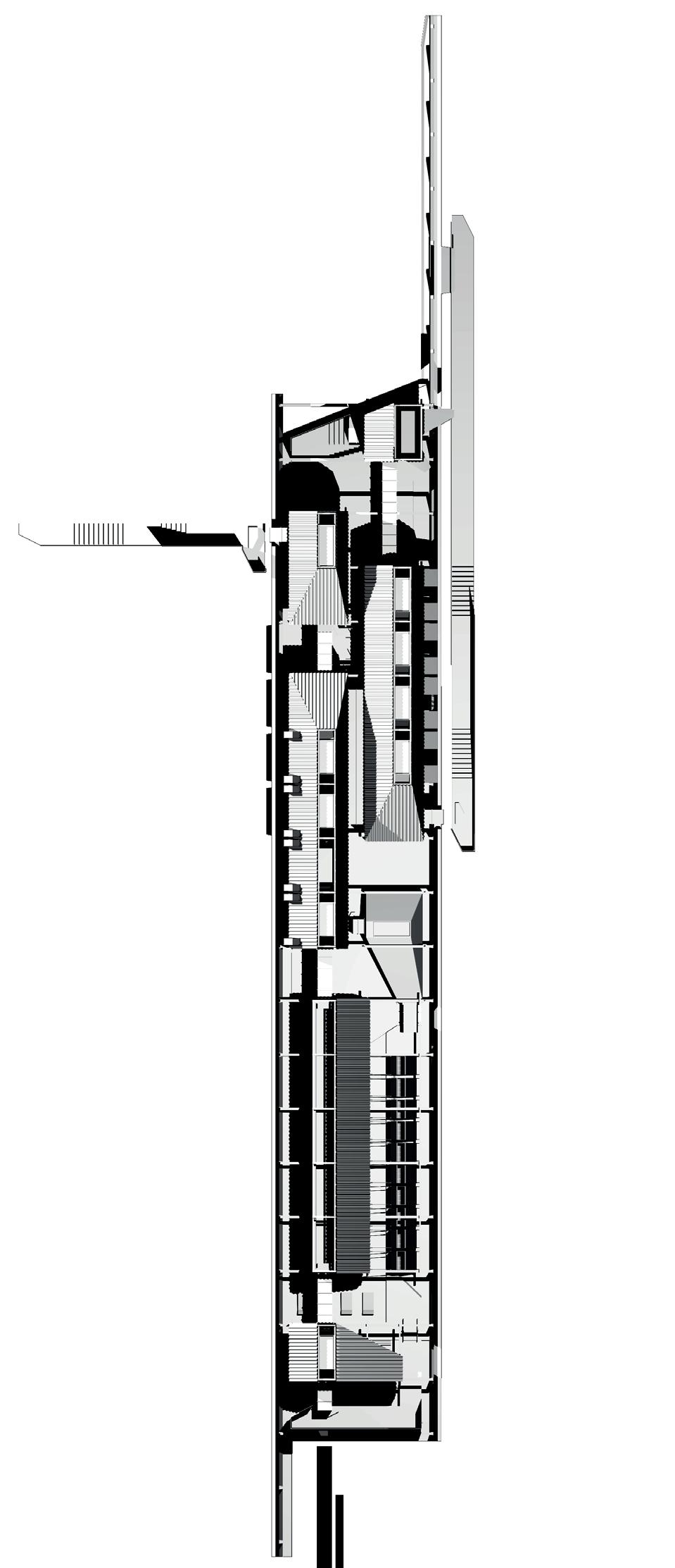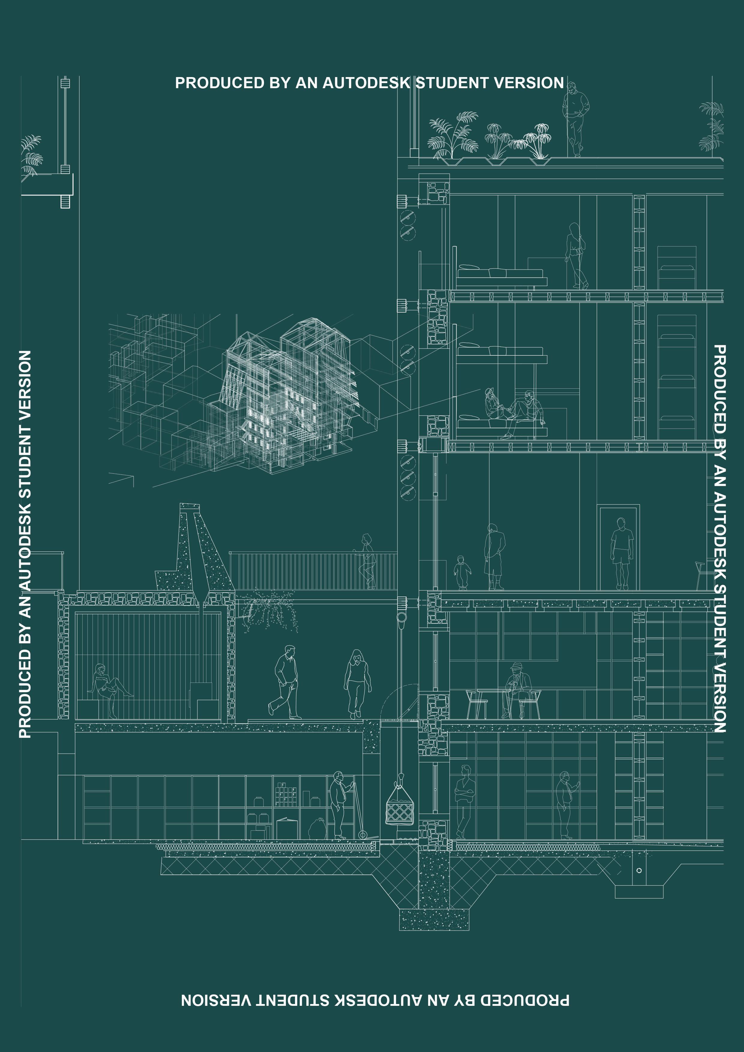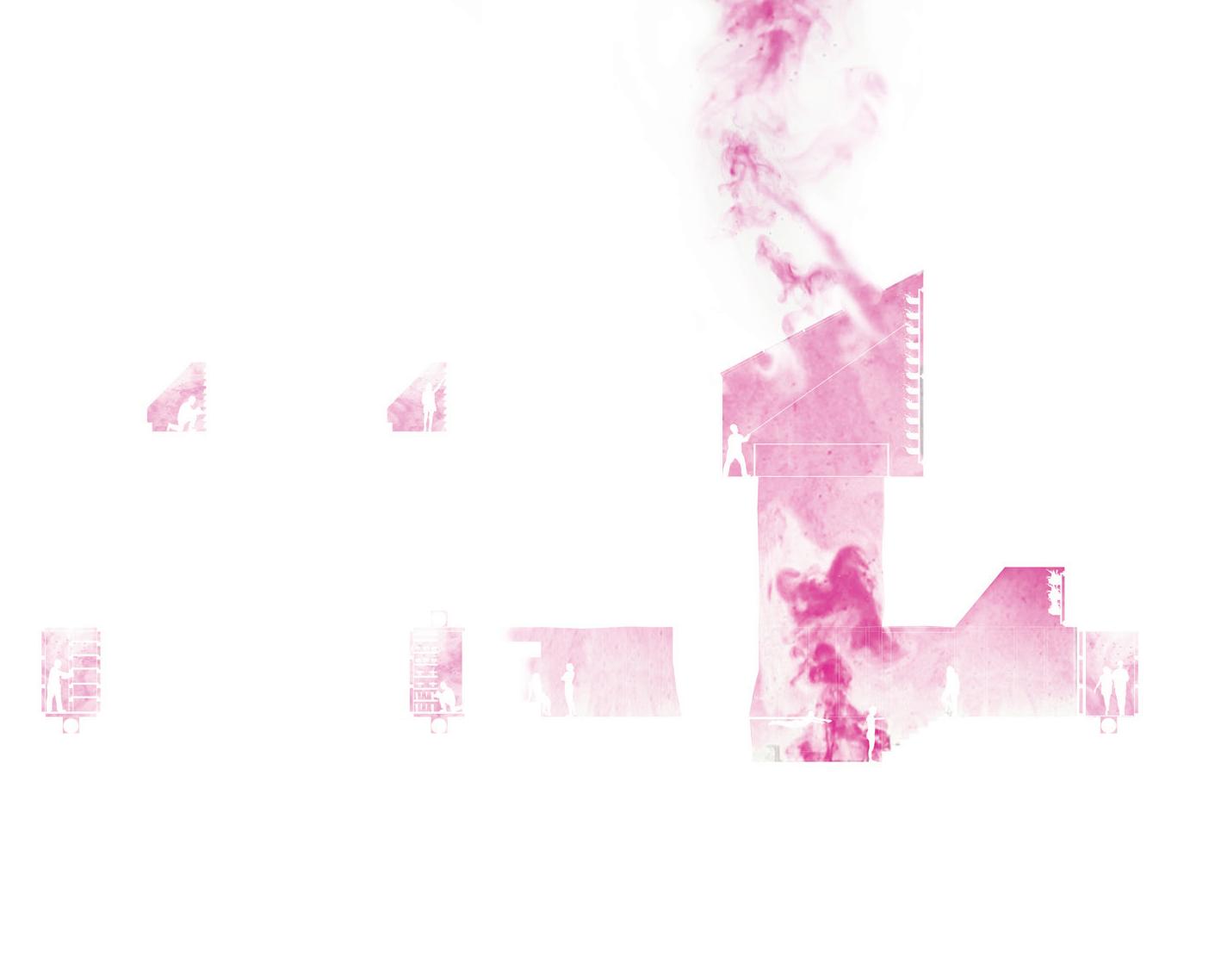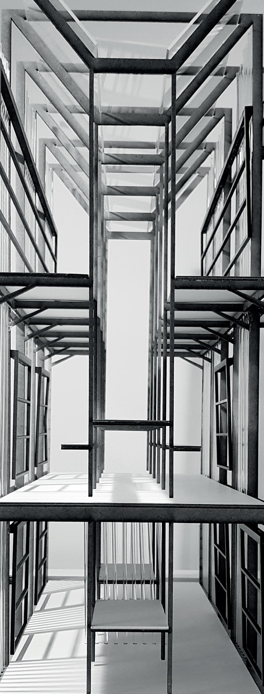 Above, framed circulation funnels connect to both a radically densi ed residential accommodation, around which a new green facade is wrapped. Warmed air nally rises to new greenhouse structures, maintained by residents which supply an autonomous source of fresh fruit and vegetables.