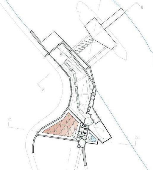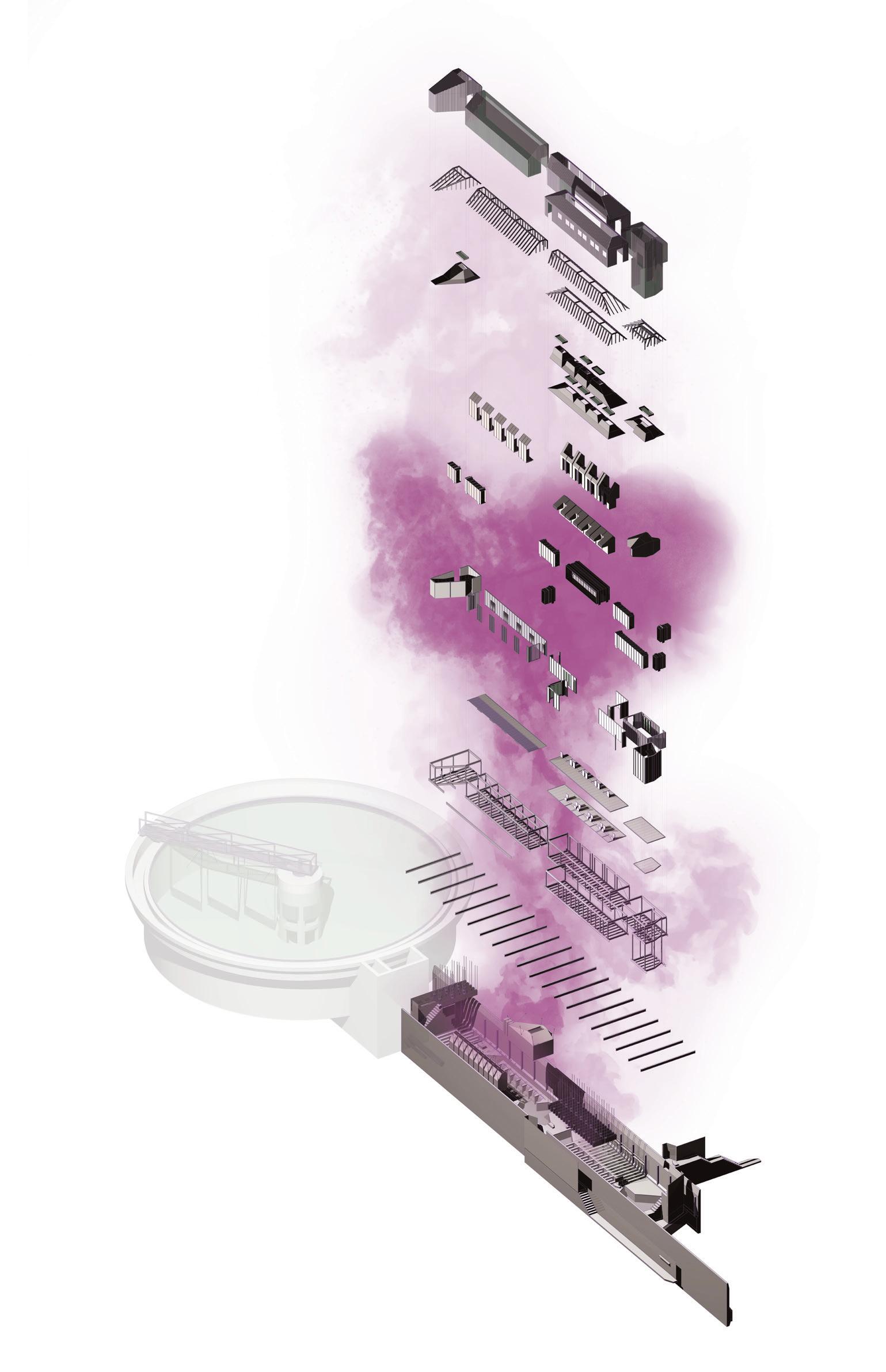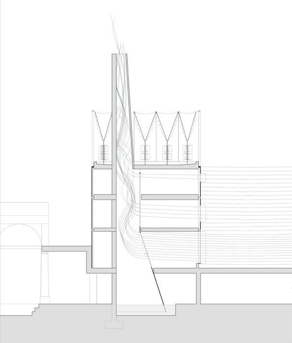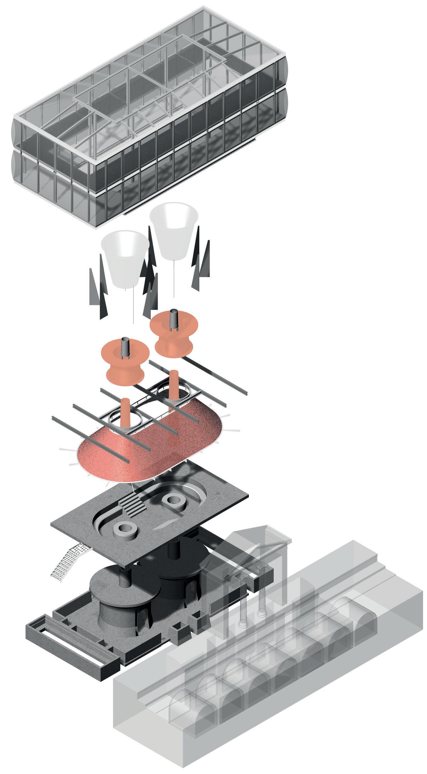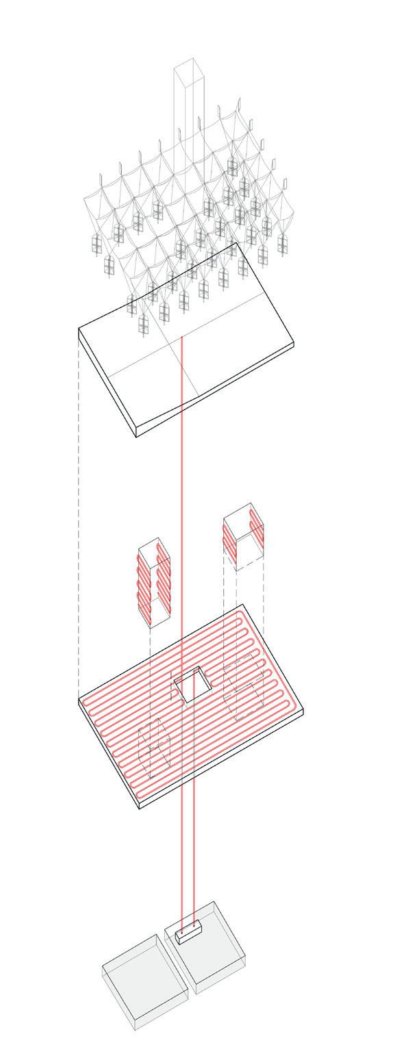 A series of umbrellas, stacks and pipes collect and direct uids into networks of closed and open circuits. ere are two primary directions of movement, which are mirrored in a tectonic language of light projecting structures and heavy underground thermal masses: on one side, rainwater is collected in devices that funnel downwards due to the e ect of gravity; on the other air is circulated through subterranean vaults and discharged into drying towers upwards due to buoyancy. e mirrored movement of buoyancy and gravity-driven ows echoes the dual reading a orded by the lling tank environmental model.