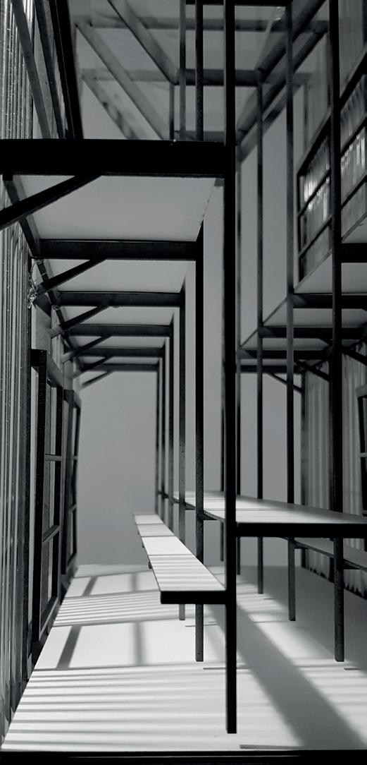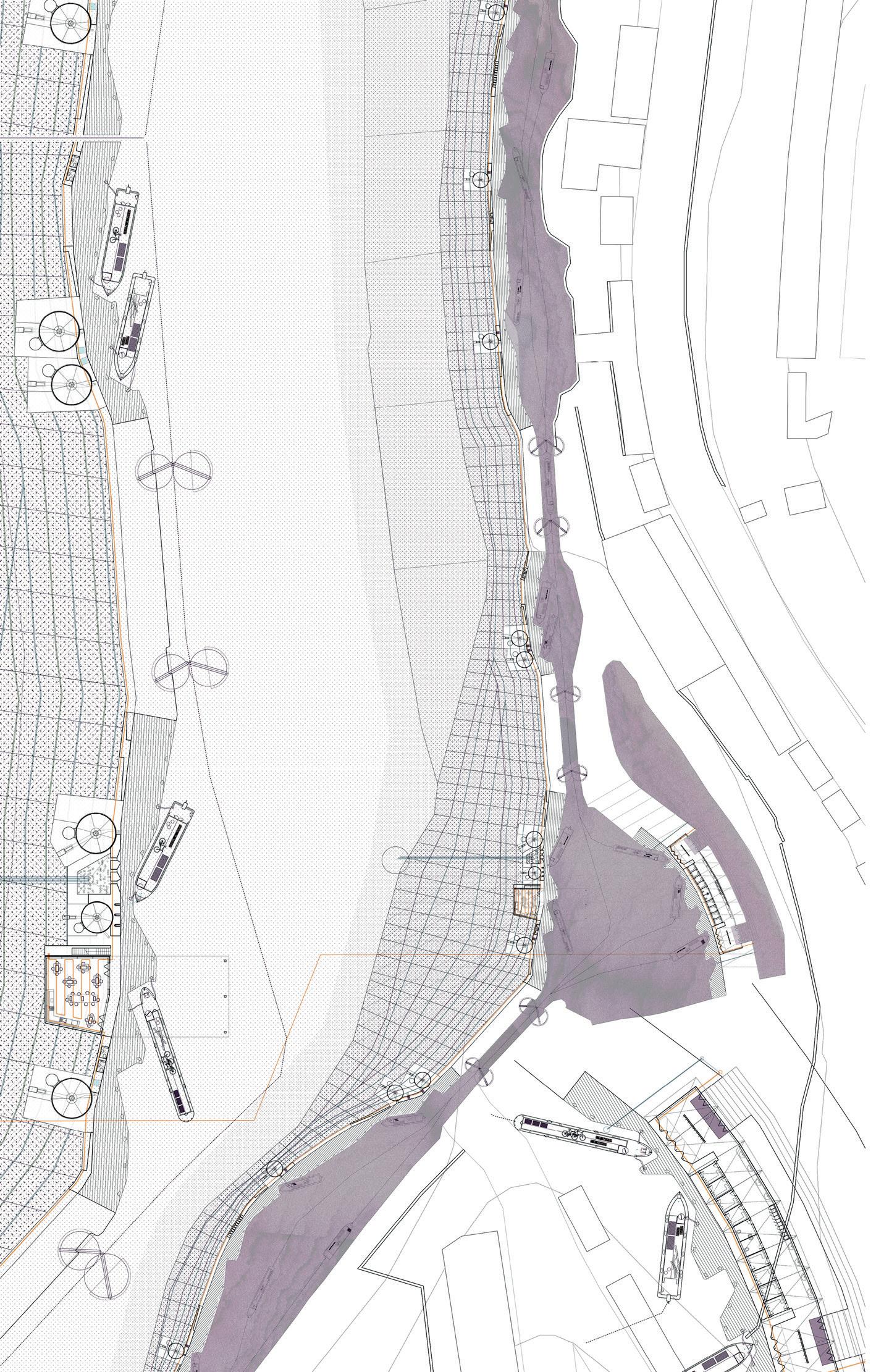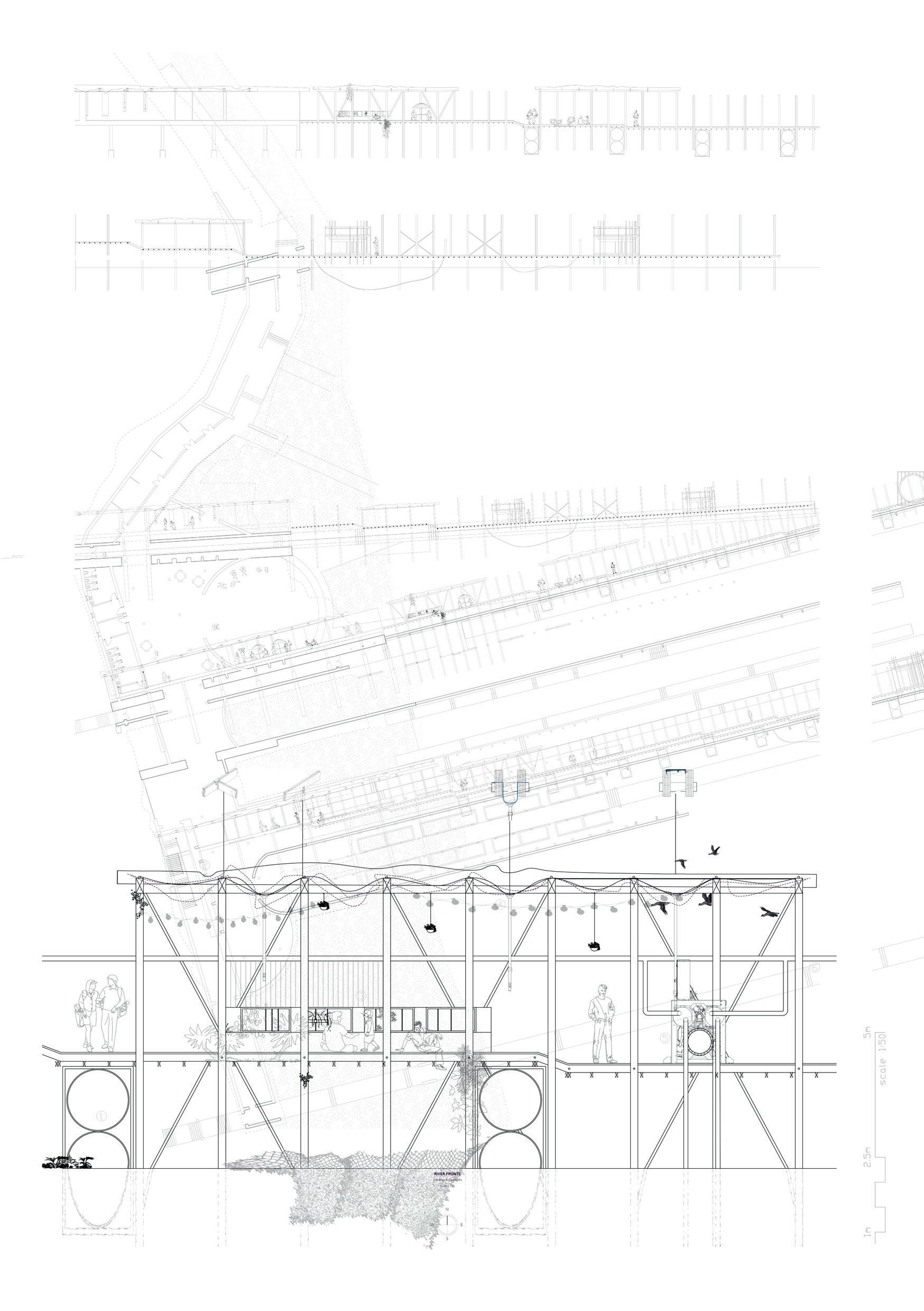 Transects link the city to the proposed made ground of the marsh and ooded river which de nes a narrative of production by a journey through thresholds; selling, storing, drying, shing, growing and harvesting. Platforms o er a counter-grain to the building as they extend and allow themselves to be submerged or exposed to the ood supported by nets, enclosures and frames.