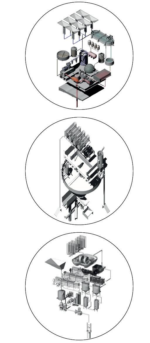 e methodology of working with calibrated models and machinic drawings was further tested in the urban context of Bath, where low-grade geothermal potential is present. Here the investigation focused more intensively on water cycles related to district-scale water puri cation and recycling processes. ree projects hypothesise about a post-carbon future in which freshwater becomes a limited resource due to climate change and where centralised water processing becomes more atomised within the city. ree individual interventions grew from this hypothesis: e Remedial Bathing Machine, Bellott’s Rehabilitation Prototype, and e Algae Nutritional erapy Centre. All three interventions re-establish the medical history of Bath city centre by re-introducing spaces for health and wellbeing while establishing a didactic language exploring the materials and spaces of care and human inhabitation and the machinic processes that facilitate this care.