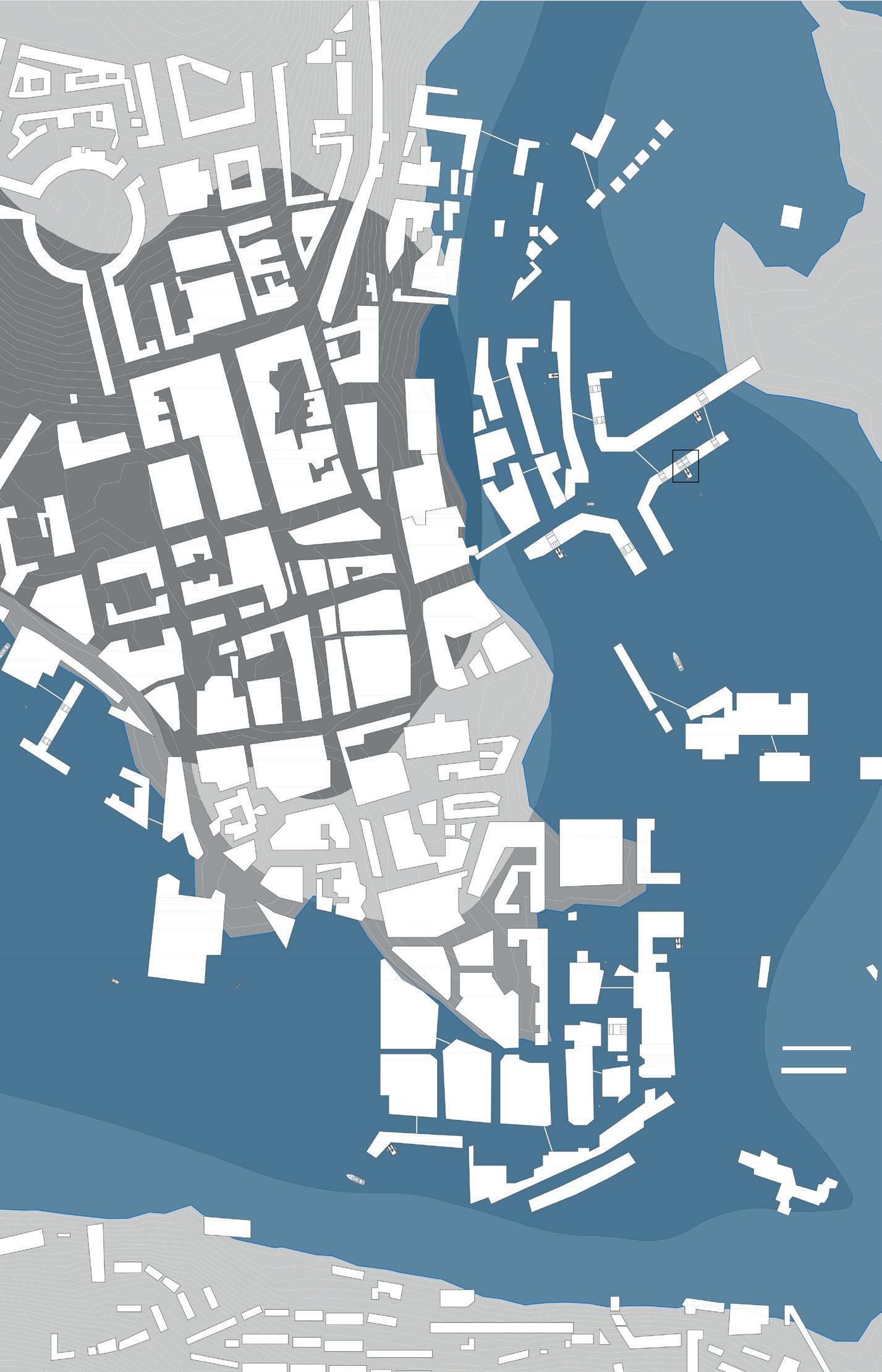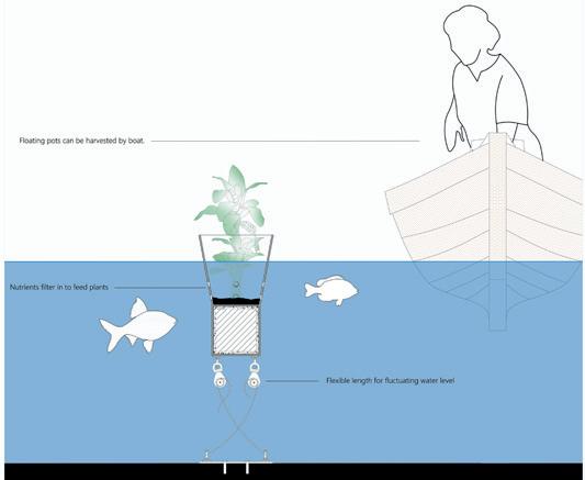 Water Fronts engages with interfaces between heat, water, and ground in three zones – the high and dry ground of the city centre, newly ooded marshland between city and river, and the oating world of canal dwelling. Individual projects investigate the generation of productive and interdependent water and food cultivation systems that respond to and accommodate future social, environmental and agricultural demands.