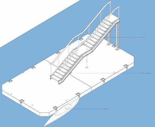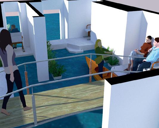 e proposal’s functions across two levels are harmonised by an intermediate level, uniting di erent ows of people and water. e ground level is integrated with the river for processing water. A wall perpendicular to the river’s edge incorporates a water turbine and dam system, enabling the project to generate hydropower. Ramped circulation into and through the intermediate oor lifts the occupant into the upper level, where public baths are supported as tanks oating within the double volume space. is experiential journey ultimately descends into a water garden, where water is ltered through phytoremediation. e architectural and topographic language of the building is that of an inhabited infrastructure of ood controls, incorporating both hard and soft boundaries and subtle and extreme methods for containing, directing and holding water.