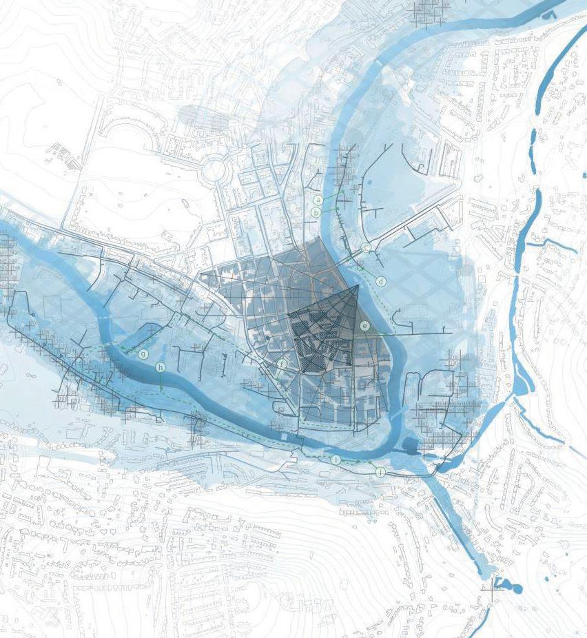 is project creates an inhabited ood defence for the city of Bath, creating a new edge between central Bath and the River Avon. Water is used to generate energy and processed for general consumption; and warm water contained within vessels for bathing. Subtle topographical variability informs circulation, landscape and building massing strategies.