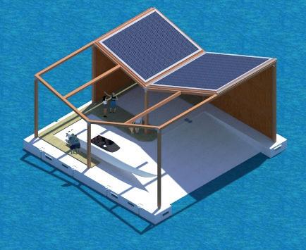 A water trough allows water to travel from the warmer micro-algae pool to the cooler macro-algae pools. It also has a collection mechanism to harvest and filter the microalgae downwards into the eating area. Some of the pool water is also fed into the hydroponic system directly below.