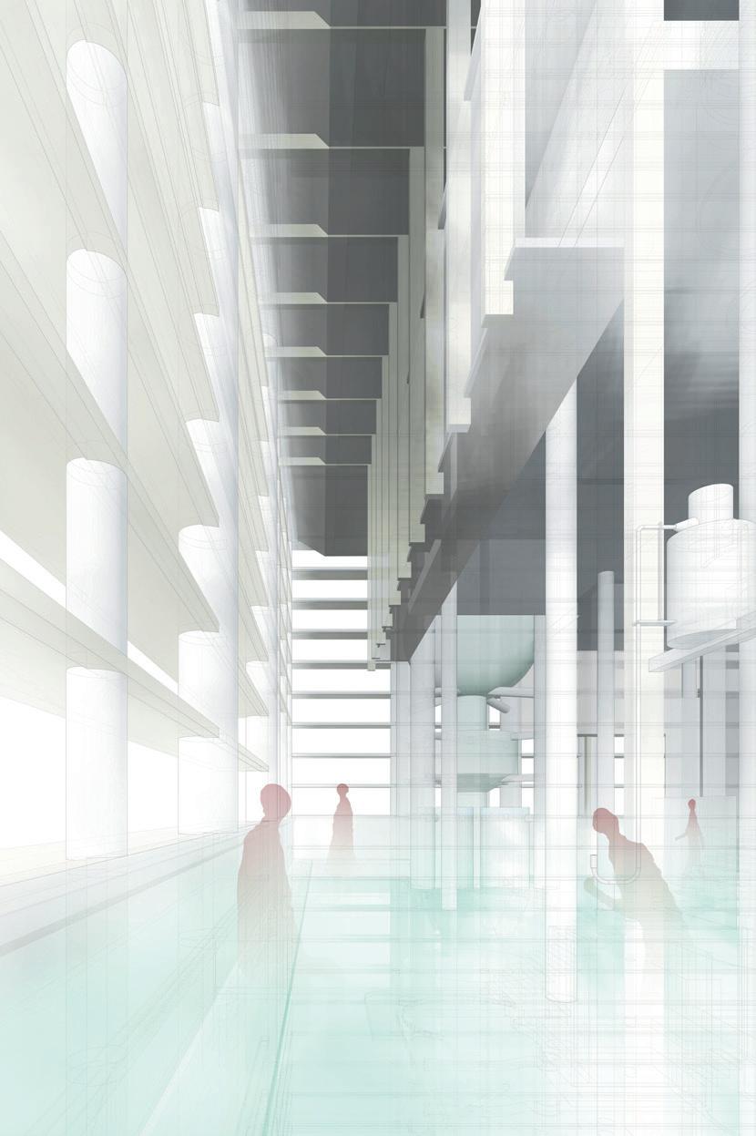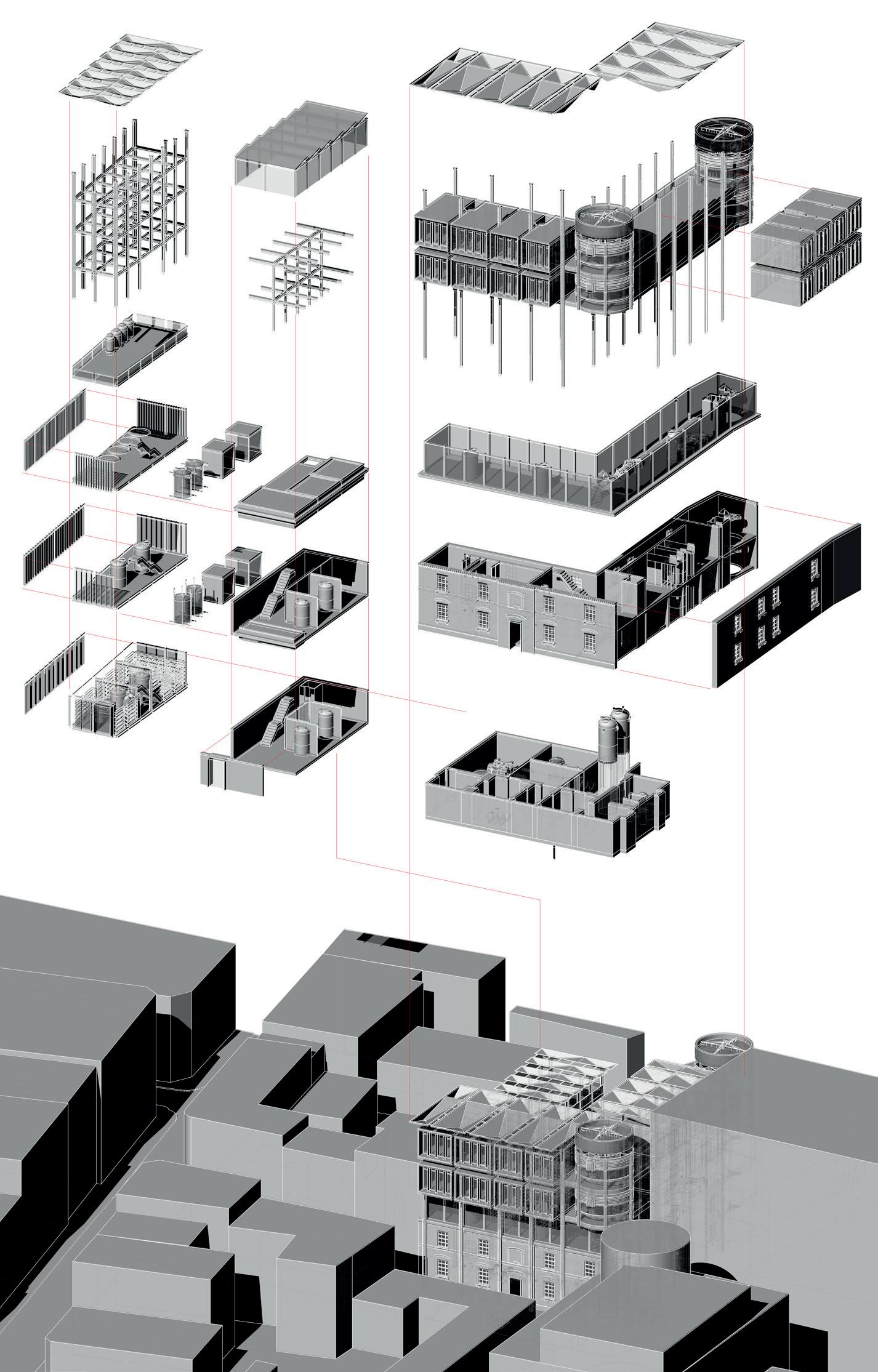is intervention re-establishes the historical medical identity of Bath city centre by projecting a new strata of energy and food production above the existing urban context where hydrotherapy exercise, and cultivation of algae and herbs take place simultaneously. Hydroculture systems maximise yields of produce and requires a minimal footprint unlike traditional farming techniques. ese systems are integrated within a larger self-su cient system throughout the rest of the building that lters geothermal groundwater and rainwater, recycles wastewater, and generates biomass energy.
