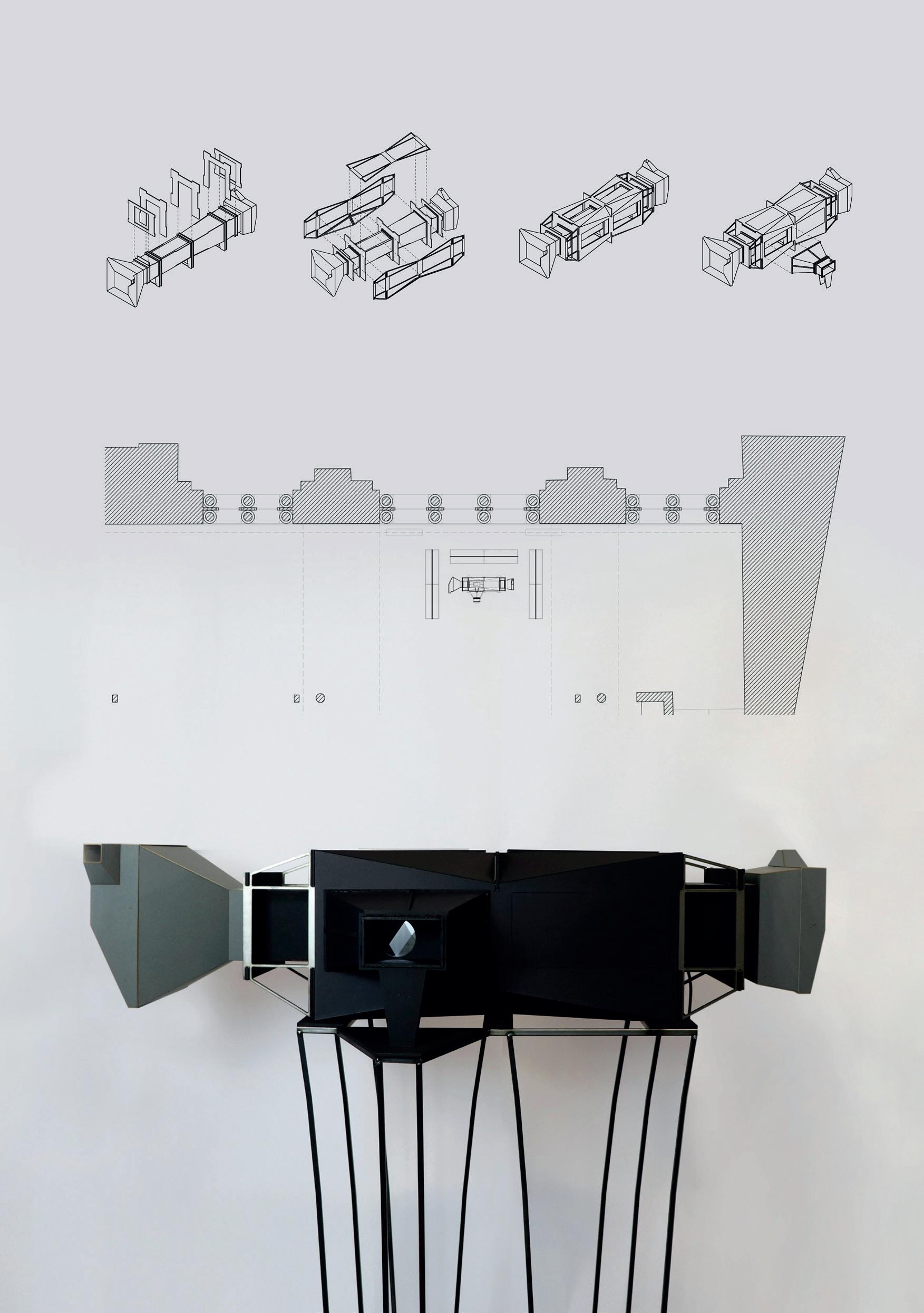 e architecture operates as a series of augmentations, additions and insertions into and onto the existing fabric. e wind tunnel is exploded and re-purposed. Funnels become chimneys, drawing air through the depth of the buildings. Rudders become ns, orientated to register and direct air ow through the site to facilitate food drying preservation. Filter structures envelop the proposal, medi¬ating thermal climates through site speci c shading and greening. e controlled test chamber evolves into the subterranean vaults, providing retention properties and constant low temperatures for food storage. All instruments act to passively control environmental conditions.