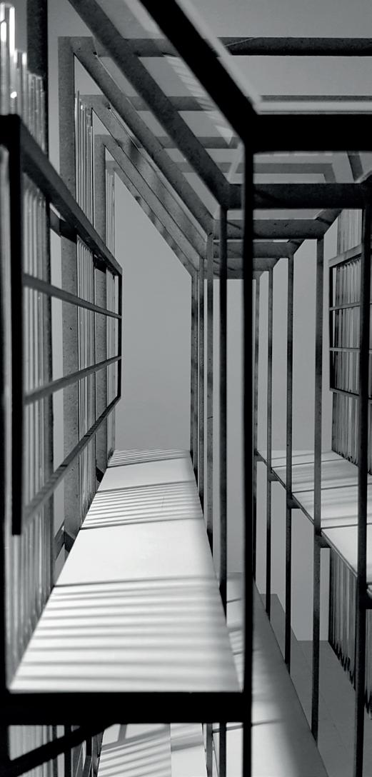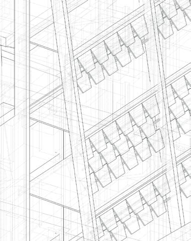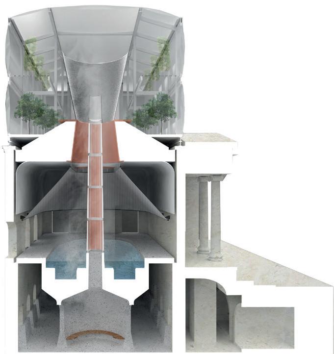 Situated above the Georgian Hot Bath, the new structure vertically channels the extracted thermal water through various bathing tables of both controlled and contingent environments to create experientially purposed pools with transitioning and contrasting temperatures to increase the e ects of healing. e building is enveloped by an enclosure of mechanised timer louvres to control air ow and sunlight within the varying internal thermal conditions. Whereas existing thermal bathing in Bath is reserved for the elite, this project proposes a free-to-book scheme, creating a densely occupied, active and thriving social space.