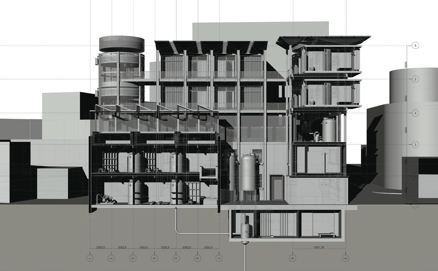 e consumption area inhabits the rst oor of the original building where the existing strata and the new strata interface – the materiality of the productive systems become most apparent here in the form of spatial and thermal elements. Vertical glass tubes with hot water provide an additional thermal layer to the original building fabric and glass windows in the bottom of the roof-top hydrotherapy and algae-cultivation pools allow moments of sunlight to lter through into the spaces below. A glass trough runs directly above the double-height space and shows the ow of water from one pool to another.