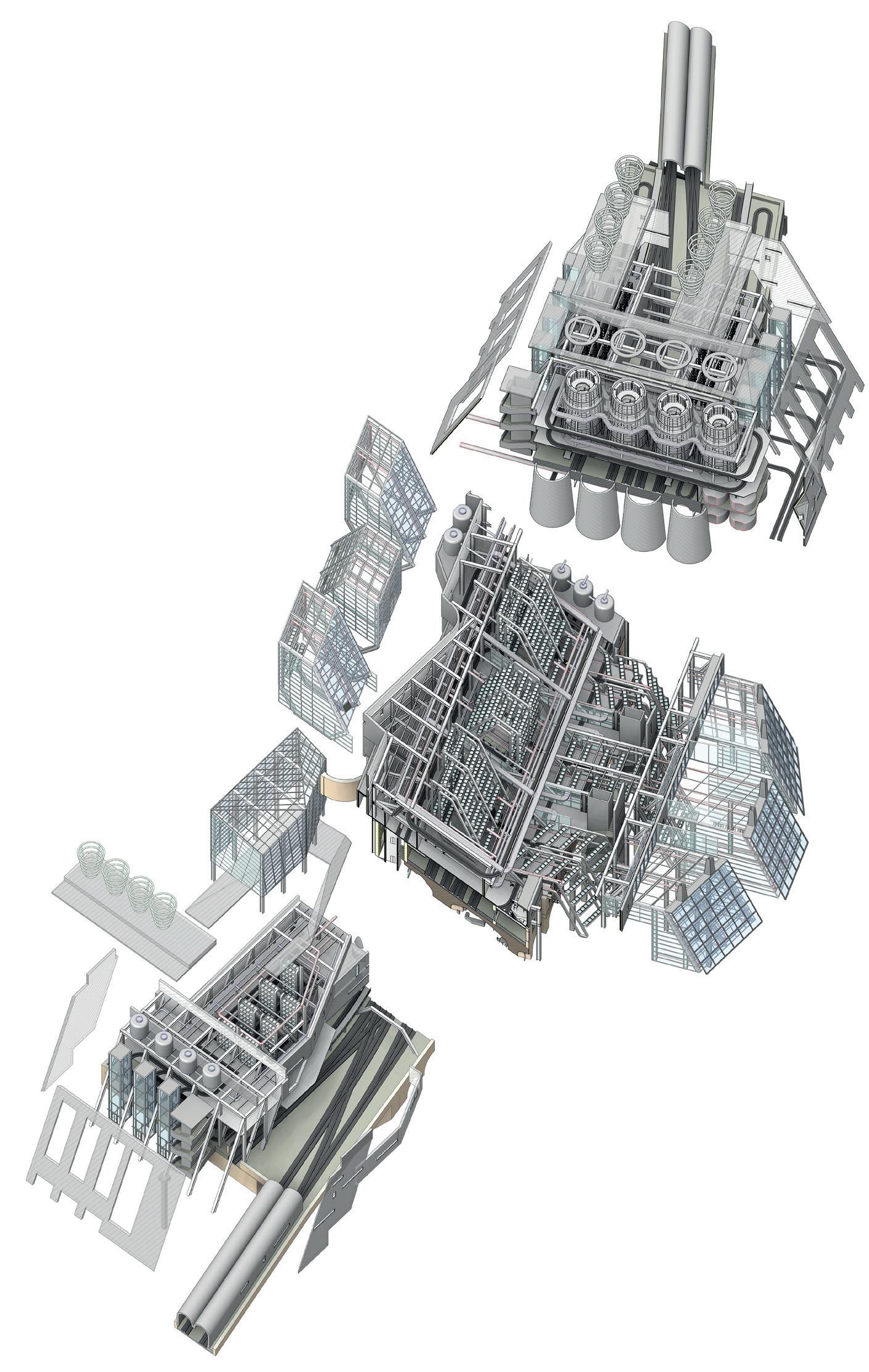 It is tempting to view the industrial architecture of Svartsengi as a stark counterpoint to the sublime landscape in which it sits—an assembly of mechanical components disrupting a pristine environment. But the two systems are in fact deeply intertwined. e pools of the Blue Lagoon are pools of wastewater from Svartsengi—expelled from the power plant after being stripped of their useful o erings. Despite engineering attempts to inject the wastewater below ground, the lava rock resisted, releasing silica and forming mineral-rich mud that sealed the ground, creating enormous contained tanks. ese tanks of waste water are now the Blue Lagoon, an elite tourist destination. e Blue Lagoon is a very pro table waste-scape and a feat of geological civil engineering. e power plant can be viewed as a complex water cycle, an accelerated landscape analogous to that of the very geology of Iceland itself—a mutable, shifting set of thermal exchanges and state changes—but of water rather than of lava. us, we have new counter models for reading both conditions: the power station as a water cycle; the power station as a tectonic shift; the thermal baths as a mechanical system; the thermal baths as civil engineering.