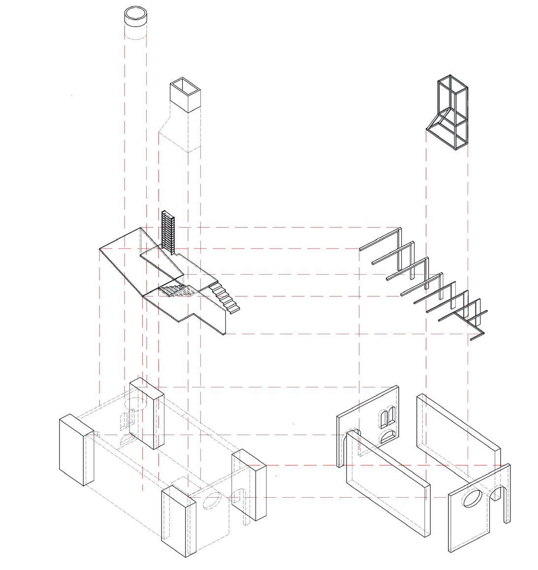 Instrument to Surface resholds is a proposal that strives to create living and working environments that facilitates a localised and sustainable approach to living, consuming, growing and producing within the collective reworked strata of the city. Spanning two existing Georgian town¬houses in the centre of the old Medieval walls of Bath, the approach focuses on densi cation of dwelling and collective consolidation of cooking and bathing facilities, to communal spaces. Where occupying the mid and subterranean strata, existing fabric will be retained. ermal chimneys acting here as both heat and ventilation strategies, but also structural components to adapt the Georgian oor plans. e aerial o ers a new landscape where to extend and localise productive growing space.