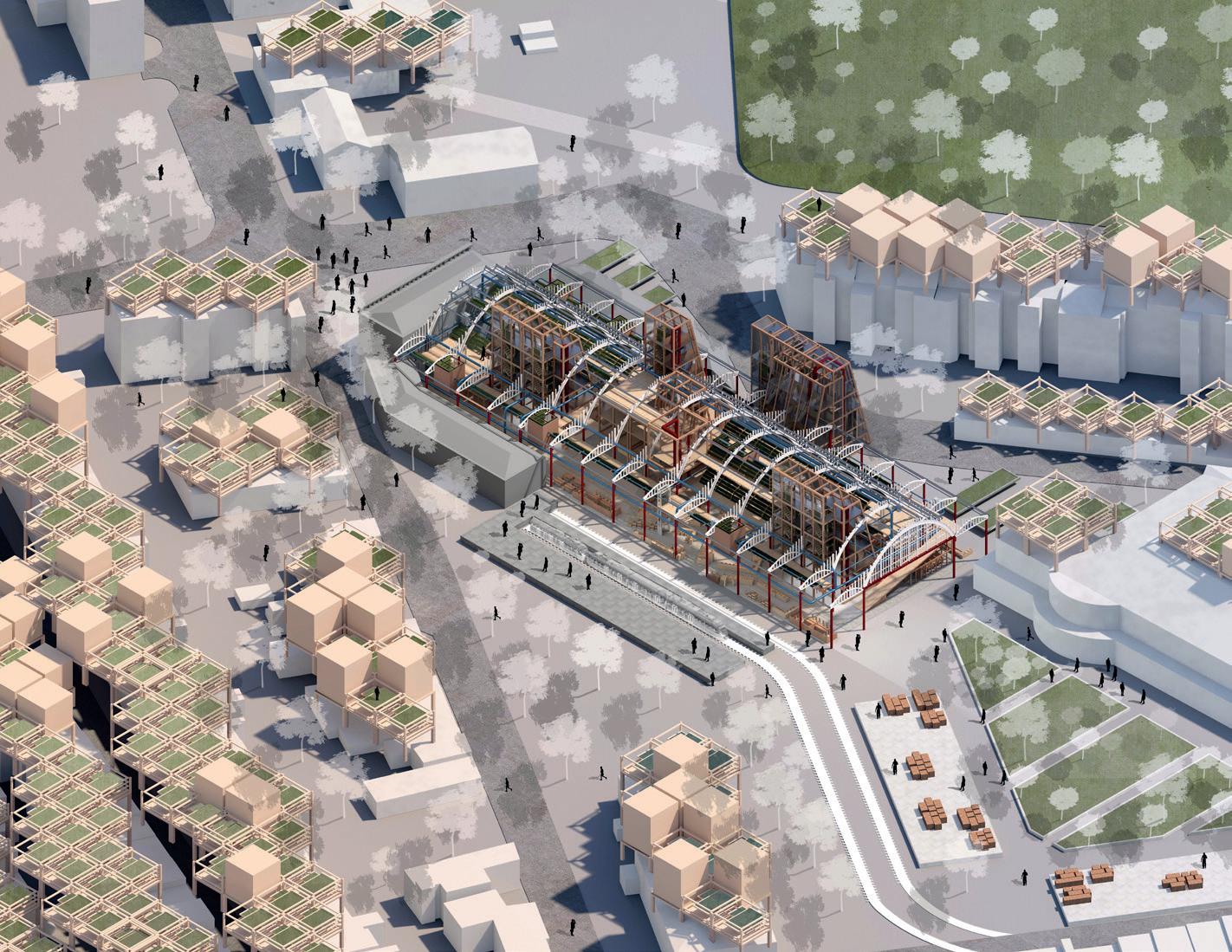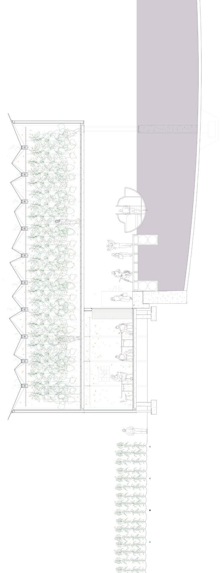 e project is organised around four key programmatic features: existing rail lines and platforms, the addition of three new microclimate greenhouses, each of which creates a distinct biome to facilitate growth a wide range of fruit and vegetable species; new protected seed vaults, and internalized infrastructure supporting the movement and short-term storage of food from elsewhere in the city. e existing structural system subdivides the project into distinct bays. A series of frames and lightweight cladding interface with this existing structure. e structural and material language of the project is derived by earlier investigations focusing on ba es, frames, skins, and nested environments. Passive ventilation strategies, rainwater irrigation collection strategies, seed dissemination and geothermal water distribution enables the construction of distinct environments that entangle infrastructure, food, and occupation.