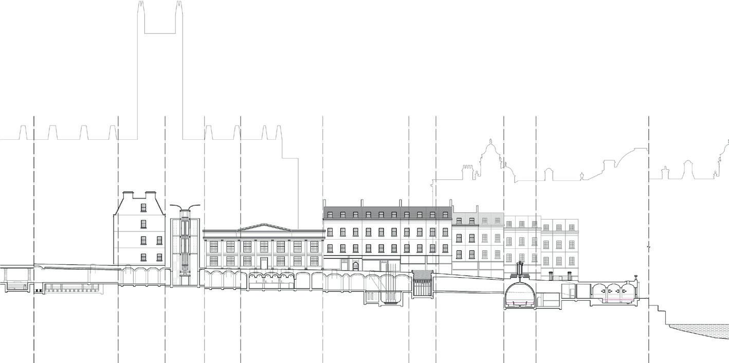 is proposal hybridises bathing and dwelling and recon gures social structures and spatial elements within a historic urban block in central Bath. e proposal reworks the interior of two existing Georgian buildings and adds a new built collective bathing and communal food cultivation space within an existing gap between the two buildings. e project thus mediates space both horizontally between existing and new and vertically through collectively reworked strata as follows: First, the project provides a subterranean point of connection to Bath’s hot spring and vault network. Previously occupied by commercial activity, this new heavy, heat-retaining layer contains new modes of energy production and collective bathing facilities, creating a new public/social space throughout the city.