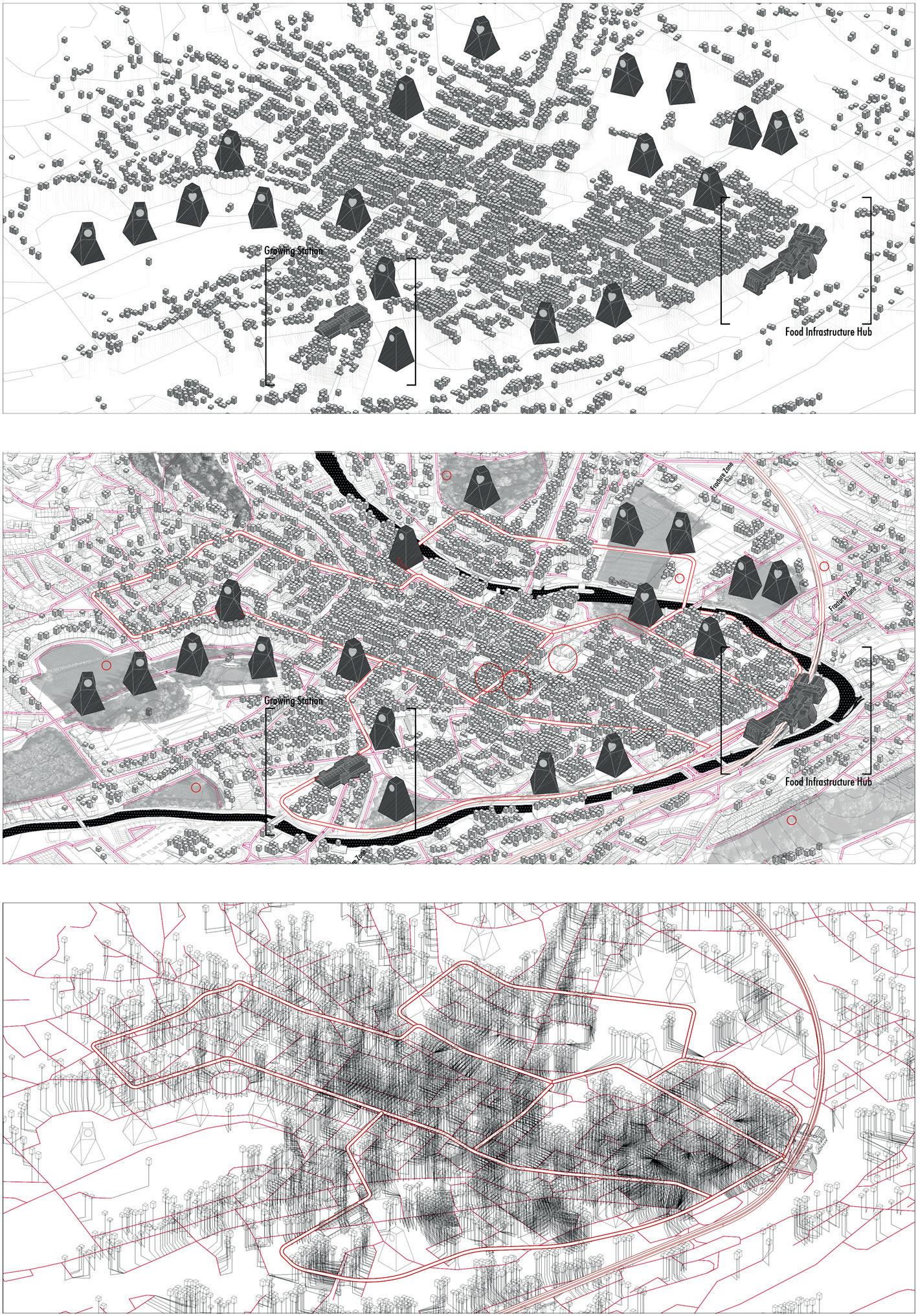 A collective narrative underpins design interventions in Bath. In 2120, Bath is situated within a global context of climate change, whereby habitable and productive land is greatly reduced and where climate change makes dwelling in continental temperate climates unbearable, leading and to mass migration north. is in turn pushes the city to reconsider its approach to food security and food autonomy, forming a network where perishable foods are grown locally within the urban context and larger agricultural processes are relegated to enhanced existing farmland at the periphery of the city. Lifestyle patterns are drastically altered to reduce energy consumptions by collectivising heat intensive activities. e xisting strati ed nature of Bath is intensi ed: the subterranean level holds the capacity for heat distribution and retention, the existing building fabric holds potential for dwelling densi cation, and a new aerial layer above the city supports a productive landscapes of food cultivation.