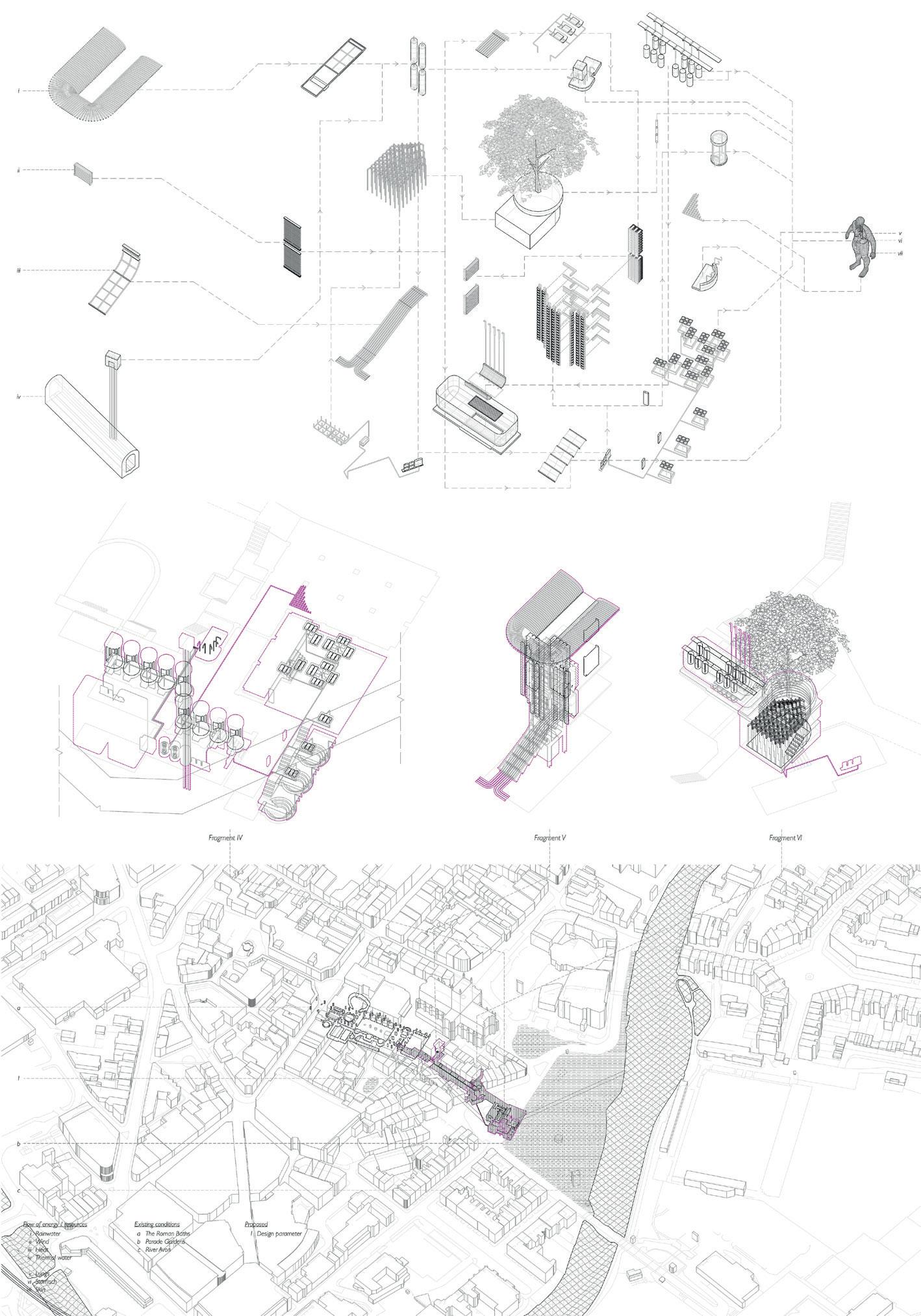 Anticipating forecasts for extreme weather relating to climate change, and aiming to increase resilience and carbon sequestration, the project partially oods the city. e resulting marshland erases the existing hard edge between river and the city and choreographs encounters between thermally charged zones, water ows, and human habitation in two zones. e rst, a reworking of the Kennet and Avon Canal, augments existing canal infrastructure to enable water ltration and recycling, irrigation, food cultivation, collective cooking and bathing. e second, along the River Avon in central Bath, merges wet and dry topographies by exposing gradients to introduce a productive marketplace and associated cultivation landscape.