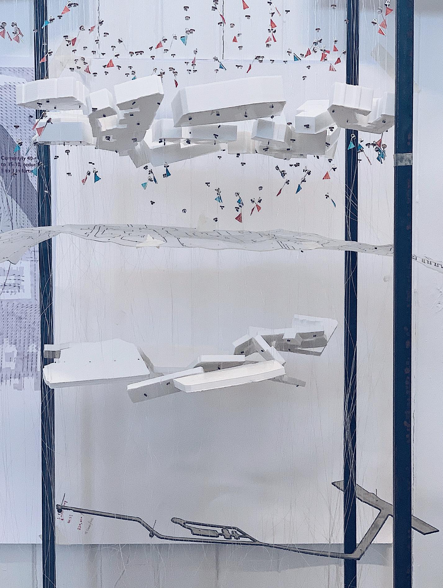 In the studio, Bath becomes a thermal hub where public bathing is re-democratised. Bath becomes a food emporium, a city of greenhouses of constructed biomes where Mediterranean and Tropical gardens in ltrate the city. e River Avon is alternately controlled and ooded to support agricultural production and to increase carbon sequestration. e Great Drain outlets into the River Avon, creating an altered and thriving warm-water ecosystem. Bath’s roads become ecological corridors; its gasworks recon gured to biofuel production. Bath’s history as a therapeutic hub is reinvented. Here bathers swim in tanks of algaue; bath water is infused with herbs cultivated and dried on site; steam is trapped and directed into baths contained in urban ruins. Bath lies fallow and is re-wilded; it falls to ruin. Bath’s quarries and mines house mechanised food production. Land and water-based dwelling is densi ed and thermally rezoned, inaugurating a new social order in the city. Environmental instruments in ltrate its buildings, attuning them to particular luminous and thermal conditions. Bath’s subterranean vaults are recalibrated; its skyline is activated with a new, light aerial stratigraphy added above. Future Bath hisses and sputters; it steams and dissipates; it bustles and works; it shifts and negotiates; it oods and dries; it inhales and exhales; it works hard, yet it thrives.