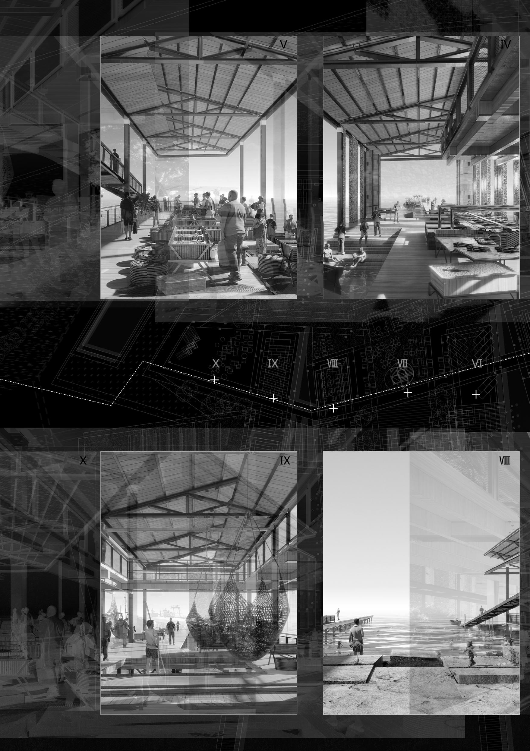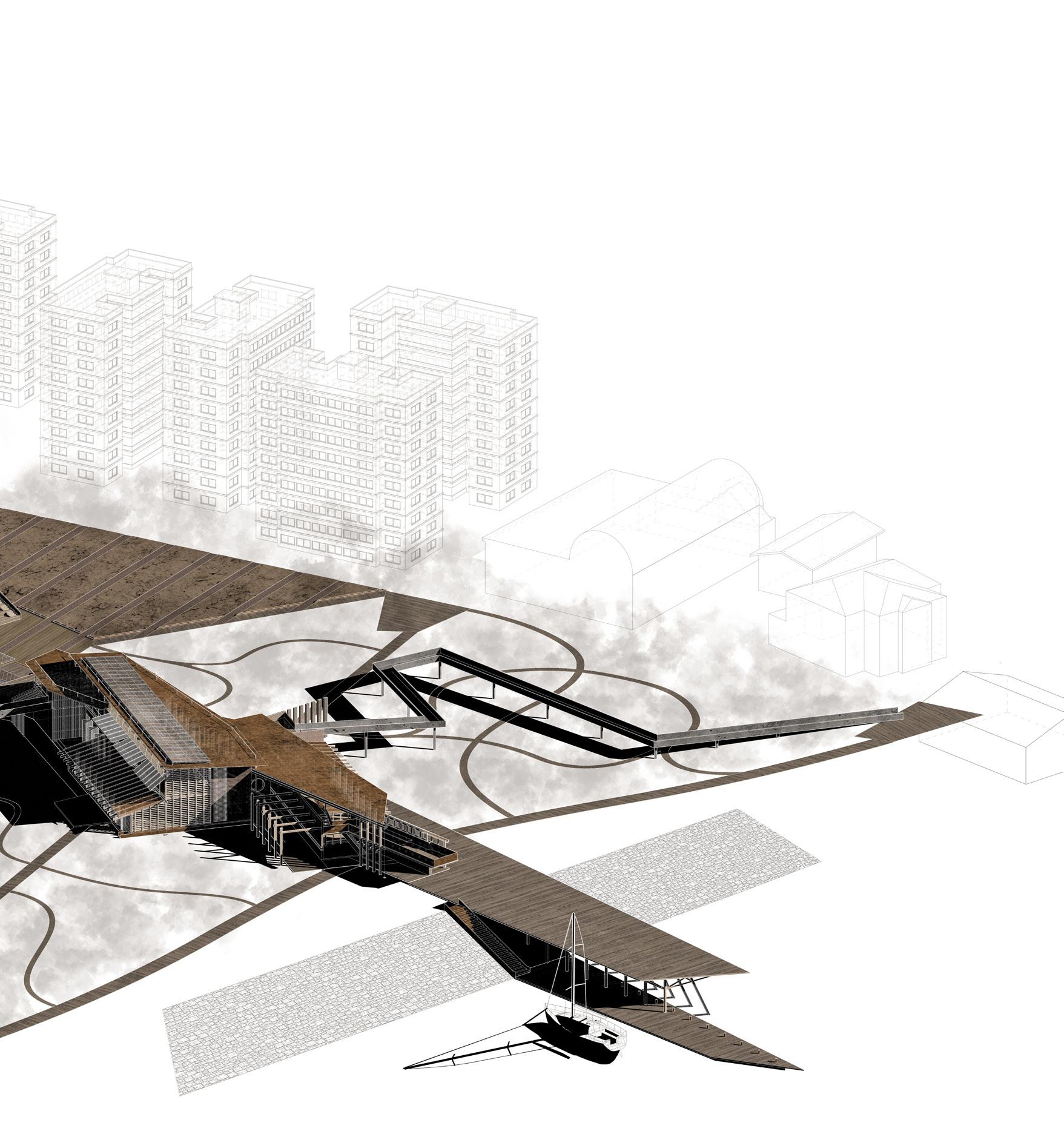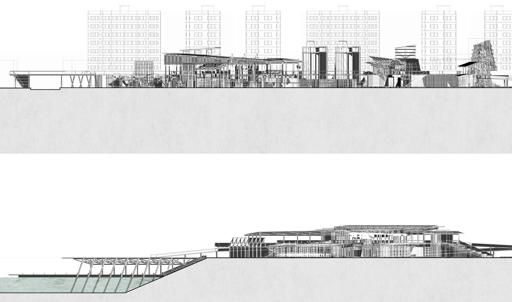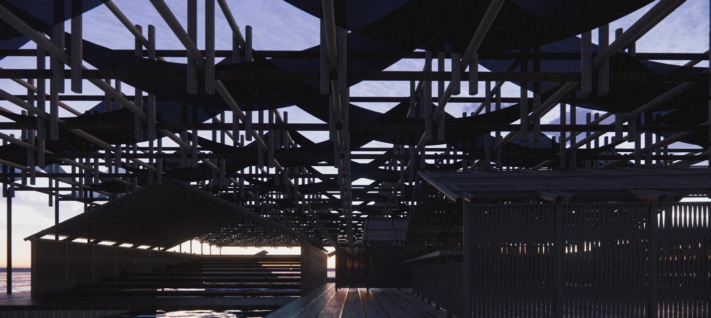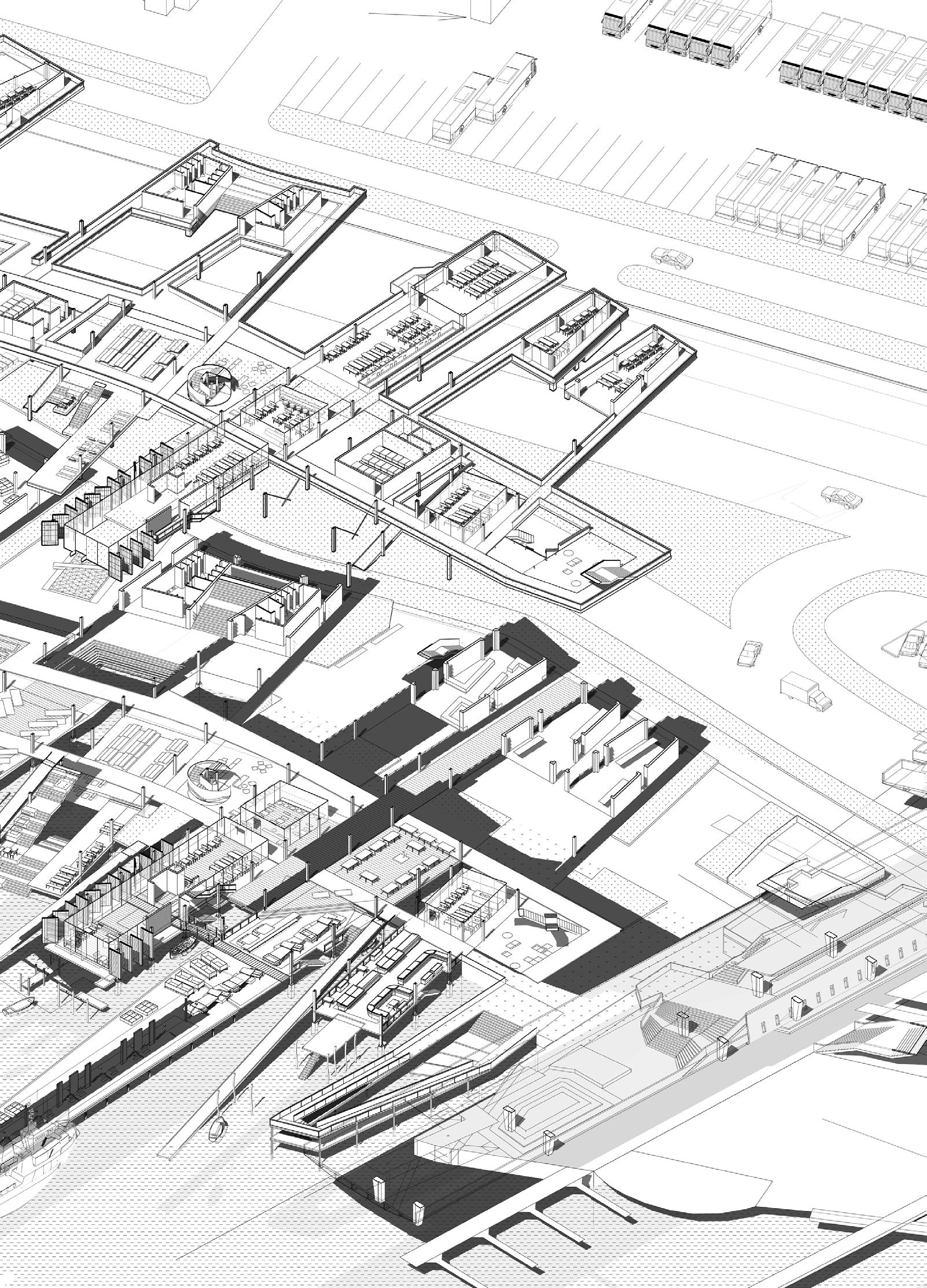 The project proposes a sequence of architectures including fish markets, fish processing stations, restaurants, and recreational areas. These spaces spill into the seafront whilst creating docks and small harbours for independent fishing boats. Interspersed with voids and shaded sites of water, people experience the transformation of the city in a constant state of alternation – moving from cityscape to seascape.