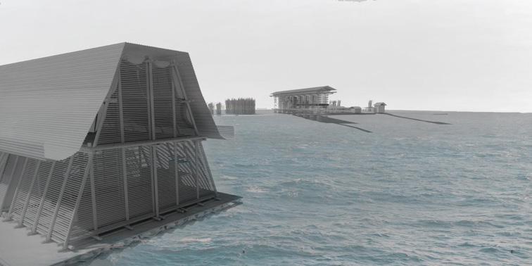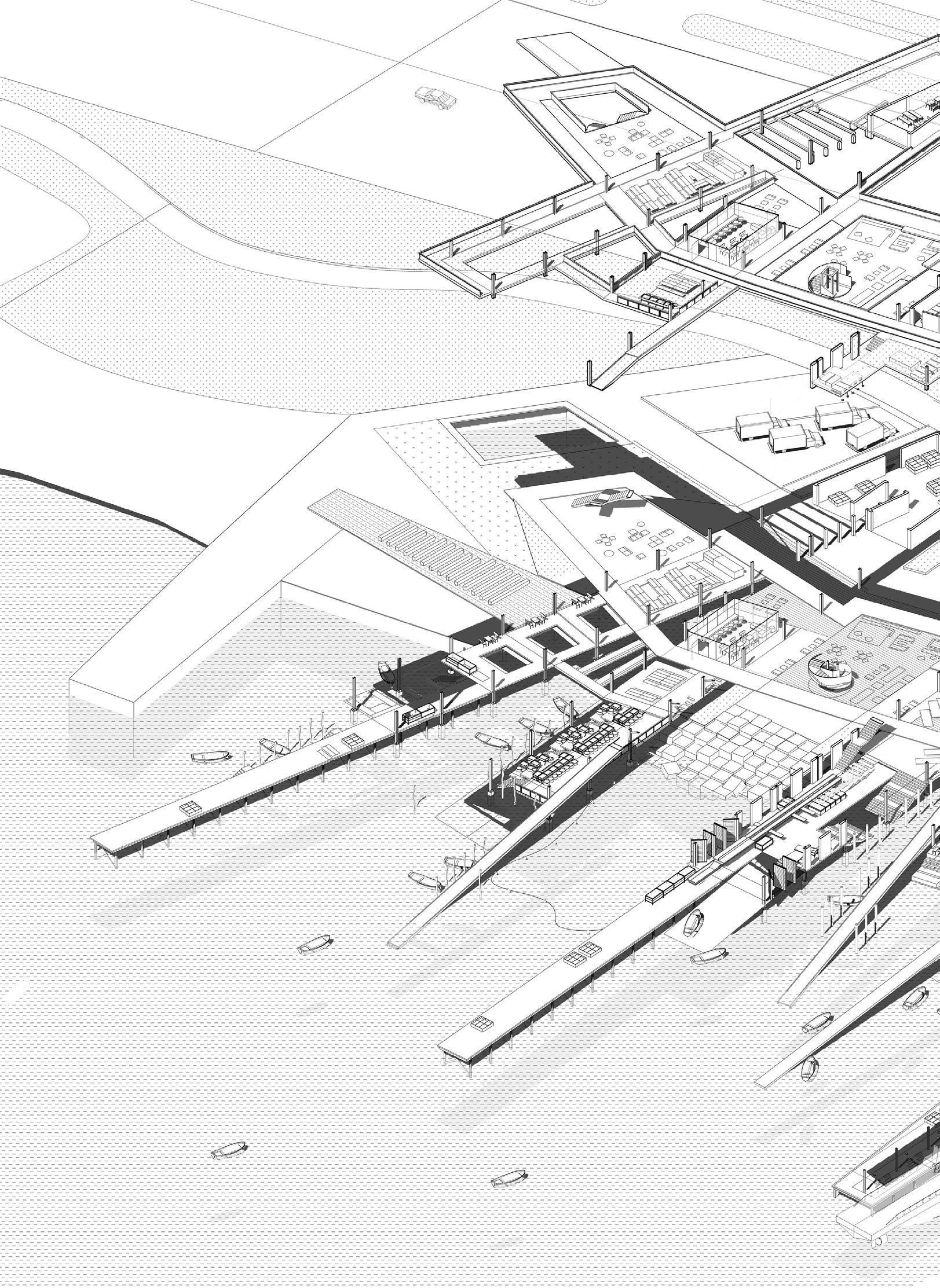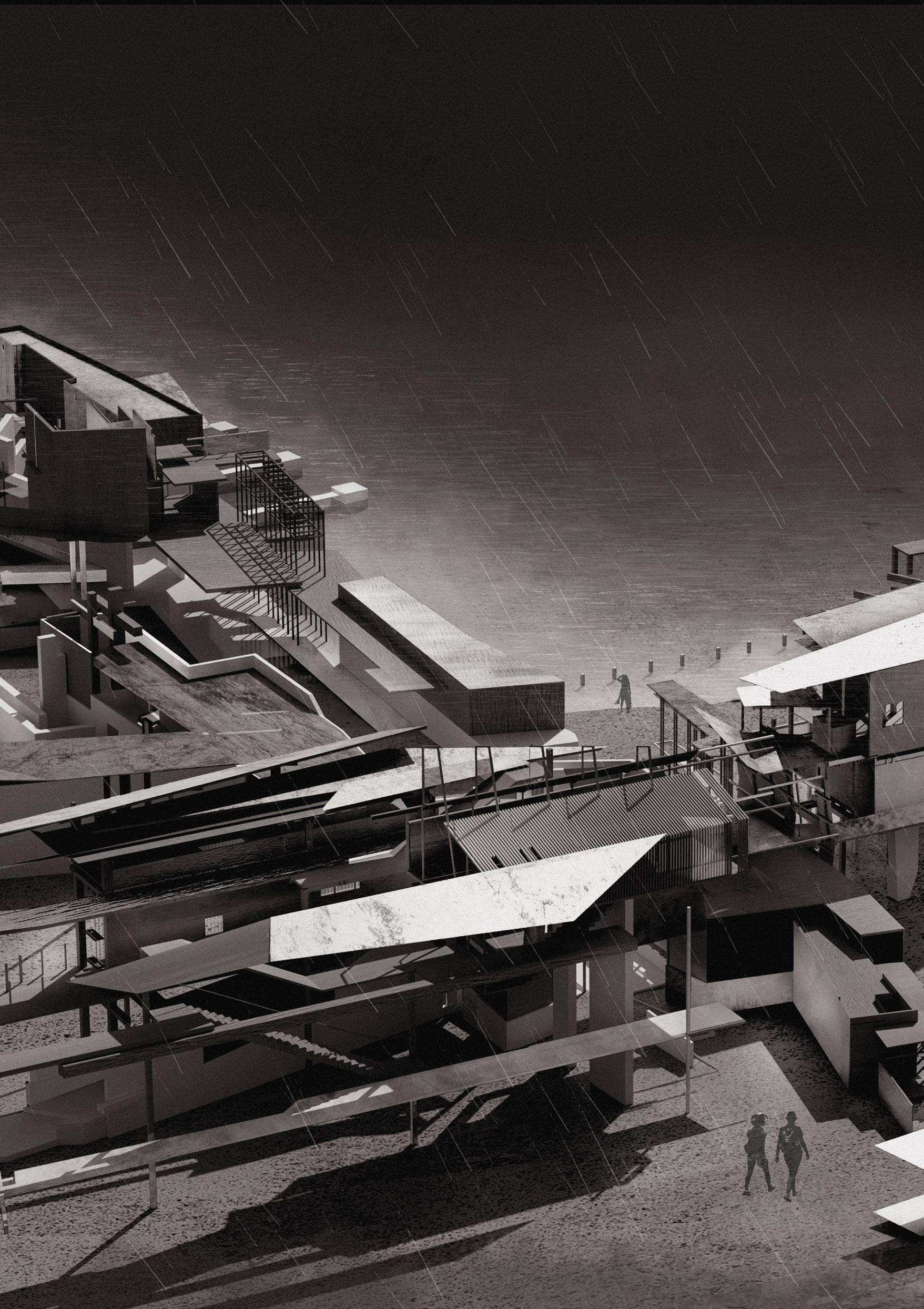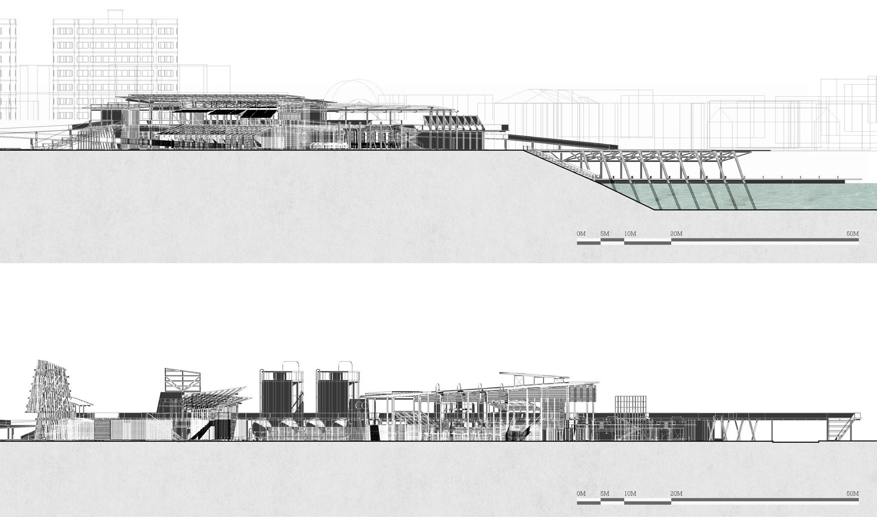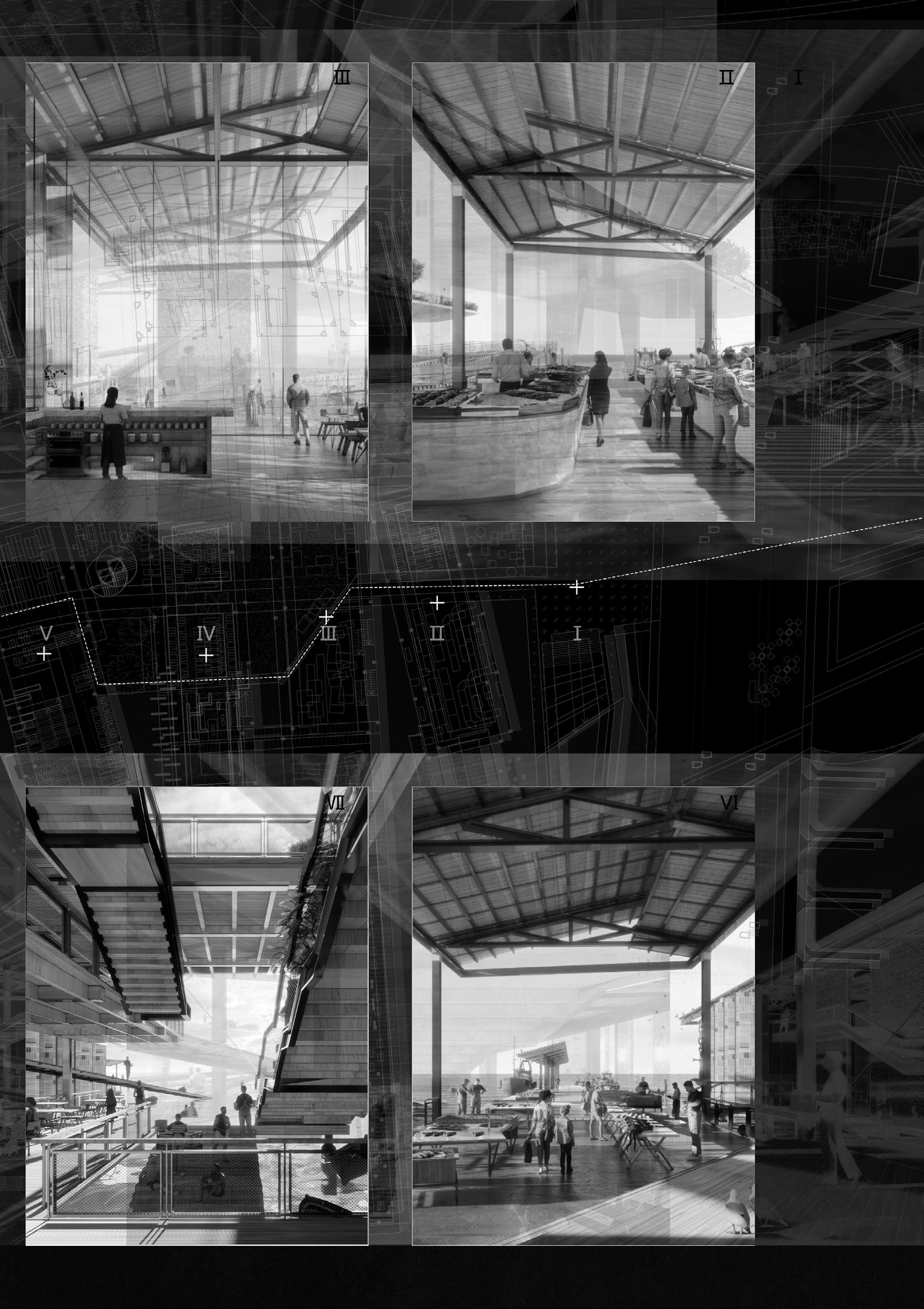 The project proposes a sequence of architectures including fish markets, fish processing stations, restaurants, and recreational areas. These spaces spill into the seafront whilst creating docks and small harbours for independent fishing boats. Interspersed with voids and shaded sites of water, people experience the transformation of the city in a constant state of alternation – moving from cityscape to seascape.