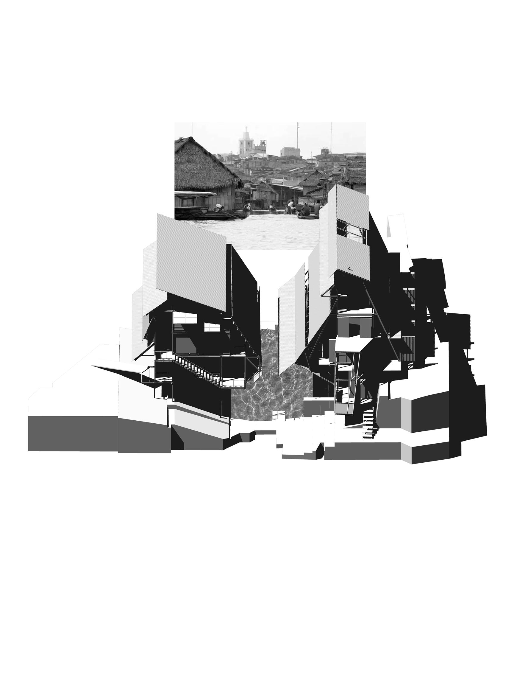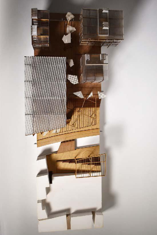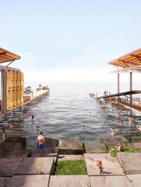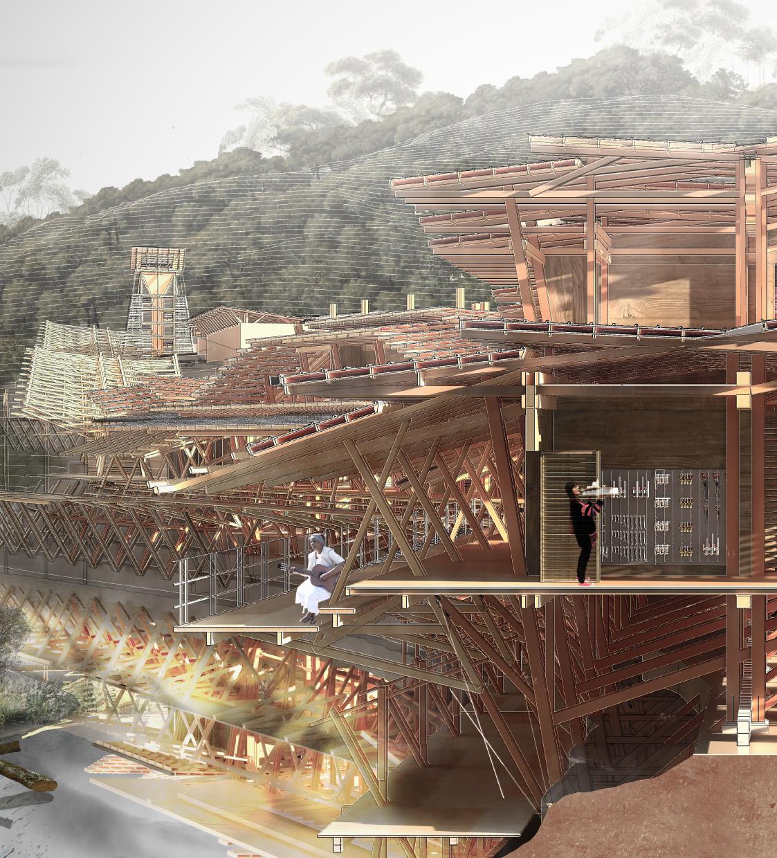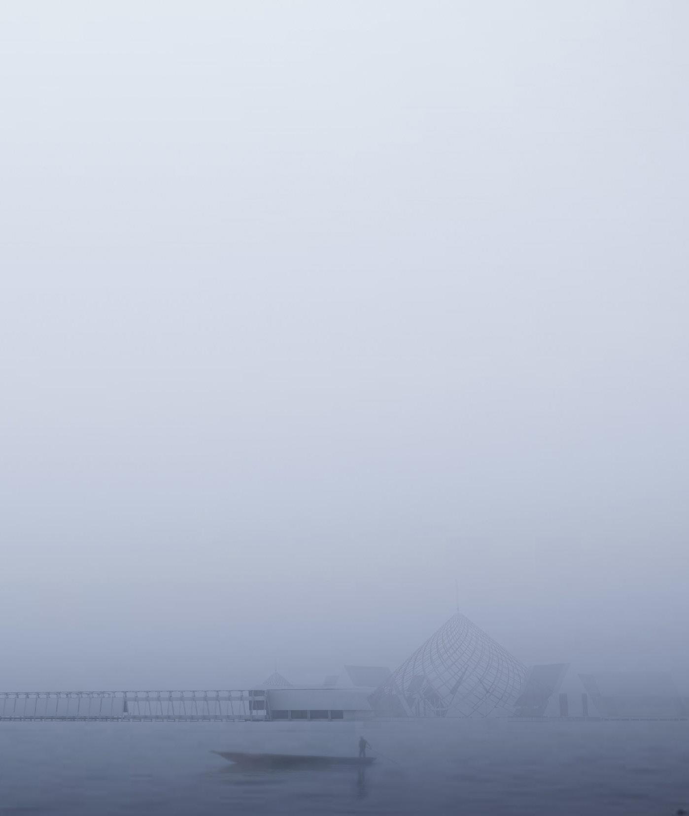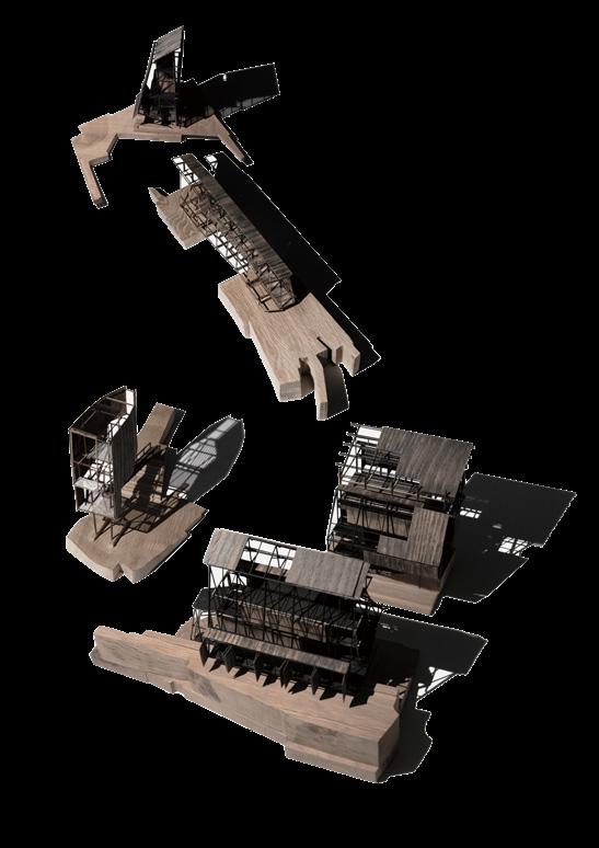 address the future settlement of the indigenous Guna community and the preservation of its memory. Esmeralda Lau has designed a drying facility and depot for local materials to support the construction of new floating houses, while Hong Yu imagines a new community anchored to the flooded site, whose civic infrastructures reflect the settlement pattern on the coral island below. Bryce Liang takes another approach, designing a new cultural facility and temporary residence for the Guna on the waterfront of Colón, the city at the Atlantic entrance to the canal. National water politics are brought into focus in Georgina Stewart-Fleming’s ‘Water Council’ project. Near the heritage site Panamá Viejo in Panamá City, this takes the form of a delicate inhabited urban-scale roof that shelters the ground below. Noa Barak’s design tackles water pollution in the tidal basin of Boca La Caja, providing facilities and a new civic hub for this informal fishing community located at the foot of the city’s financial district. Sean Alavazo crosses instrumental and symbolic programmes, with a project of flood retention that also acts as an enigmatic cathedral for the collective observances of Afro-Panamanian religions.
