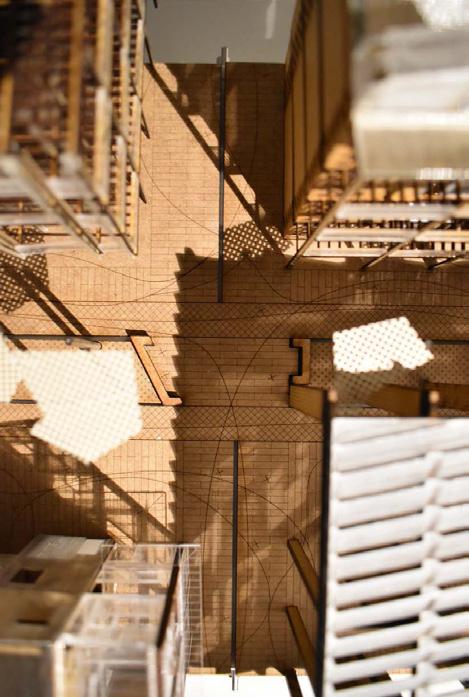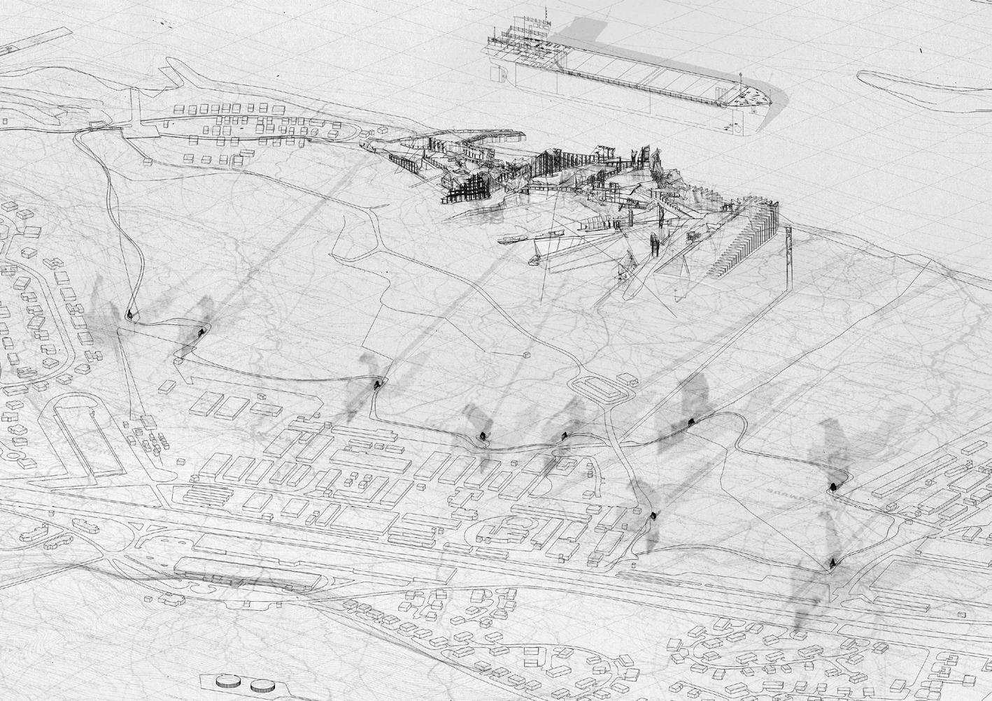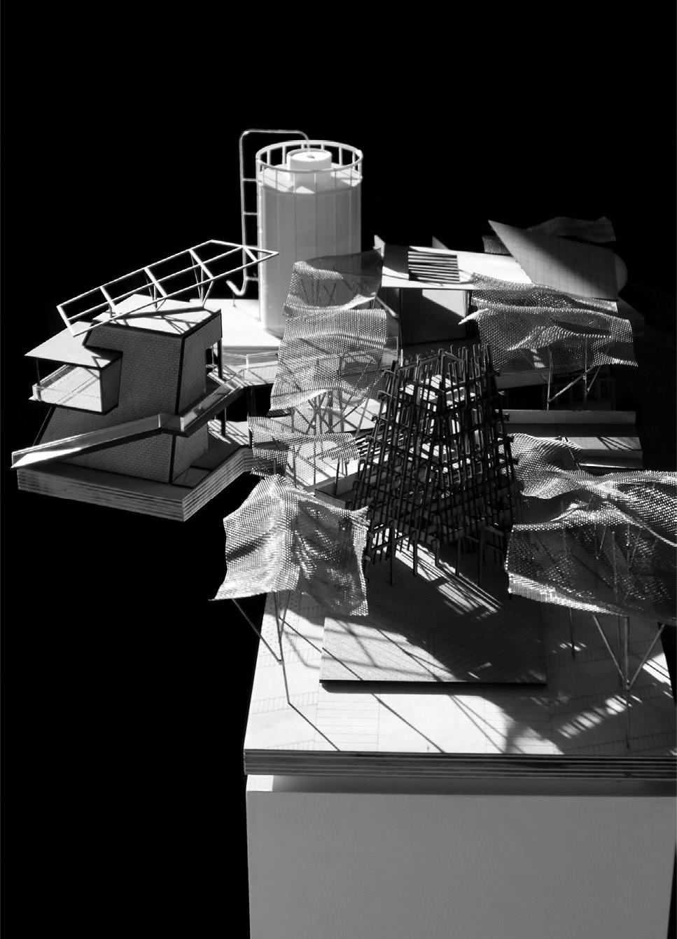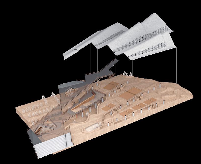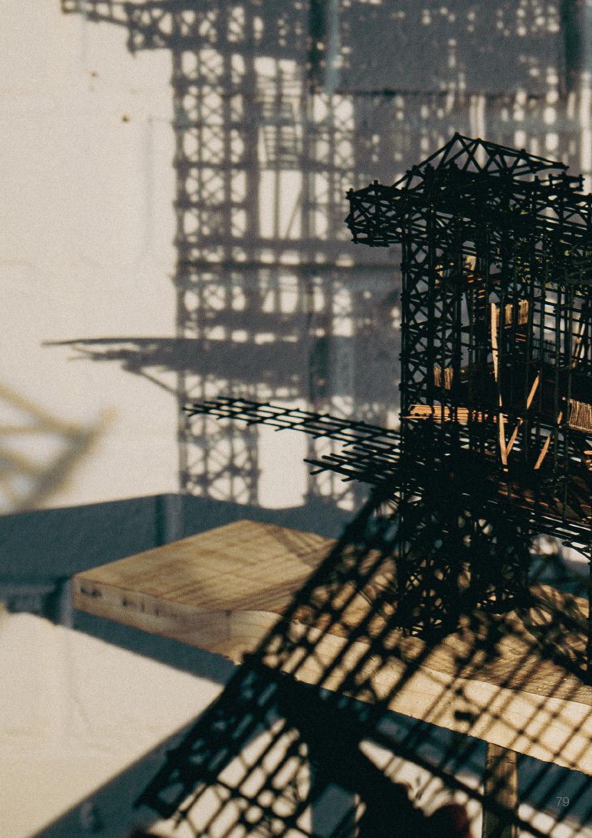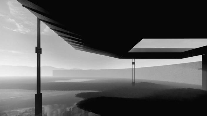 address the future settlement of the indigenous Guna community and the preservation of its memory. Esmeralda Lau has designed a drying facility and depot for local materials to support the construction of new floating houses, while Hong Yu imagines a new community anchored to the flooded site, whose civic infrastructures reflect the settlement pattern on the coral island below. Bryce Liang takes another approach, designing a new cultural facility and temporary residence for the Guna on the waterfront of Colón, the city at the Atlantic entrance to the canal. National water politics are brought into focus in Georgina Stewart-Fleming’s ‘Water Council’ project. Near the heritage site Panamá Viejo in Panamá City, this takes the form of a delicate inhabited urban-scale roof that shelters the ground below. Noa Barak’s design tackles water pollution in the tidal basin of Boca La Caja, providing facilities and a new civic hub for this informal fishing community located at the foot of the city’s financial district. Sean Alavazo crosses instrumental and symbolic programmes, with a project of flood retention that also acts as an enigmatic cathedral for the collective observances of Afro-Panamanian religions.