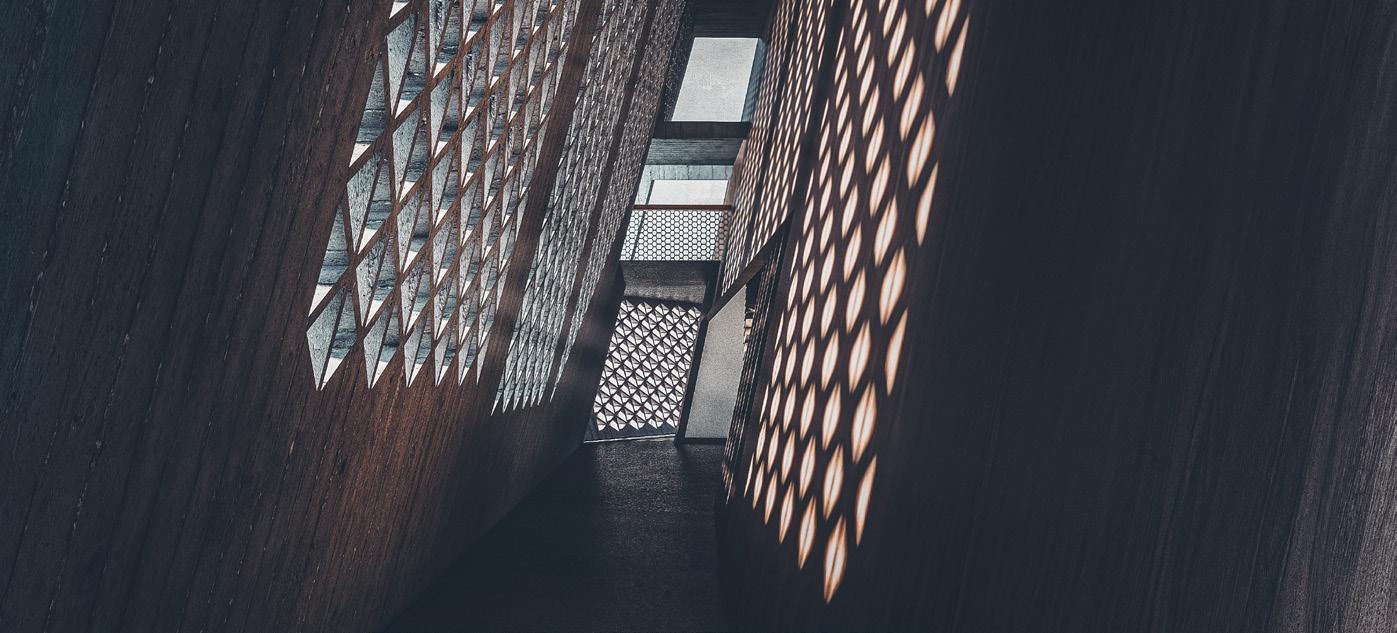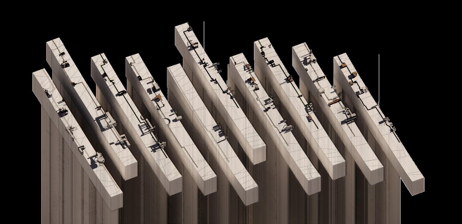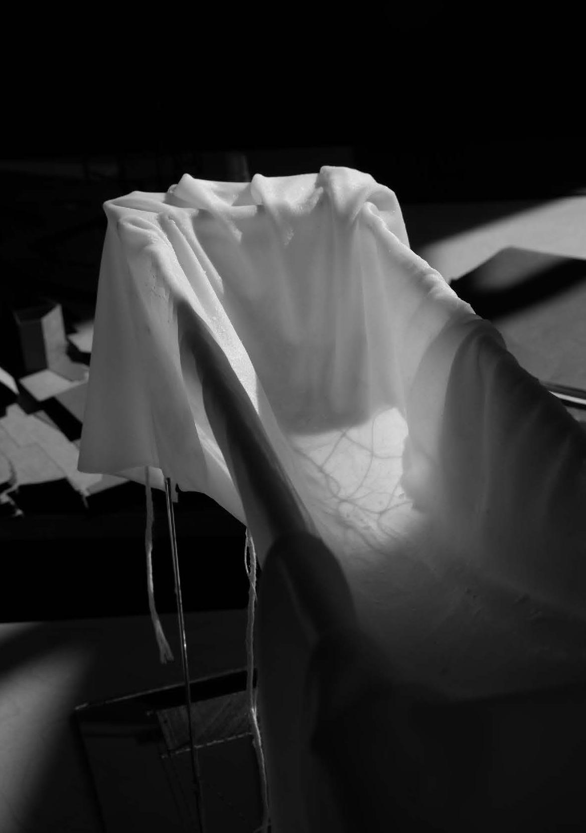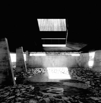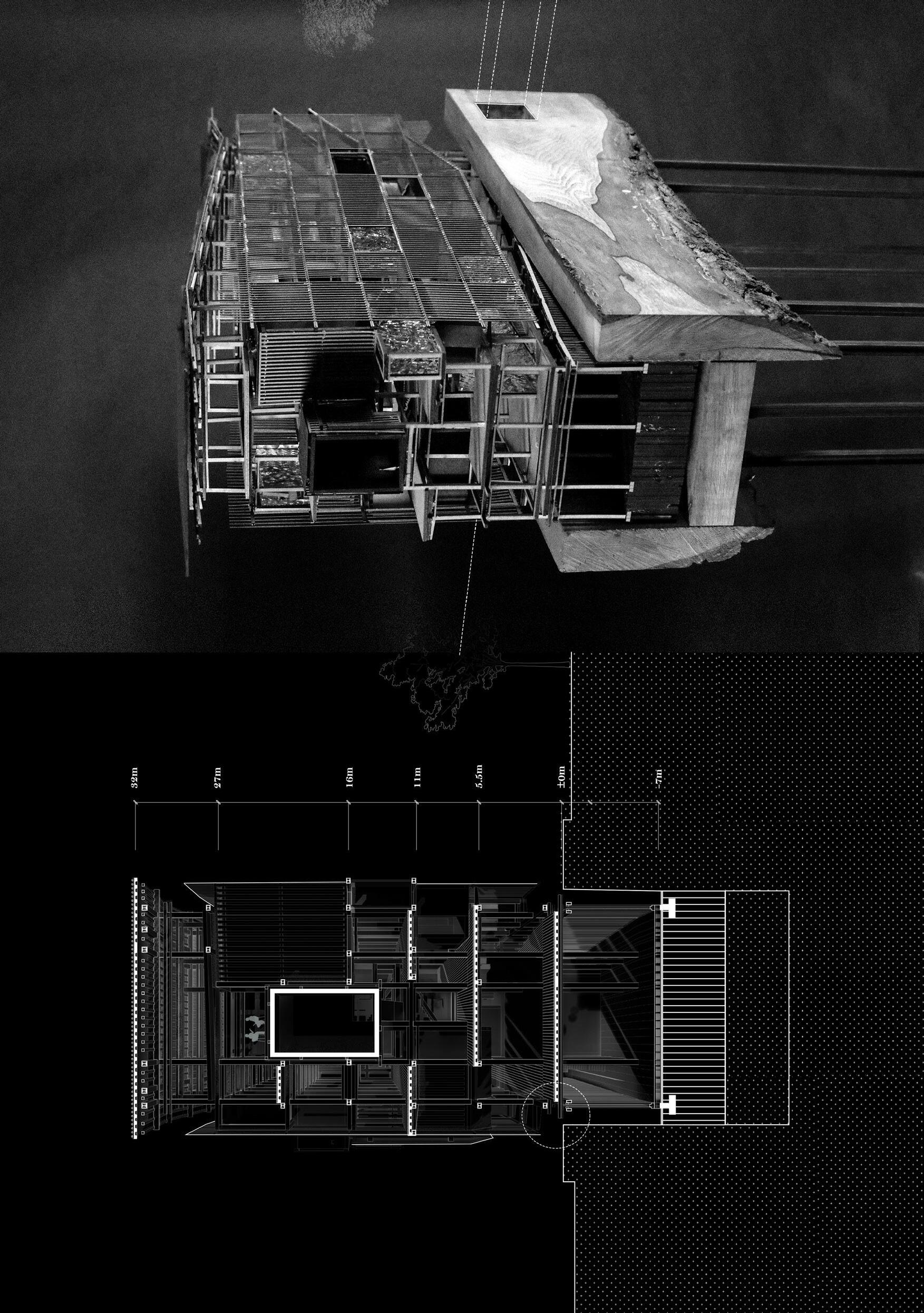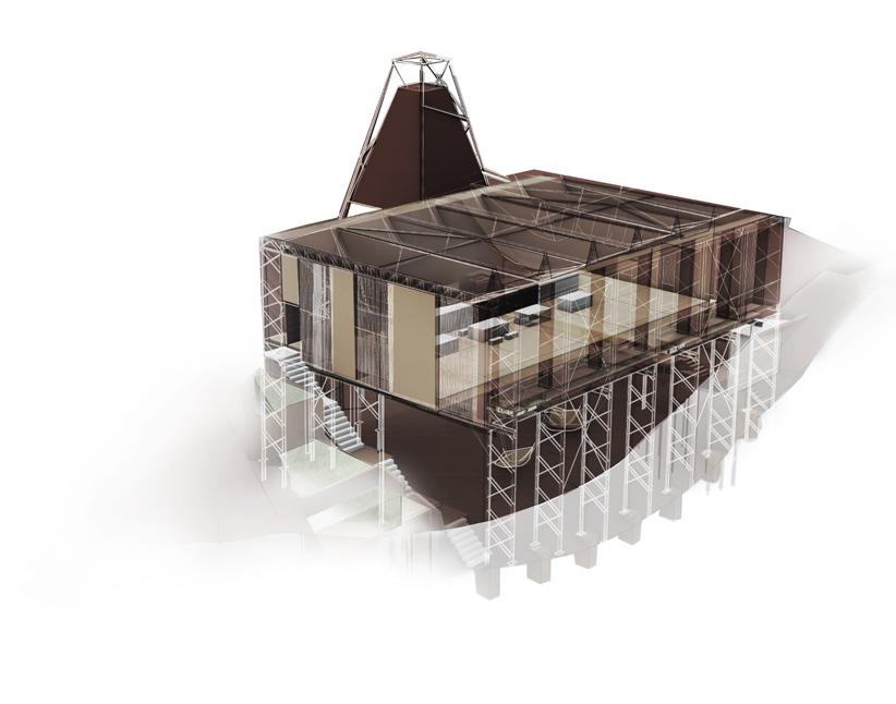 address the future settlement of the indigenous Guna community and the preservation of its memory. Esmeralda Lau has designed a drying facility and depot for local materials to support the construction of new floating houses, while Hong Yu imagines a new community anchored to the flooded site, whose civic infrastructures reflect the settlement pattern on the coral island below. Bryce Liang takes another approach, designing a new cultural facility and temporary residence for the Guna on the waterfront of Colón, the city at the Atlantic entrance to the canal. National water politics are brought into focus in Georgina Stewart-Fleming’s ‘Water Council’ project. Near the heritage site Panamá Viejo in Panamá City, this takes the form of a delicate inhabited urban-scale roof that shelters the ground below. Noa Barak’s design tackles water pollution in the tidal basin of Boca La Caja, providing facilities and a new civic hub for this informal fishing community located at the foot of the city’s financial district. Sean Alavazo crosses instrumental and symbolic programmes, with a project of flood retention that also acts as an enigmatic cathedral for the collective observances of Afro-Panamanian religions.