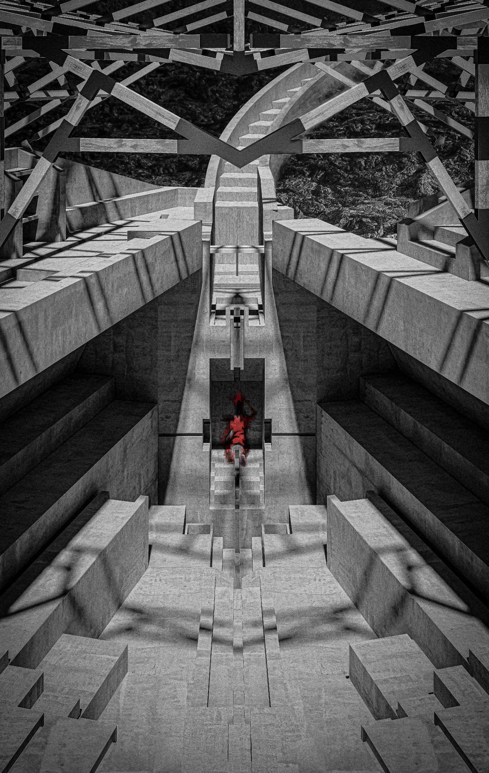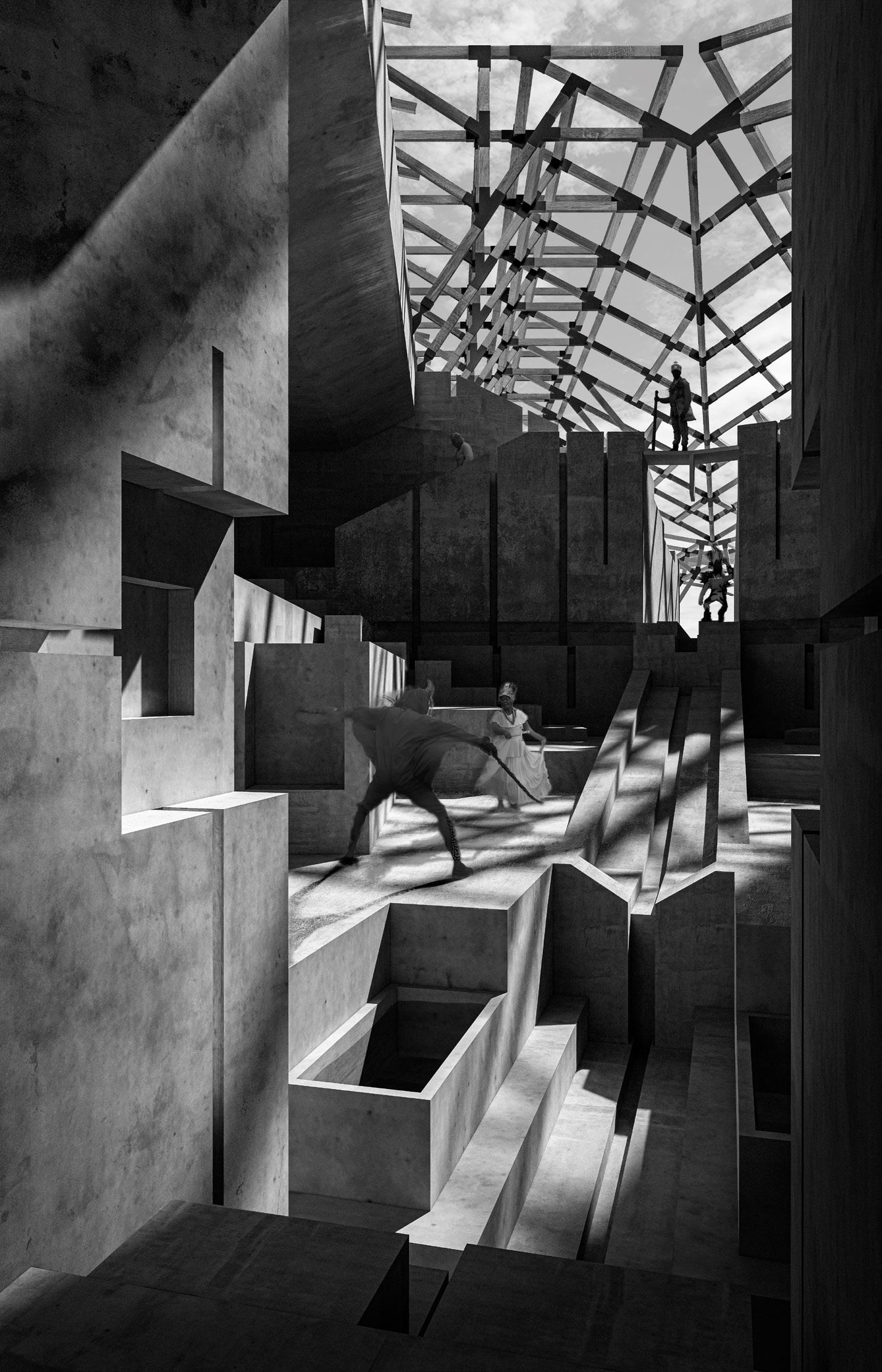 At the top of the valley, the cathedral latches onto the rising ground. The project is inspired by the heroic acts of the sixteenth-century King Bayano, a leader of the Yoruba community in the Gulf of Guinea who was enslaved but came to lead the Cimmarones (slave rebels), taking refuge in the mountainous region of Panamá. The cathedral re-enacts the King’s actions and provides a place of worship, gathering and contemplation. Routing the cleansing water collected in the valley – channelling it by constructed steps into a central stepwell – a space is composed to enable ‘El Diablo’ to be again performed on water.