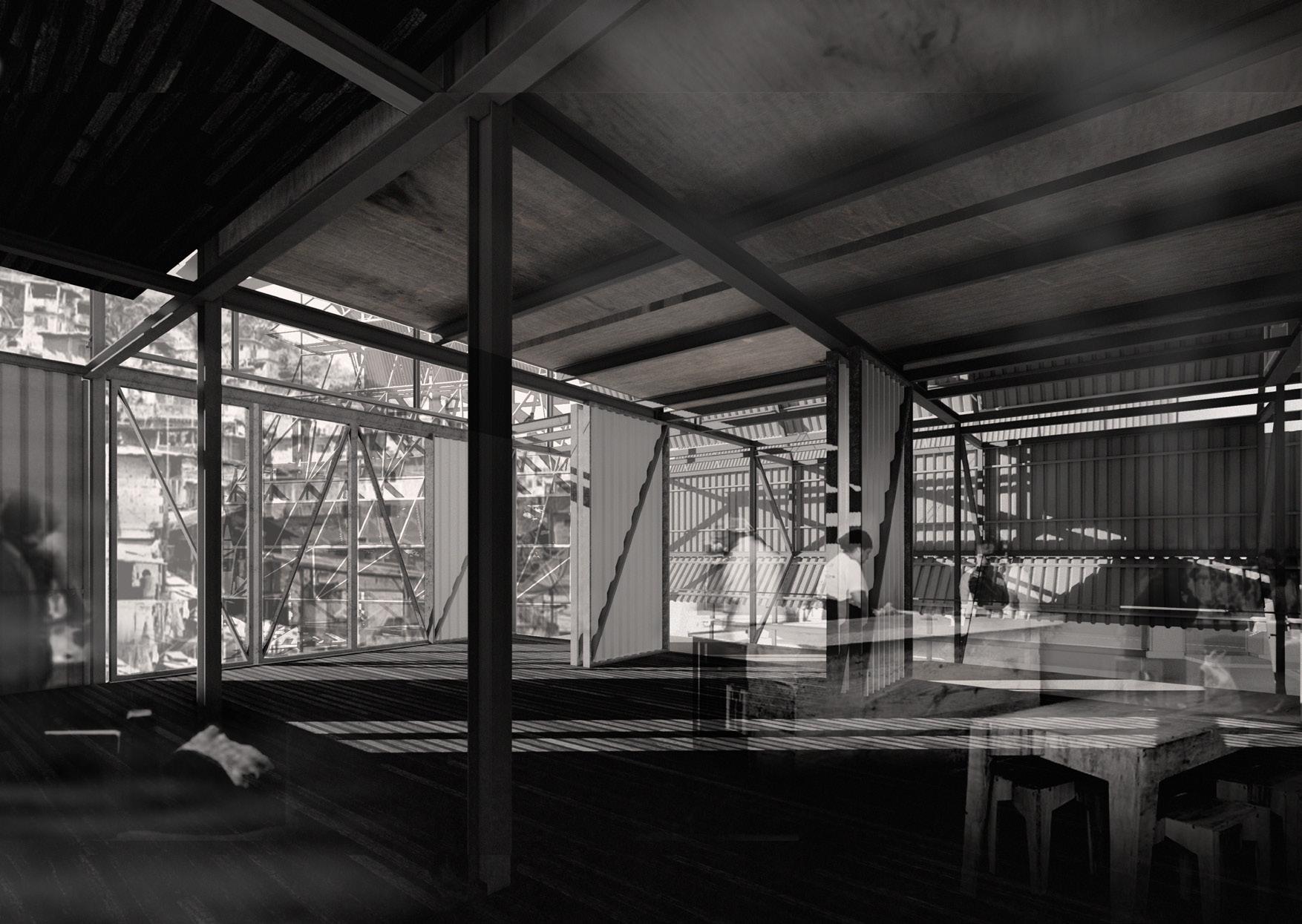 San Miguelito is one of the most densely populated districts in Panamá. As one of several urban interventions along the Abajo river, this project proposes a series of architectures which respond to the seasonal flood and drought experienced by the local communities. A water tower, a community kitchen and six flood shelters are located within a valley (adjacent to the San Miguelito metro station), making use of the natural topography to harvest, store and distribute rain water. The temporal flood shelters can also be used as day-care classrooms in cooperation with and supported by the community kitchen.