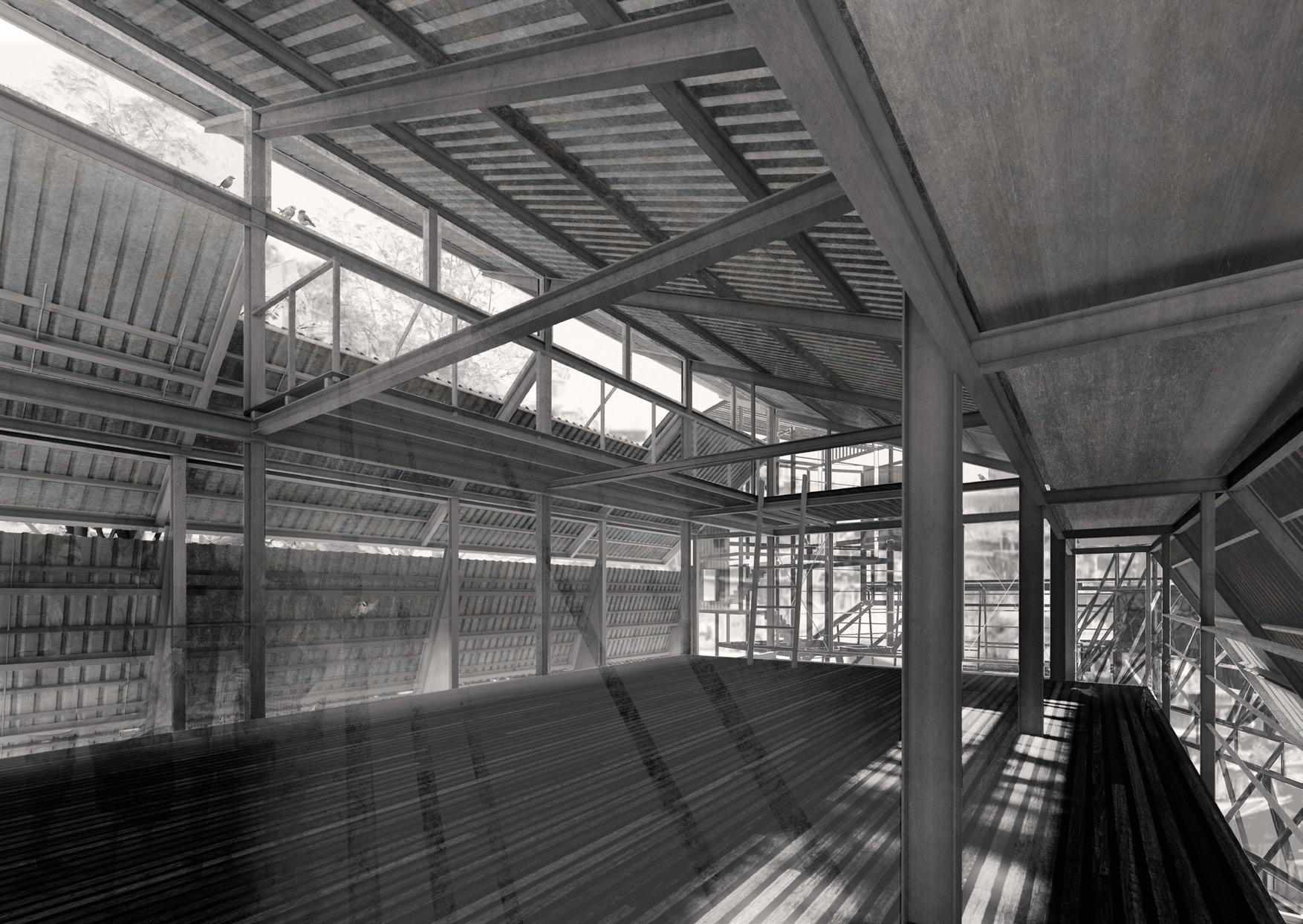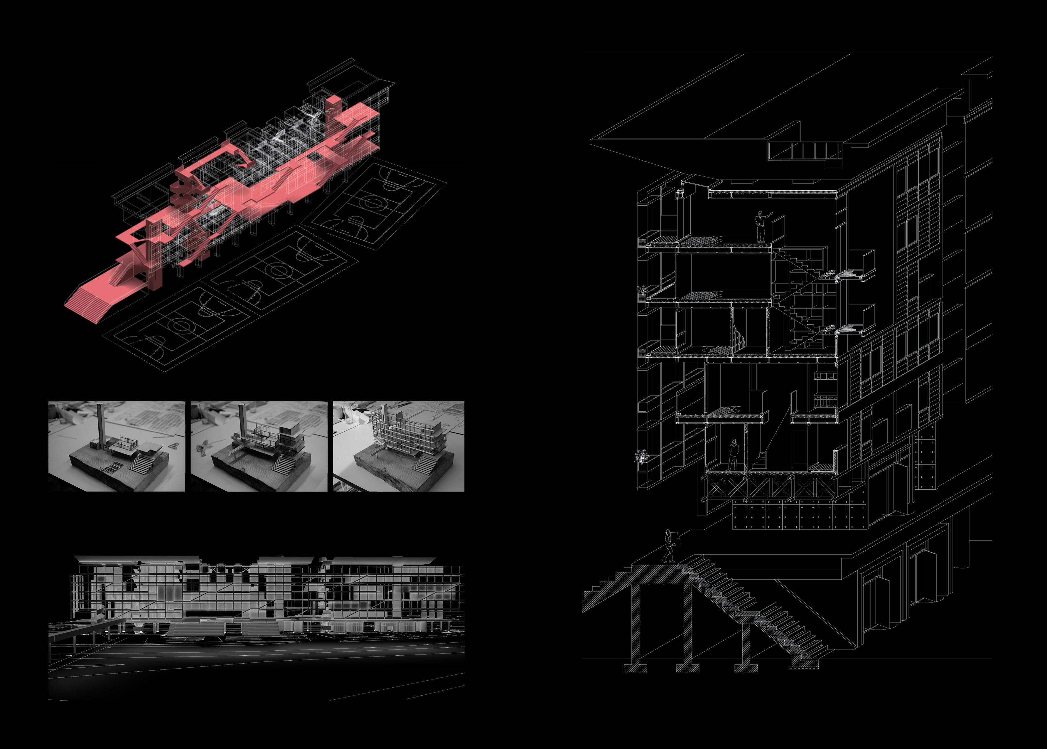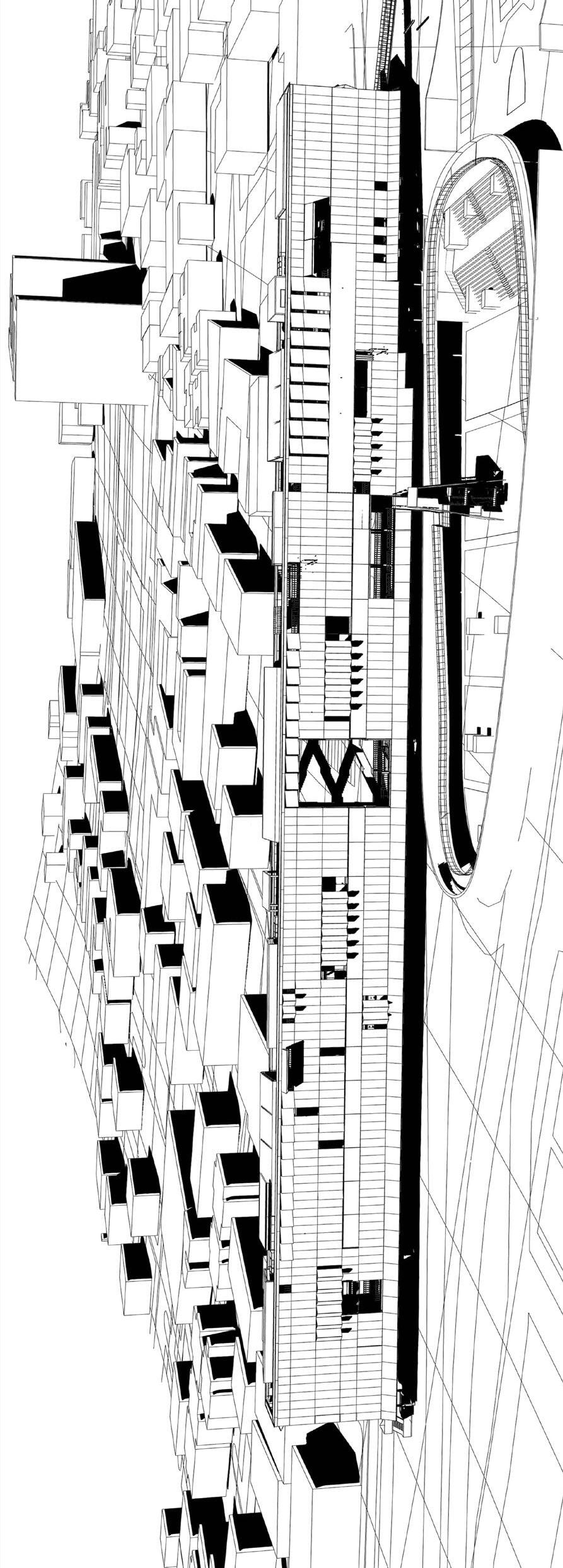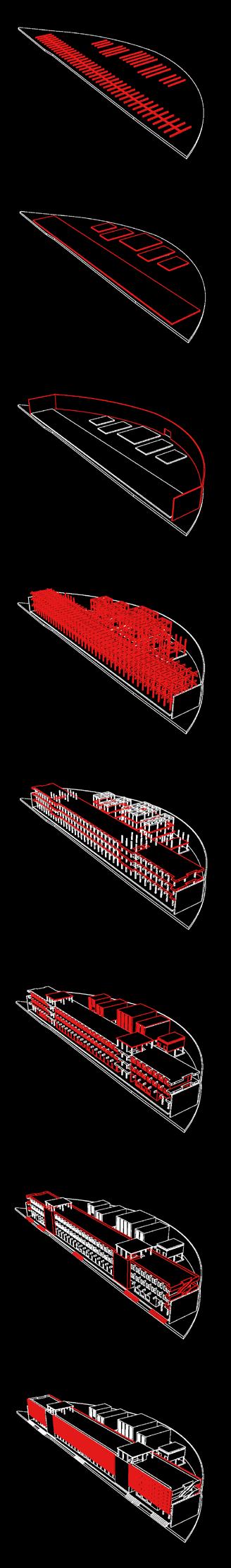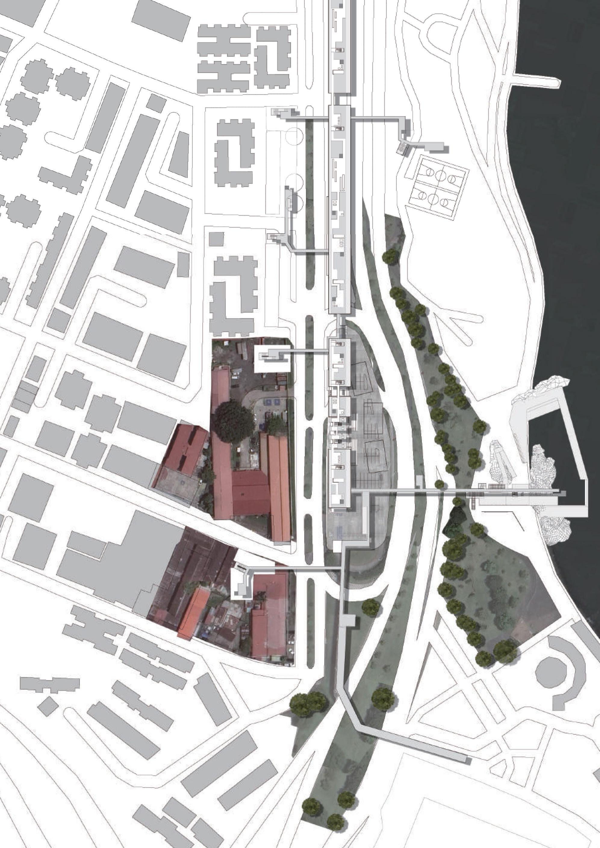 EL Chorrillo in Panamá City is a place animated by contrasting scales: the huge cargo ships approaching the mouth of the canal and the sizeable piles of containers on its docks; the backdrop of high-rise buildings in the city’s financial district; the metropolitan stadium, the linear coastal park and the highways running on the waterfront; as well as the narrow alleyways and low-rise constructions that shelter urban life and give identity to the historic city. Sitting along the southern boundary of El Chorrillo by the highway Cinta Costera, the proposal tackles the marginalization of this community and negotiates the global, metropolitan and local scales that meet on the site. Challenging the closed and detached world of vessels and the global logistics to which they belong, Ship Breaking aims to animate this urban enclave by reconnecting current segregated areas such as the coastal park and the stadium with the city centre’s public facilities and spaces, as well as by enhancing the provision of affordable housing and giving access to a range of leisure facilities for this community. A large screen and a garden roof shelter a suite of housing types and diverse cultural programmes and lend an urban presence to this linear and porous infrastructure. Bridges and pedestrian walkways across the highways connect the community areas within the block with the surrounding public spaces and with the new harbour swimming pool that activates the coastal park.