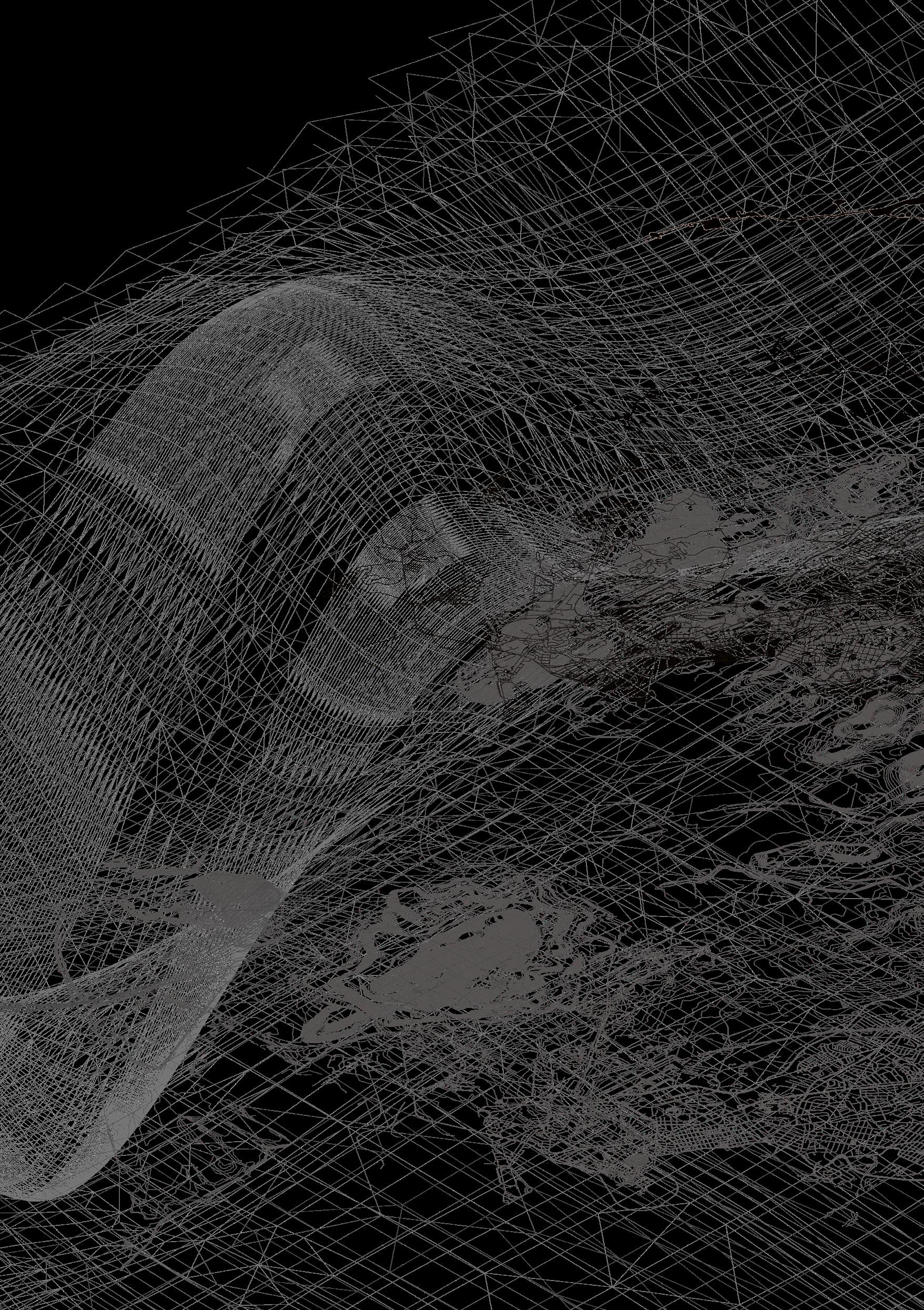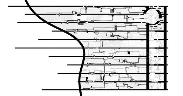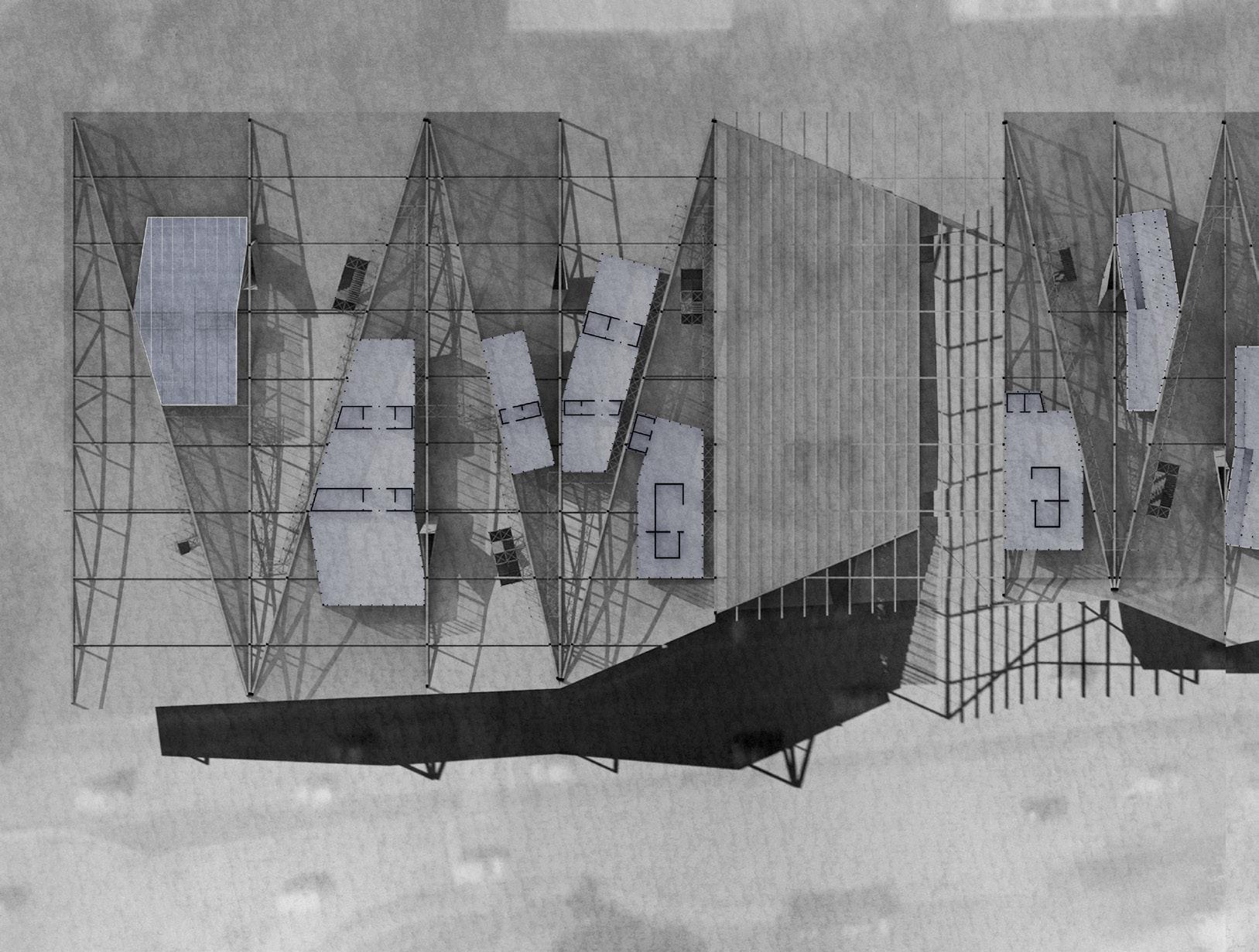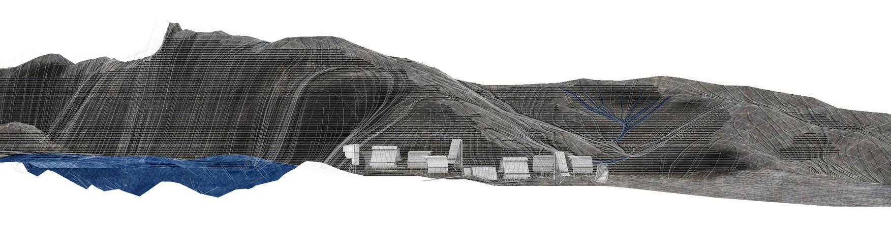 Situated on a long strip that runs parallel to Avenida Cincuentenario, a busy dual carriageway and a crossing point of the Rio Abajo river, I propose a hydrographic facility that incorporates a civic element. Central to the proposition is an undulating roof. Spanning 245m, the roof acts as a mechanism for water capture while holding within it the main elements of the programme. The roof is conceptualised as two skins that peel apart in order to become inhabitable; thickening to create laboratories and flood monitoring stations, these nested spaces pull away from walkways that are threaded in-between.