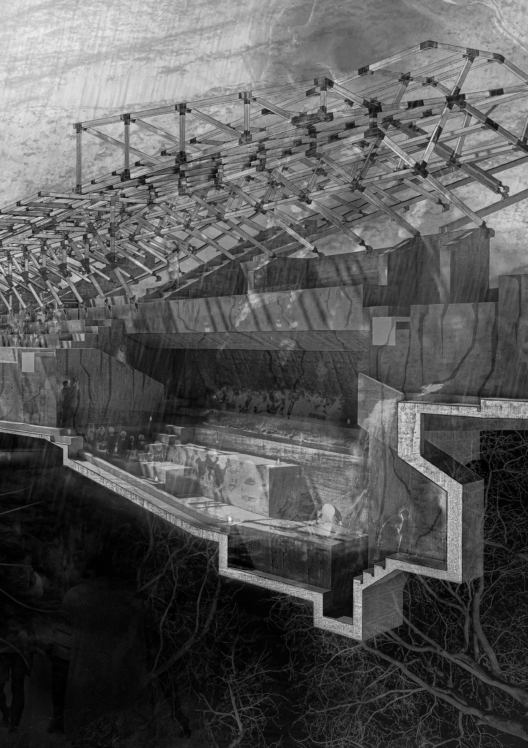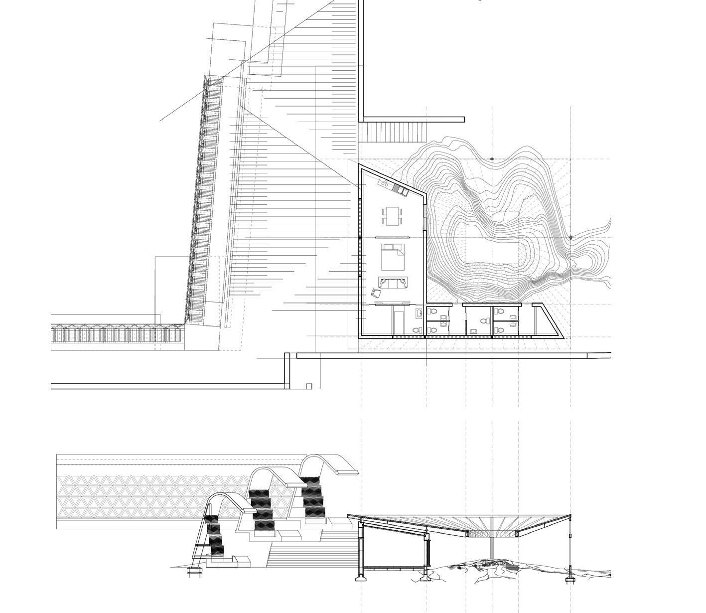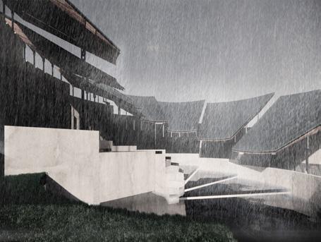 At one moment the lower skin peels down to create an auditorium; the opening allows its inhabitants to look down towards a watery ground-scape. Undulating pools for rainwater storage are excavated into the ground below. The pools’ forms take on contorted geometries as they avoid columns, stairs and routes of public space under the vast shaded area provided by the roof.