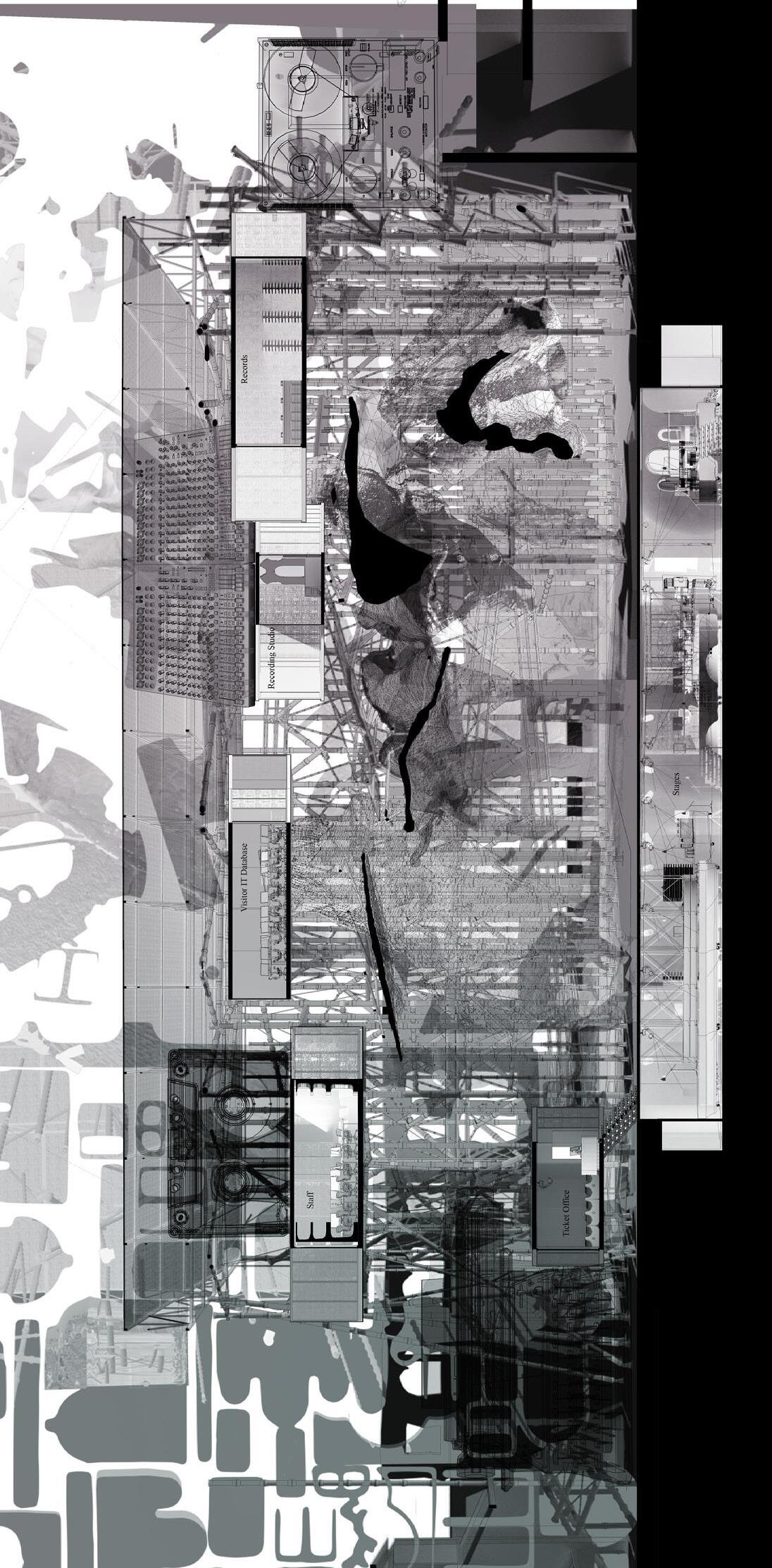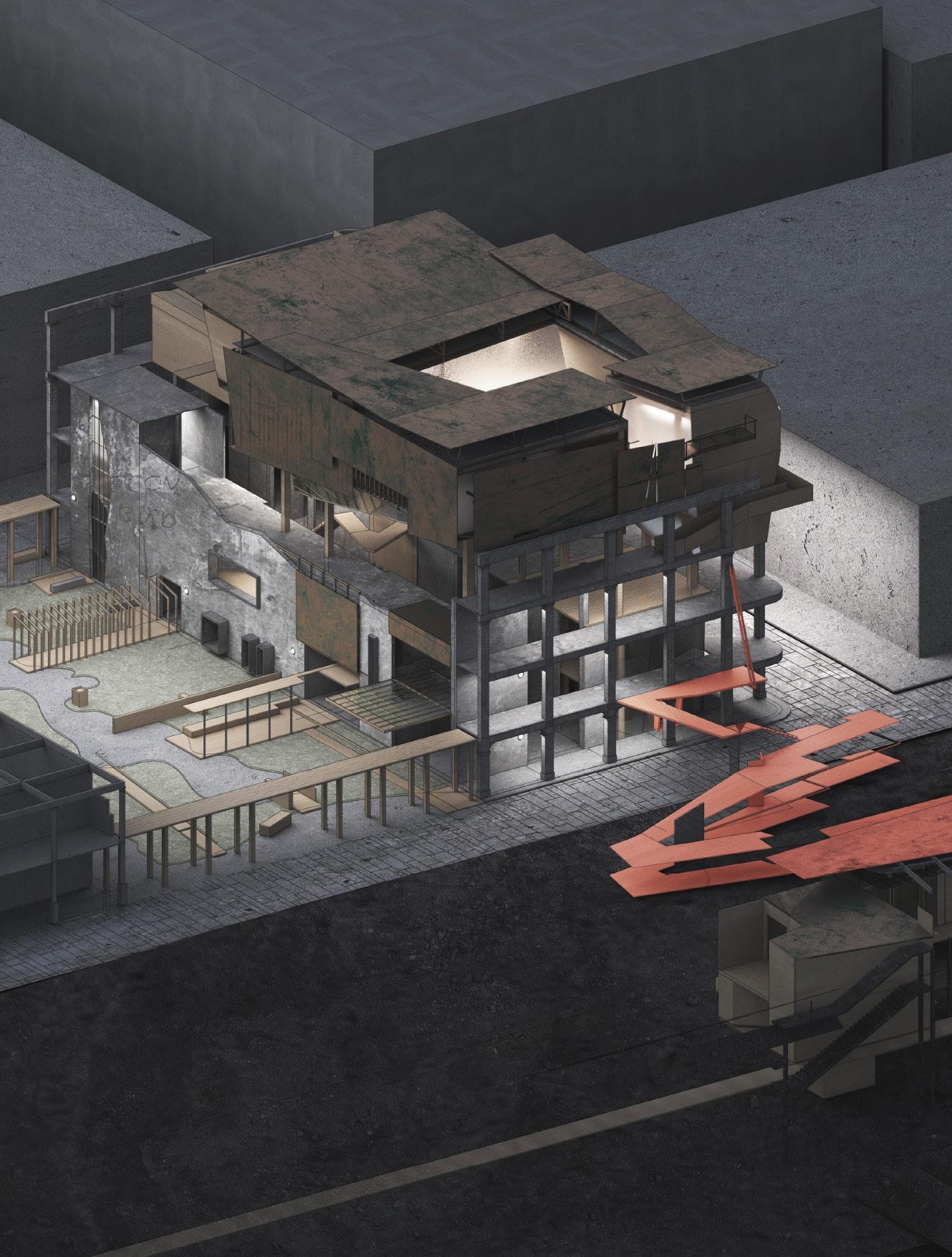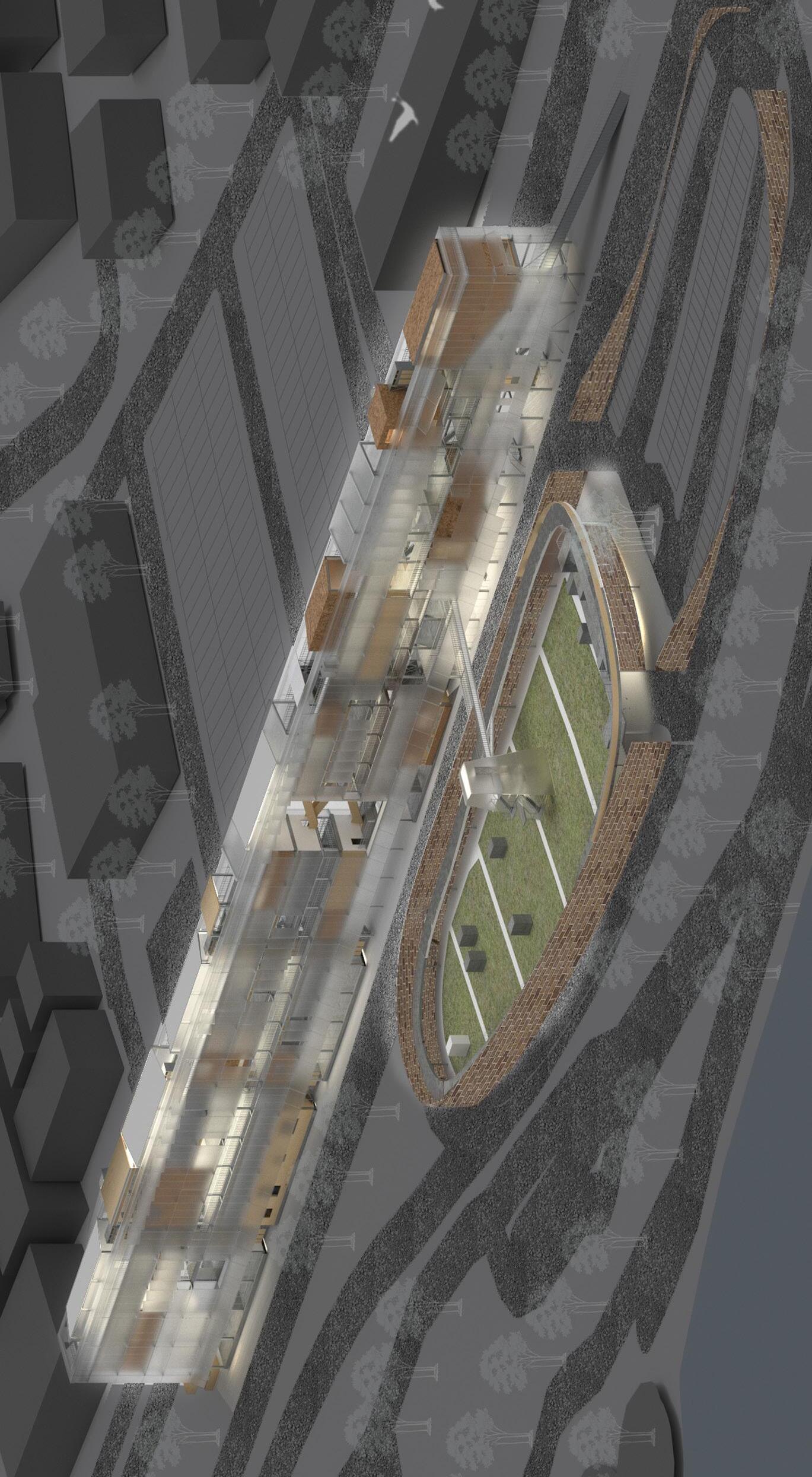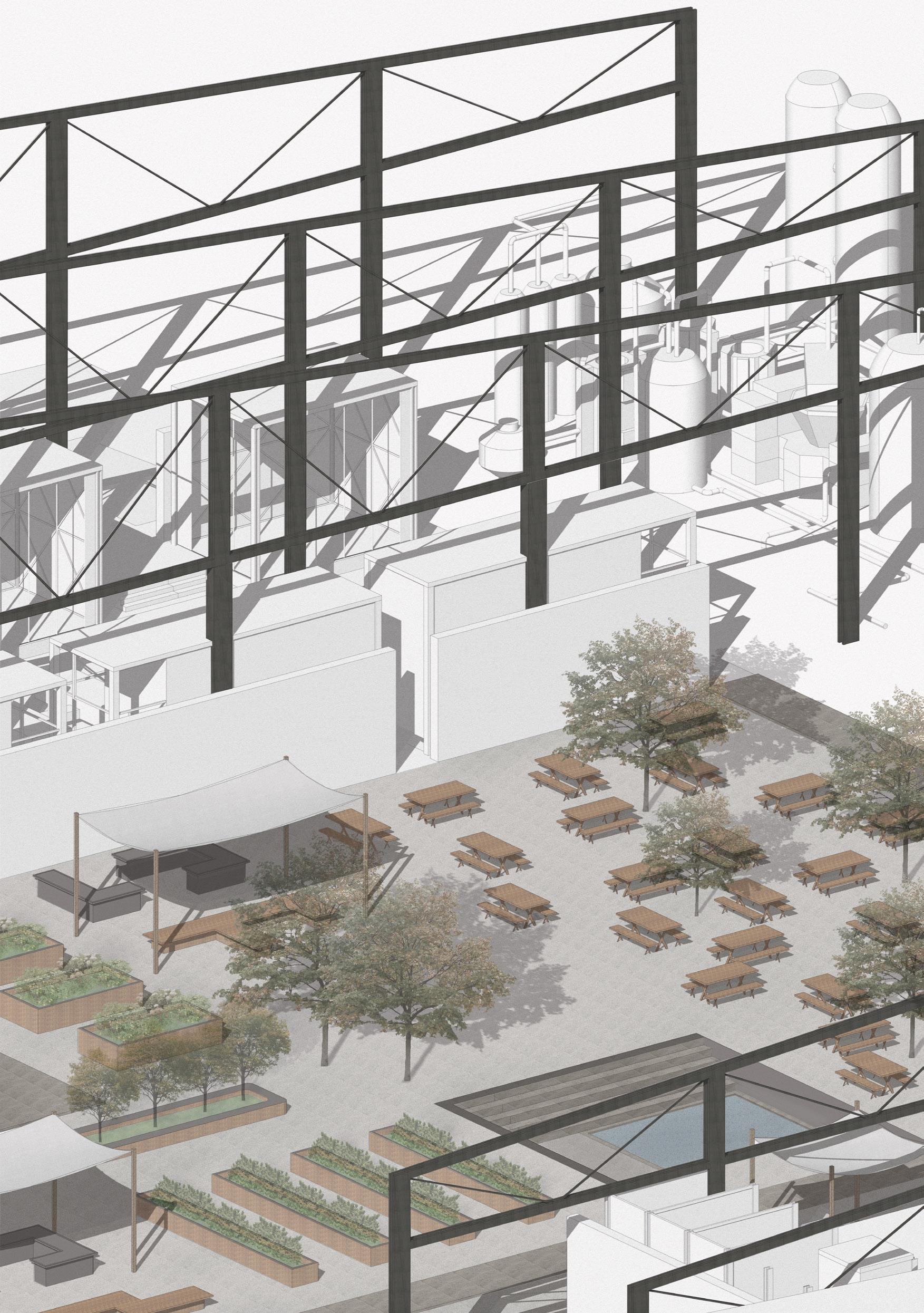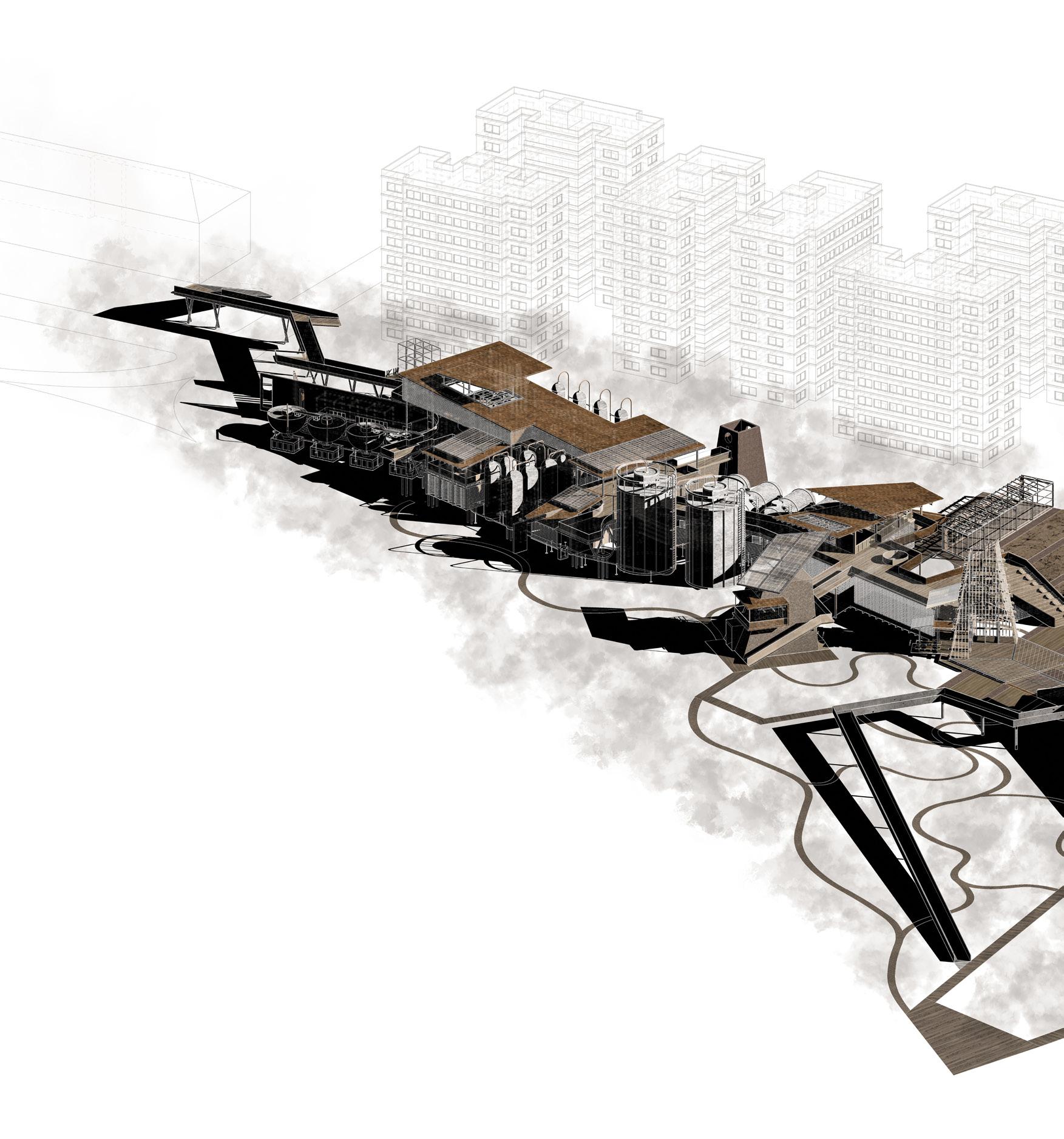 Programme: Community kitchen, performance space, urban energy hub, forest.