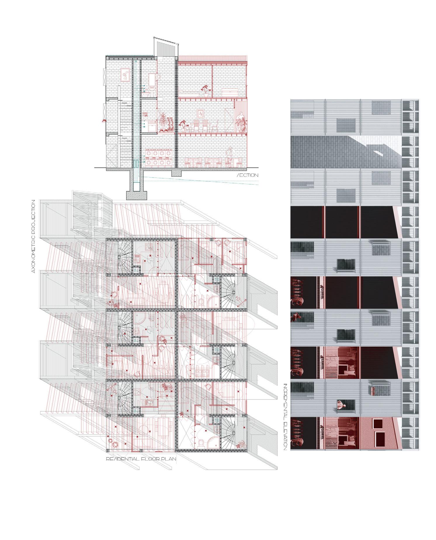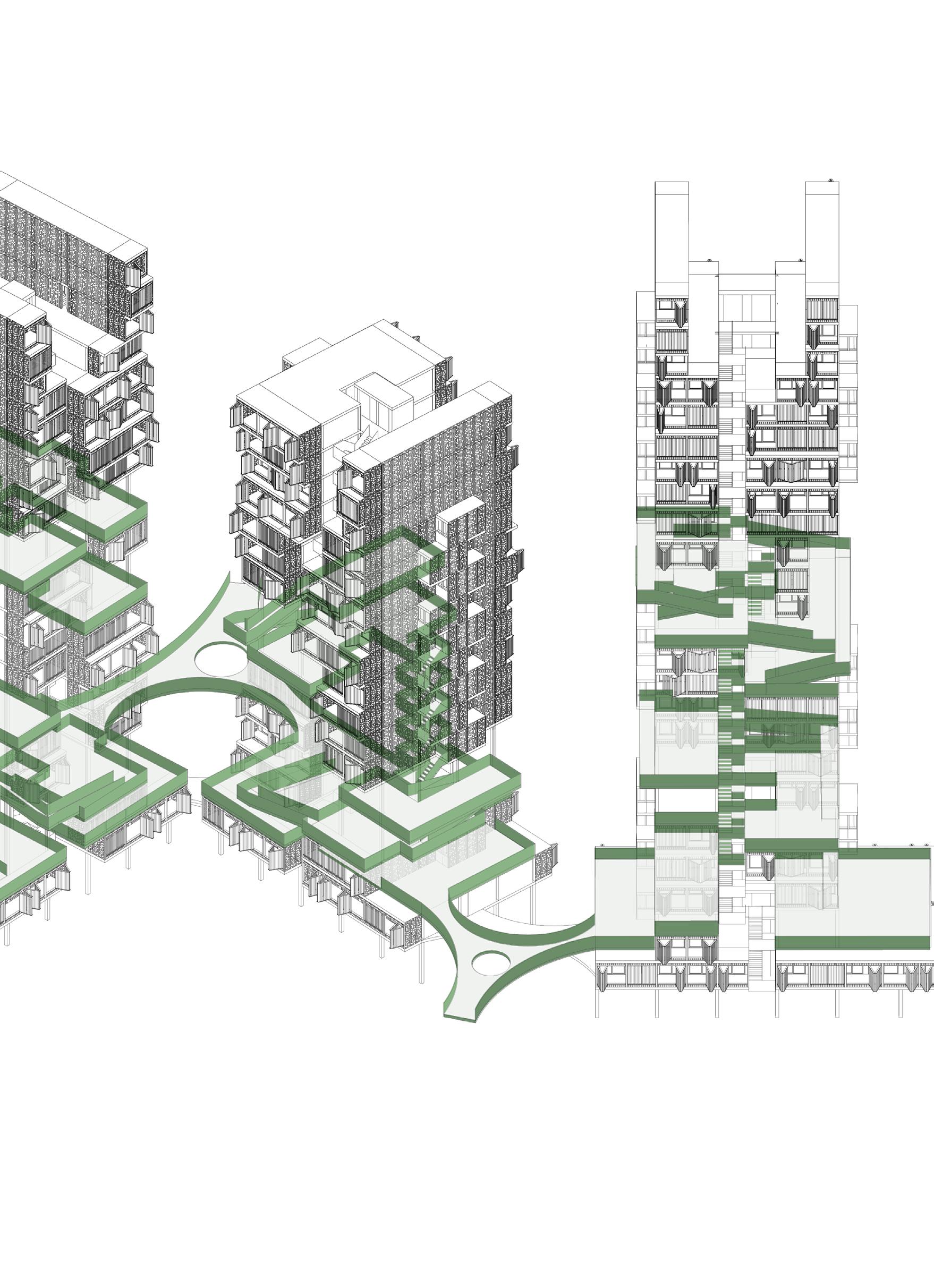 The project proposes a series of residential towers composed of three distinct types of dwellings, scaled to the unit of the shipping container and stacked to produce volumetric complexity. These apartments intertwine with vertical gardens and terraces that are publicly accessible yet do not compromise the residents’ privacy. Private/individual, quasi-external terraces on the east and west façades respond to the sunrise and sunset. The new housing is linked to an idea for the restoration of the historic architecture of the city, sequentially accommodating neighbourhood communities as their building are repaired. Afterwards the project continues as a major new district of Colón.