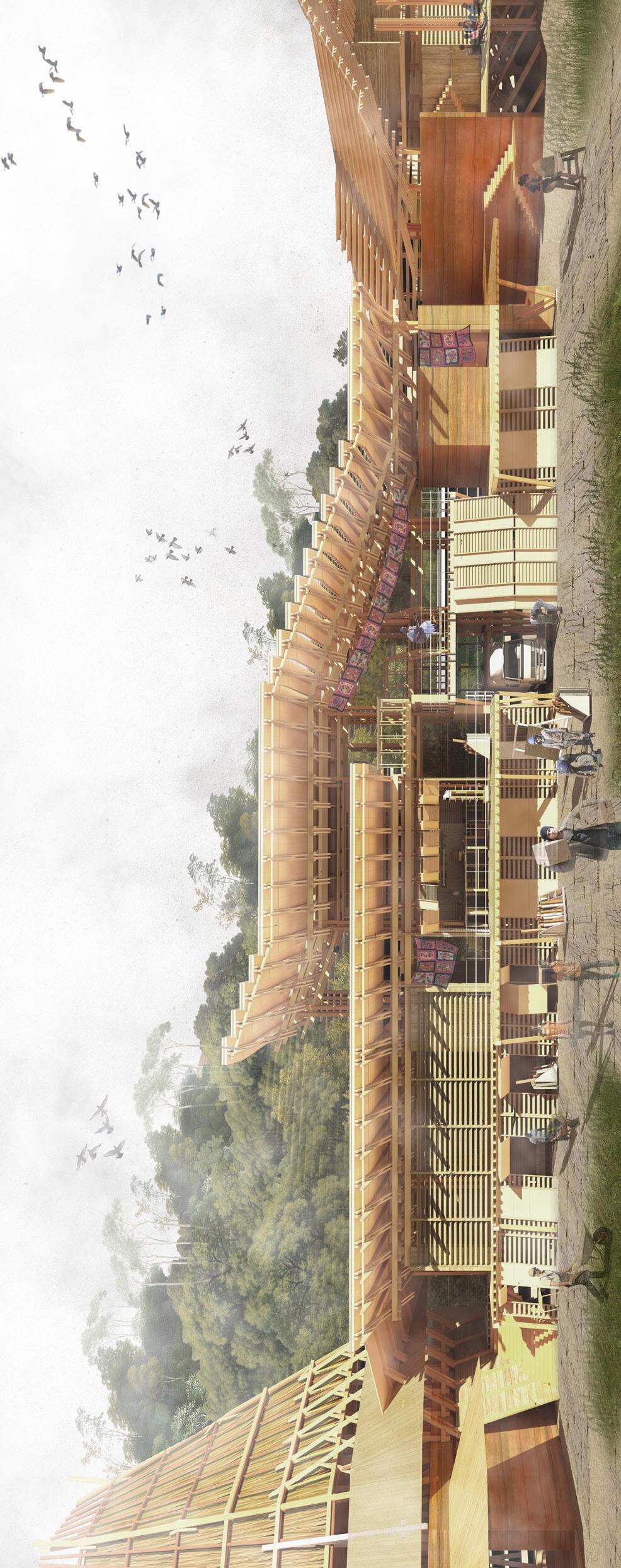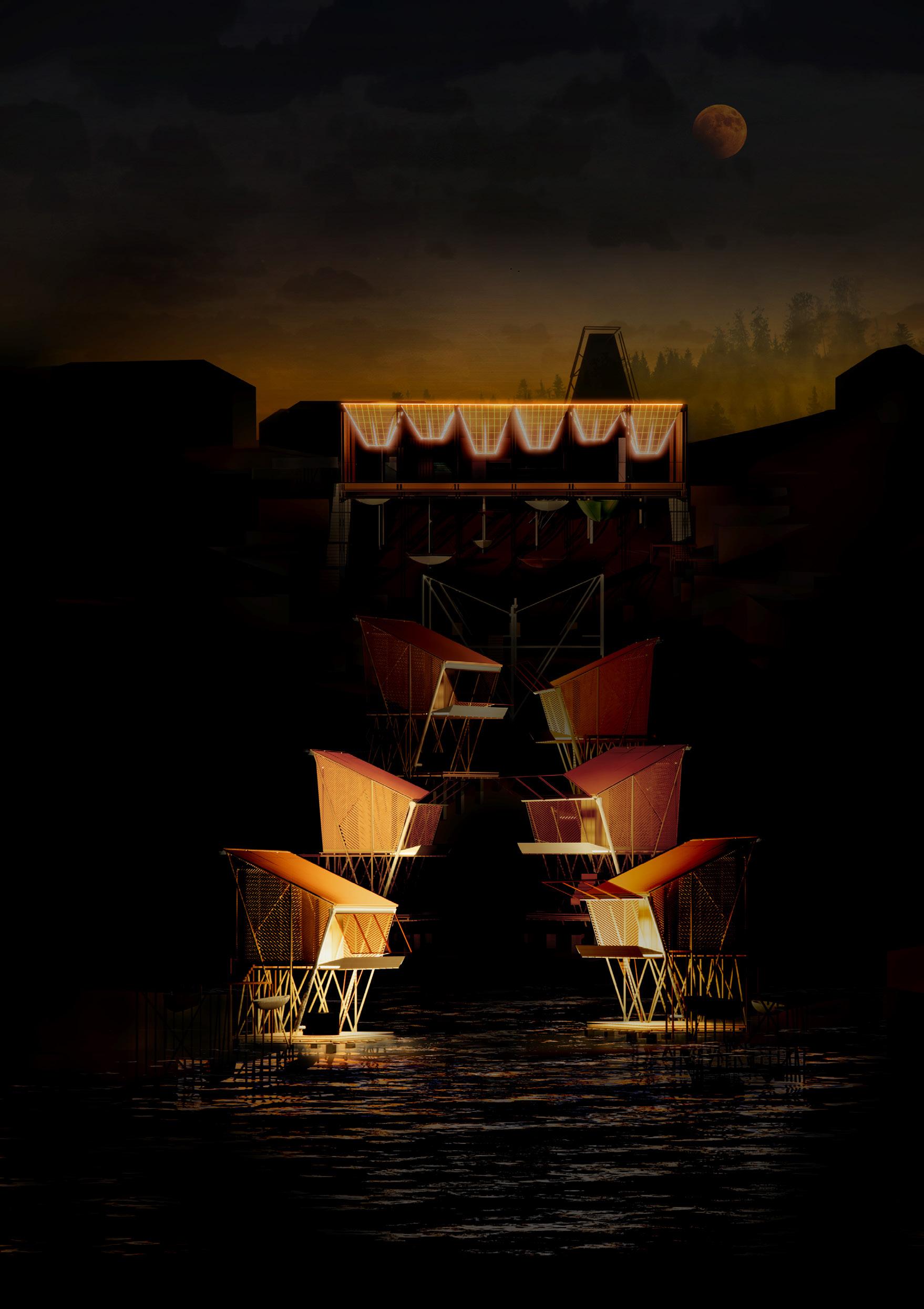 Memory of Guna Yala is situated in the future above the flooded site of Gardi Sugdub. Instead of moving back to the mainland, this community is re-housed within a new sequence of floating architectures; from accommodation with fog water collection to community gardens with sea farming, to a fish trade centre, to a heritage museum and coral education centre, to a new parliament and the underwater garden remembering the lost coral island. These spaces are constructed from local building materials including bamboo, sugar cane, reused metal roof panels and canvas.