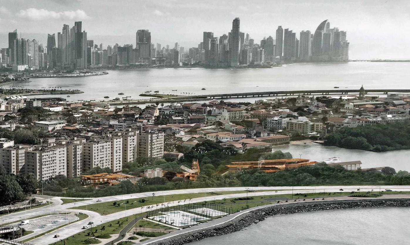 The incorporation of social and urban networks with infrastructural agroeconomies forms the proposal; a new heart of food culture within the ports of Old Panamá City. The programme is envisioned as an expanding kitchen, incorporating the food cycle onto its site through a series of infrastructural and landscaped plazas. The first of these is an open pantry and kitchen, drawing produce from its urban neighbours to respond to food poverty via [re]provision. The second is food distribution and production, using borrowed harvest from the city to [re]configure the urban dining experience: a social and communal dining hall. Finally, a composting and energy plant that recycles urban food waste and rainwater. These outputs [re]form themselves into spaces of food growth and production, creating a new public plaza for the district and completing a food cycle, resulting in a proposal that is entirely self-sufficient. The programme blends openair and sheltered spaces through a series of nested infrastructural ‘vessels’ that connect through purpose-led landscaping. Two large roofs form volumetrically heavy architectural forms while maintaining lightness and communal gathering spaces through integration of market stalls, dining areas, and urban gardens. The nested, scalable programmes, imagined as human-scaled habitats of care, aim to raise awareness of food waste, food recycling and food provision. They revitalise the heart of food culture by creating spaces that hope to foster conversation, friendship, and autonomy; proposing the sharing of food as a tool to enhance Panamá’s identity as a crossroads of culture, ecology, and society.