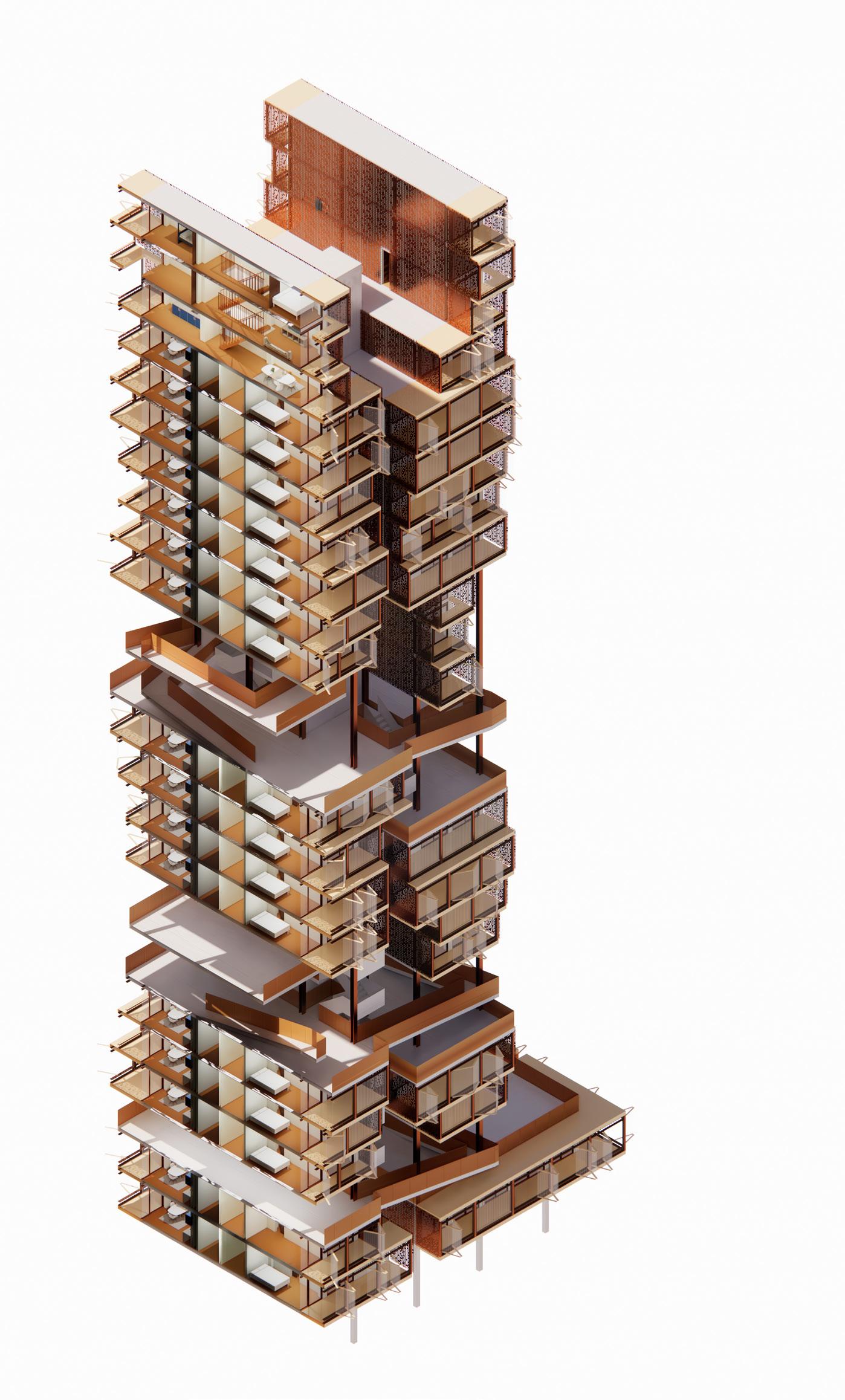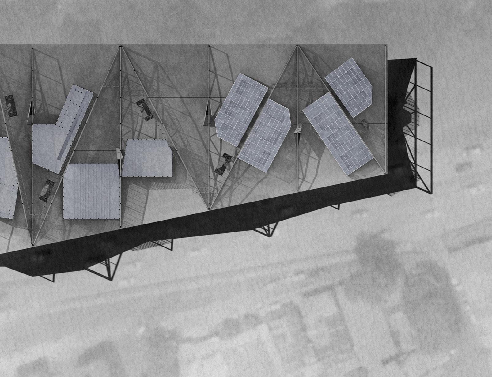 A translucent polycarbonate folding screen provides the occupants with an operable façade, with the added benefit of providing light to the surrounding park area at night. The geometric lattice structure allows swift construction and stack/cross ventilation, with easy access to areas such as service ducts, which will need maintenance throughout the year. The façade will incorporate a mesh support for plant growth, which will help to improve air quality and wildlife habitat.