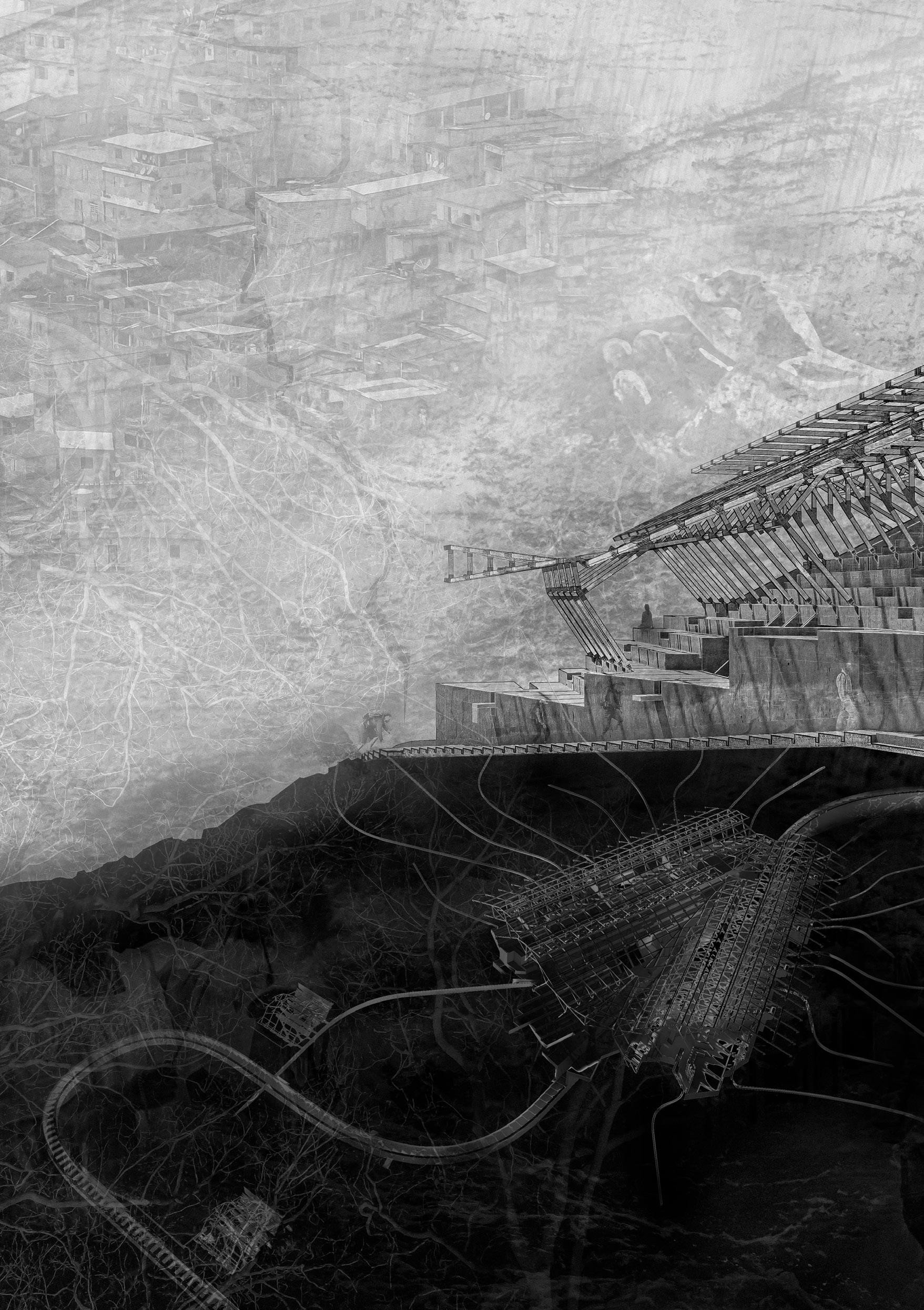 Set within the favela’s abrupt terrain, Carapace attempts to activate the inert valley with a water ladder system that acts as the spine of the project. Integrated as a flood retention system during the monsoon season, the ladder directs the water towards pools for containment, with refuges carefully placed to shelter the homeless and protect precious possessions.