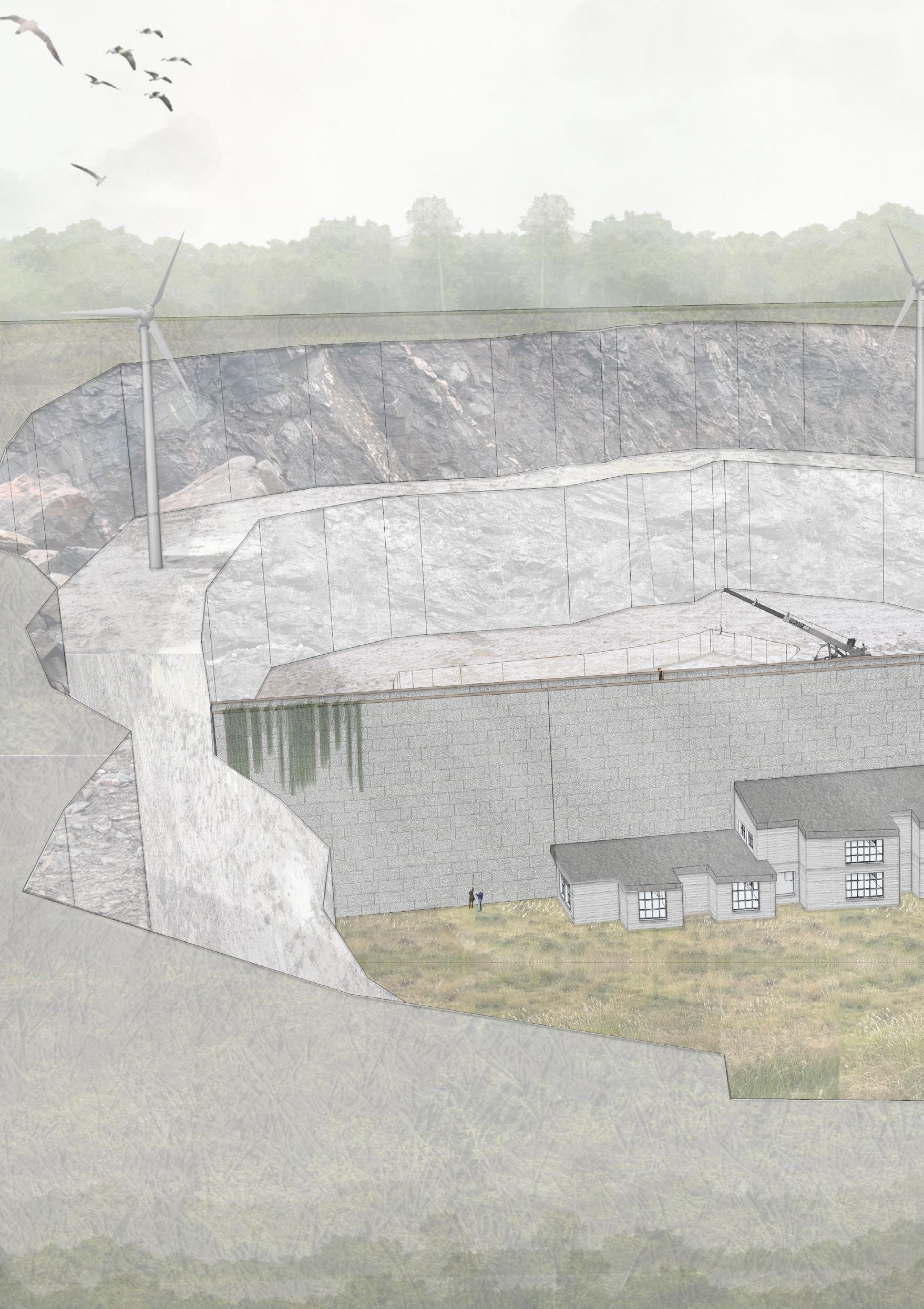 Renovating an abandoned office building on the quarry’s edgewhich emulates the concrete brutalism synonymous with Aberdeen’s vision of modernity following the discovery of North Sea oil - the proposal infiltrates and ‘re-wilds’ the building whilst returning to the site’s vernacular material. Seeking to demonstrate the versatility of granite, it will be utilised in different manifestations across the site to subconsciously dictate building type and use.