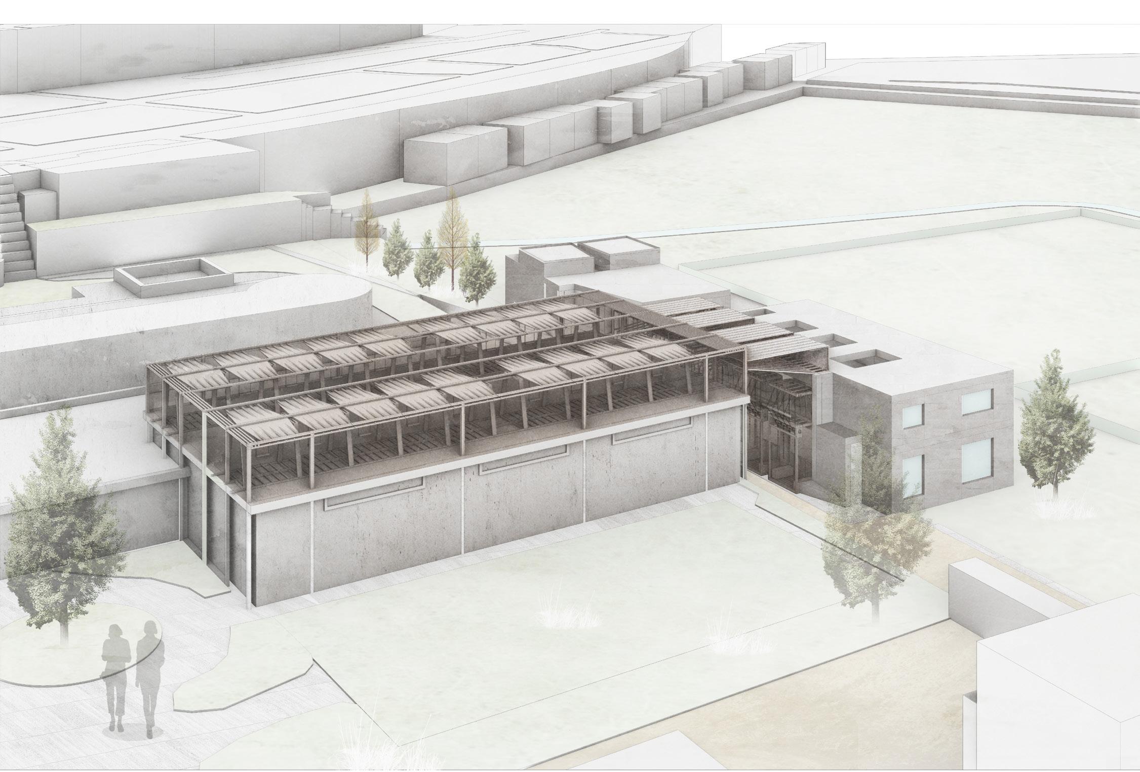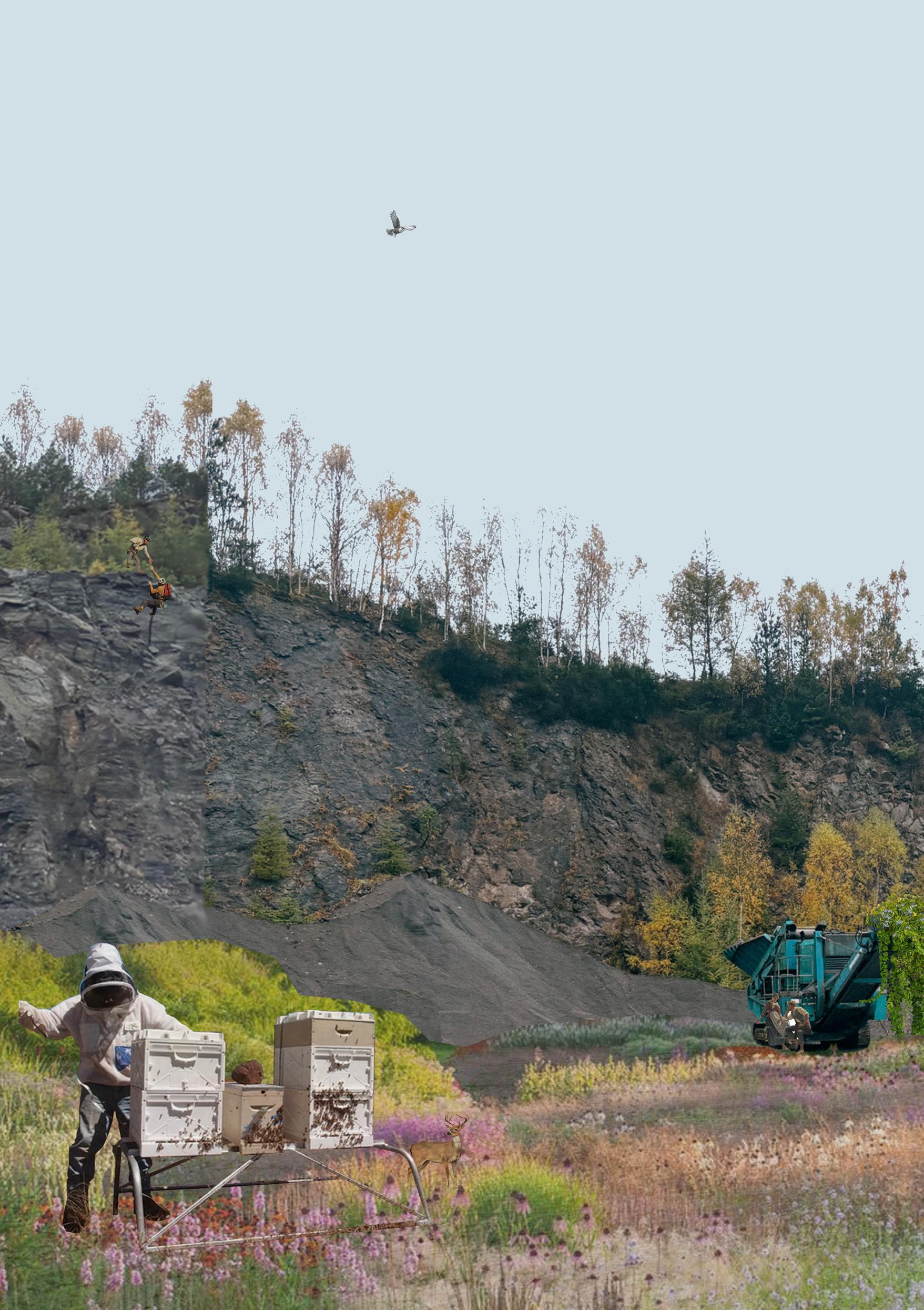 This new type of architectural intervention aims to reintroduce human and non-human figures that have been unsettled and provide them with a secure means of remaining rooted in the city. My thesis culminates in the creation of a sustainable trade school (the school of the future) which allows existing oil and quarry workers to use their current skills to re-skill in sustainable construction - a field which will be essential in the advent of a post-petroleum society. This new school will be constructed by students themselves, and subsequently re-wilded to allow for non-humans’ return to the site.