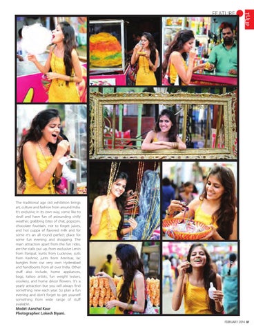 The traditional age old exhibition brings art, culture and fashion from around India. It’s exclusive in its own way, some like to stroll and have fun of astounding chilly weather, grabbing bites of chat, popcorn, chocolate fountain, not to forget juices, and hot cuppa of flavored milk and for some it’s an all round perfect place for some fun evening and shopping. The main attraction apart from the fun rides, are the stalls put up, from exclusive Lenin from Panipat, kurtis from Lucknow, suits from Kashmir, juttis from Amritsar, lac bangles from our very own Hyderabad and handlooms from all over India. Other stuff also include, home appliances, bags, tattoo artists, fun weight testers, crockery, and home décor flowers. It’s a yearly attraction but you will always find something new each year. So plan a fun evening and don’t forget to get yourself something from wide range of stuff available. Model: Aanchal Kaur Photographer: Lokesh Biyani. FEBRUARY, 2014 51
