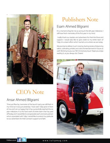 Publishers Note Esam Ahmed Bilgrami It’s a moment of joy for me as we touch the 6th year milestone. I still have fresh memories of the first year in my mind. I really thank our readers and advertisers for their kind love and support. I would also like to give credit to my entire team of Tulip; it is a team effort which has led us to where we are today. We promise to deliver much more by sharing stories of deserving talent, cultivating articles and a lot of entertainment in future as well. We bring to you our ‘6th Anniversary Issue’. Hope you enjoy reading it, as you always do. Cheers!