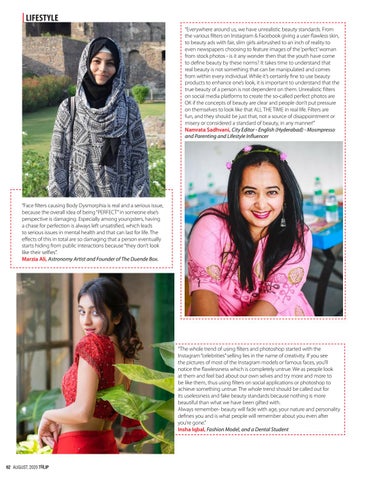 | LIFESTYLE “Everywhere around us, we have unrealistic beauty standards. From the various filters on Instagram & Facebook giving a user flawless skin, to beauty ads with fair, slim girls airbrushed to an inch of reality to even newspapers choosing to feature images of the ‘perfect’ woman from stock photos - is it any wonder then that the youth have come to define beauty by these norms? It takes time to understand that real beauty is not something that can be manipulated and comes from within every individual. While it’s certainly fine to use beauty products to enhance one’s look, it is important to understand that the true beauty of a person is not dependent on them. Unrealistic filters on social media platforms to create the so-called perfect photos are OK if the concepts of beauty are clear and people don’t put pressure on themselves to look like that ALL THE TIME in real life. Filters are fun, and they should be just that, not a source of disappointment or misery or considered a standard of beauty, in any manner!” Namrata Sadhvani, City Editor - English (Hyderabad) - Mosmpresso and Parenting and Lifestyle Influencer